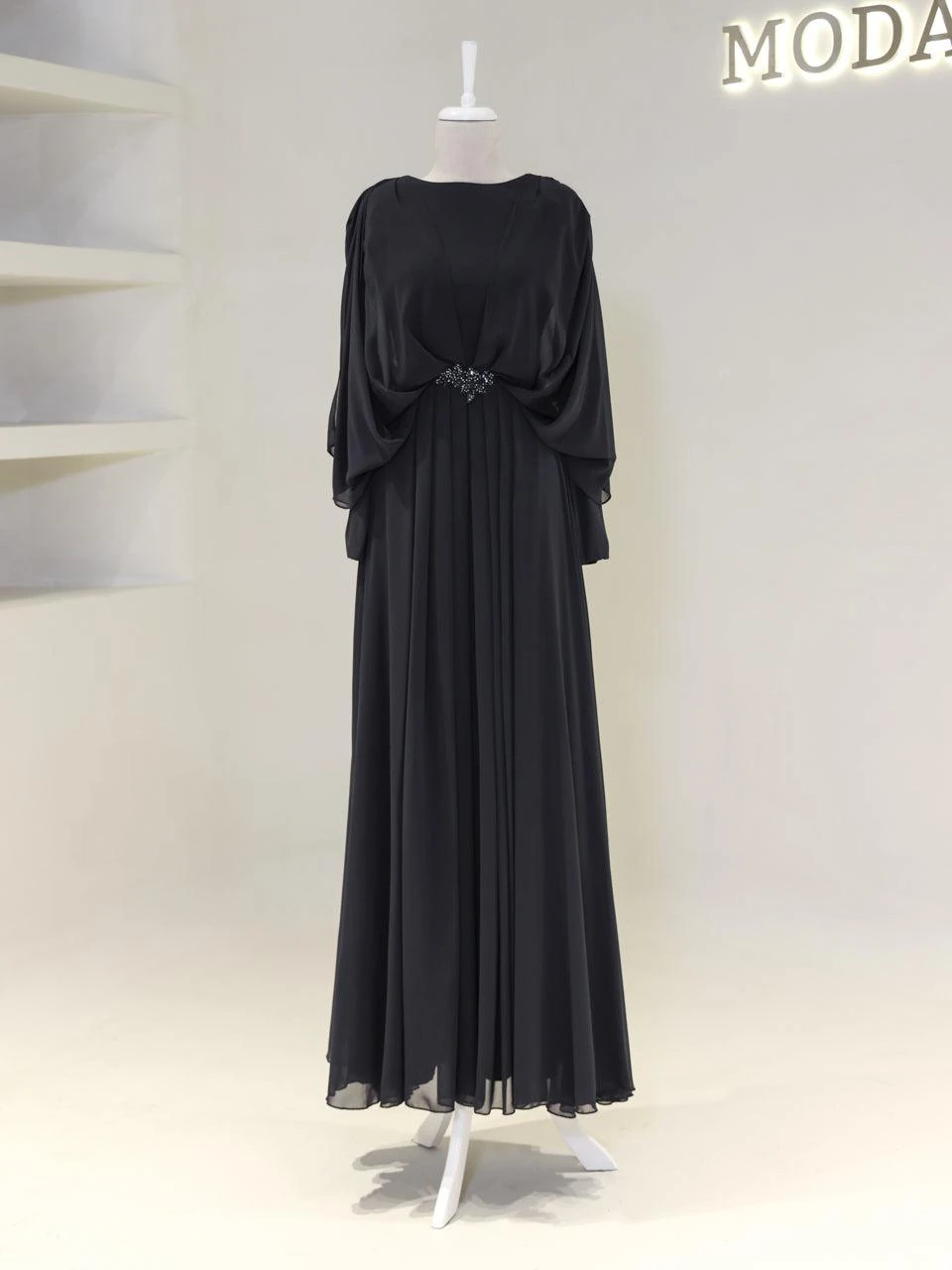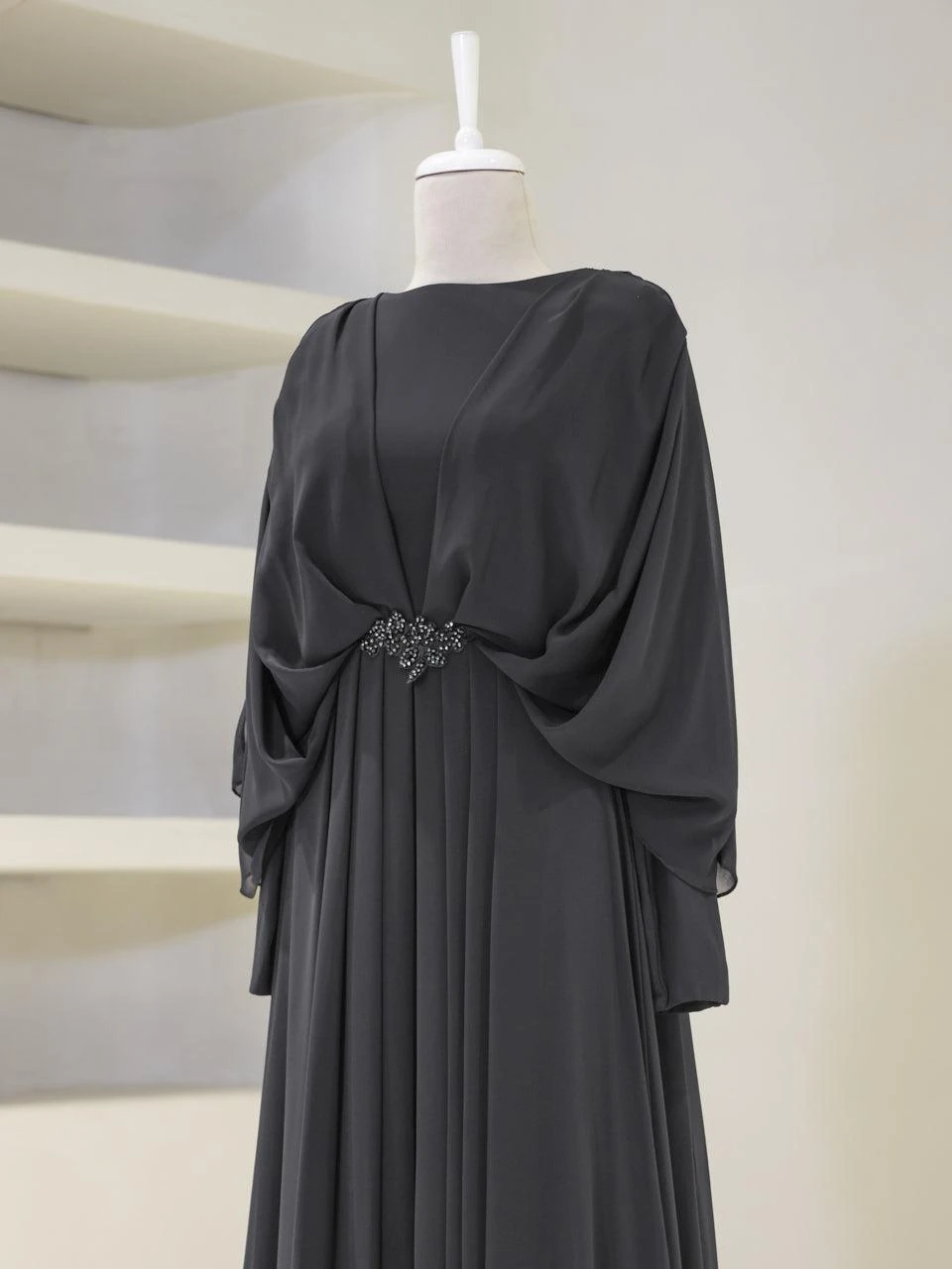 This cape style modest evening dress is crafted from chiffon fabric and features a fitted design. The dress measures 155 cm in length and includes a lining for added comfort. It has a back zipper closure and a cape-like upper section. The skirt is pleated at both the front and back. Please note that due to its fitted design, it is recommended to purchase one size larger than usual.
