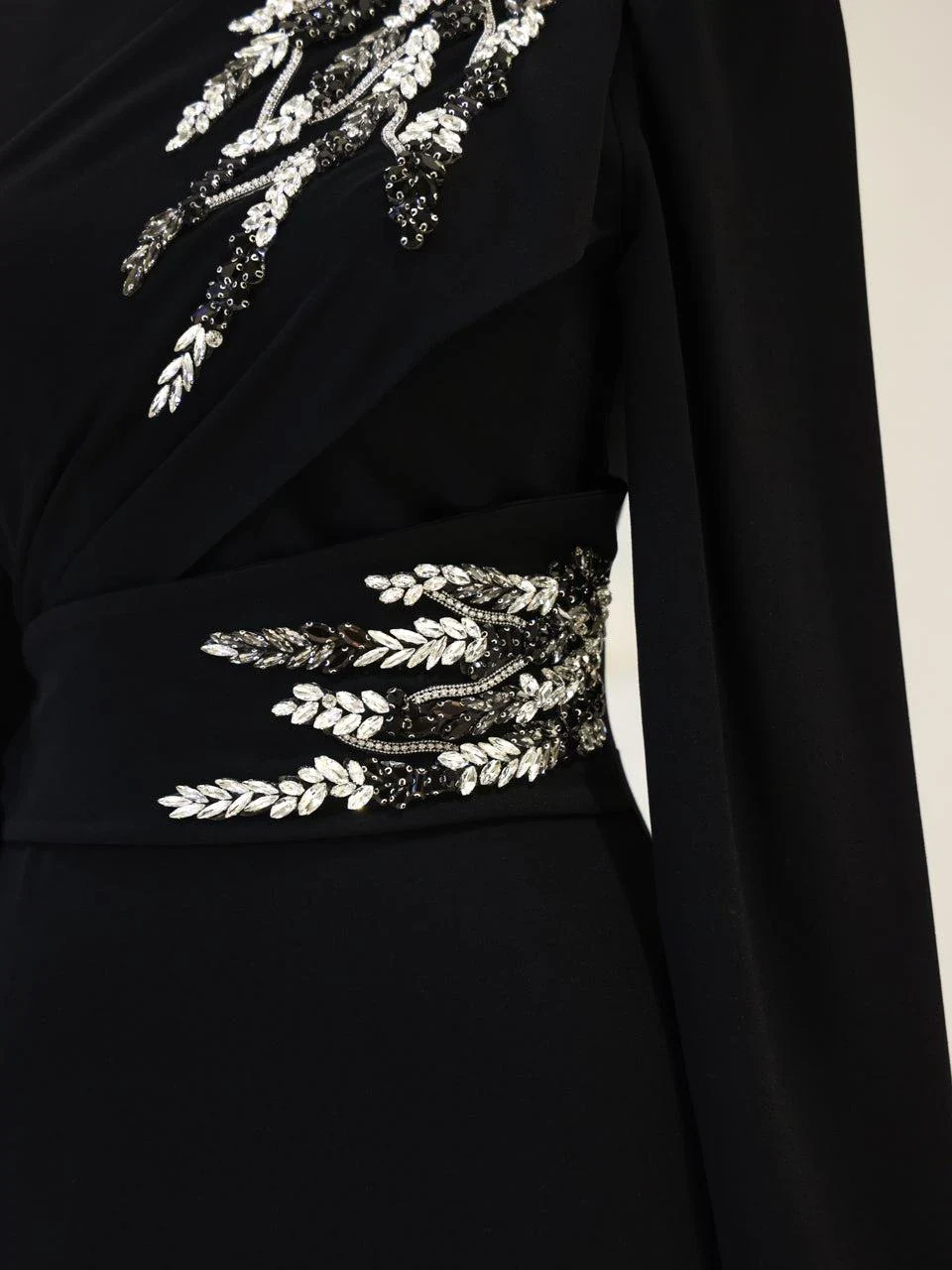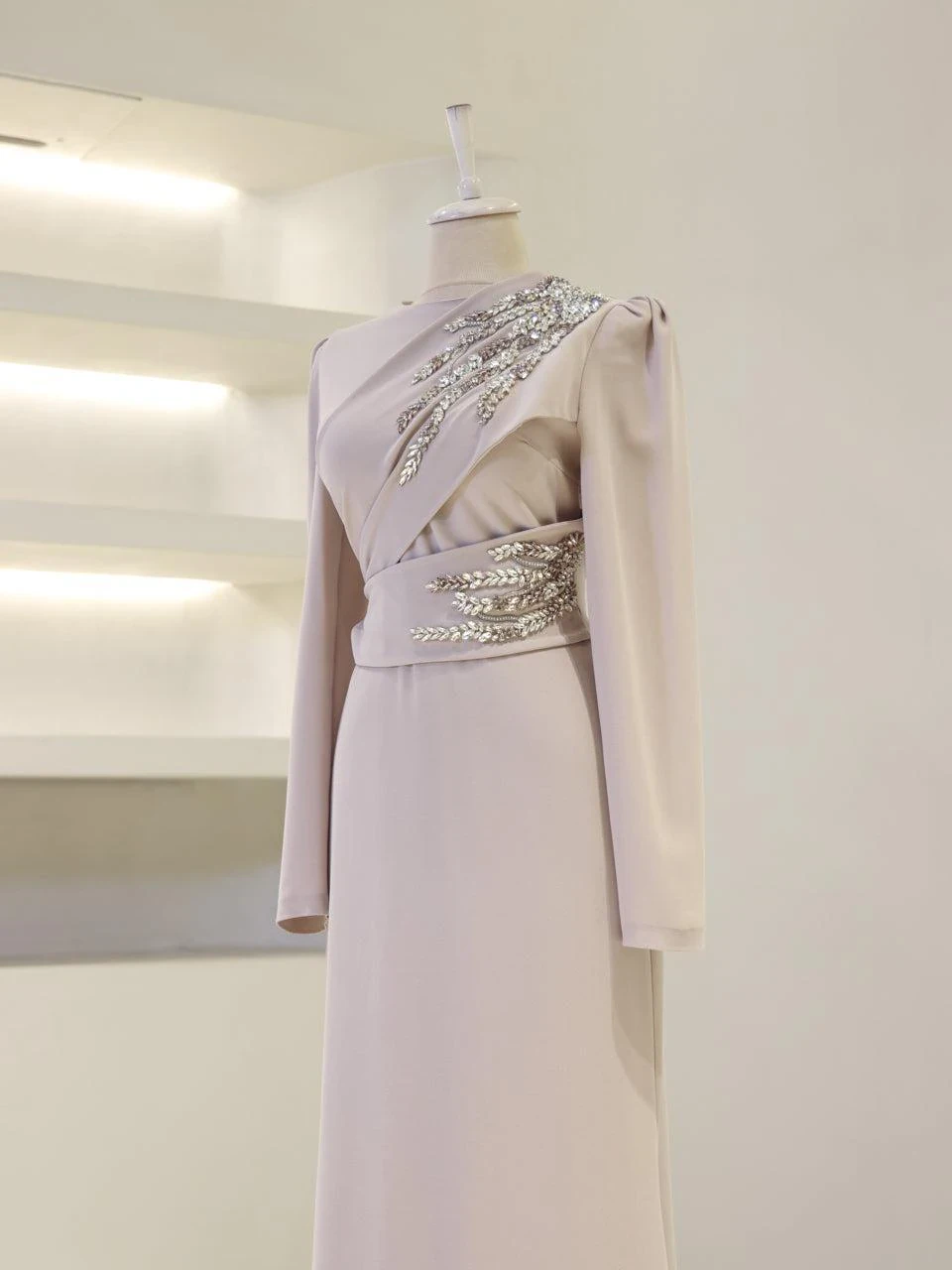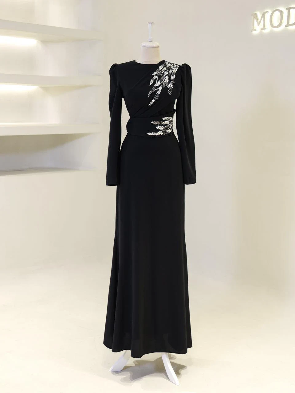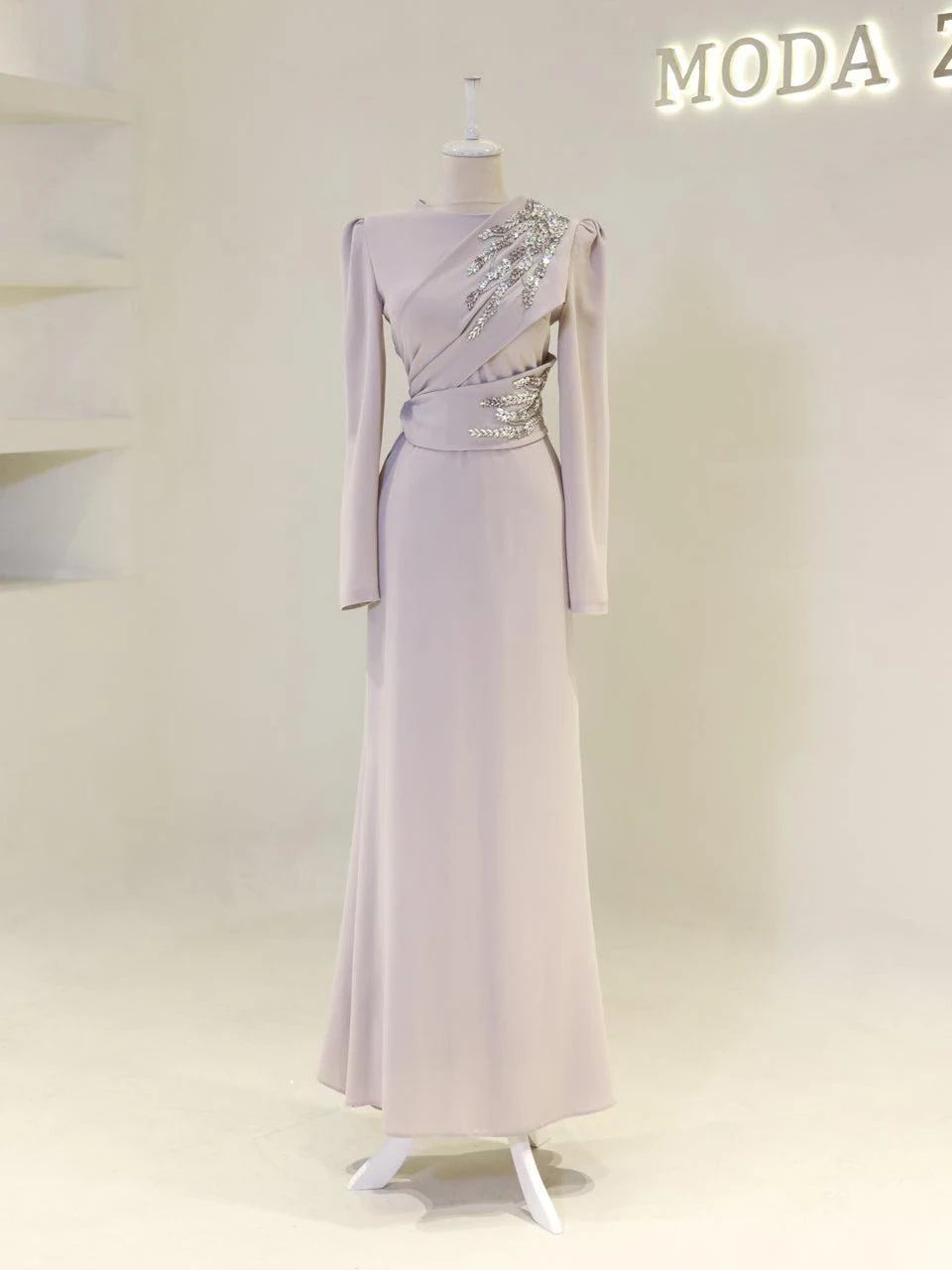 The Celosia Modest Evening Dress is designed to provide a perfect fit with an average length of 160 cm. Made from high-quality crepe fabric, this dress is fully lined for comfort. It features a back zipper closure and includes a built-in chest pad for added support. The embellishments are securely attached, and the dress is styled with a flare skirt for a classic look.