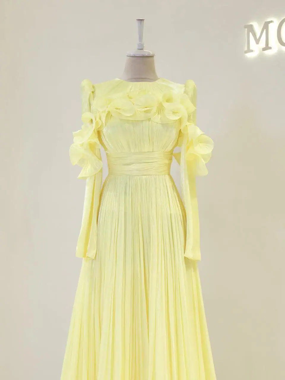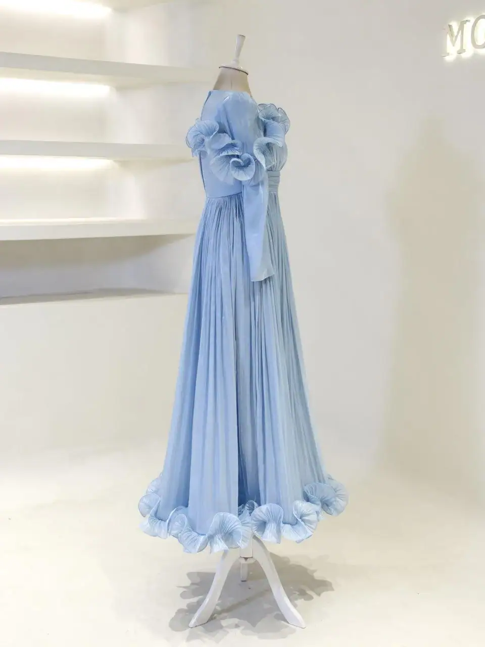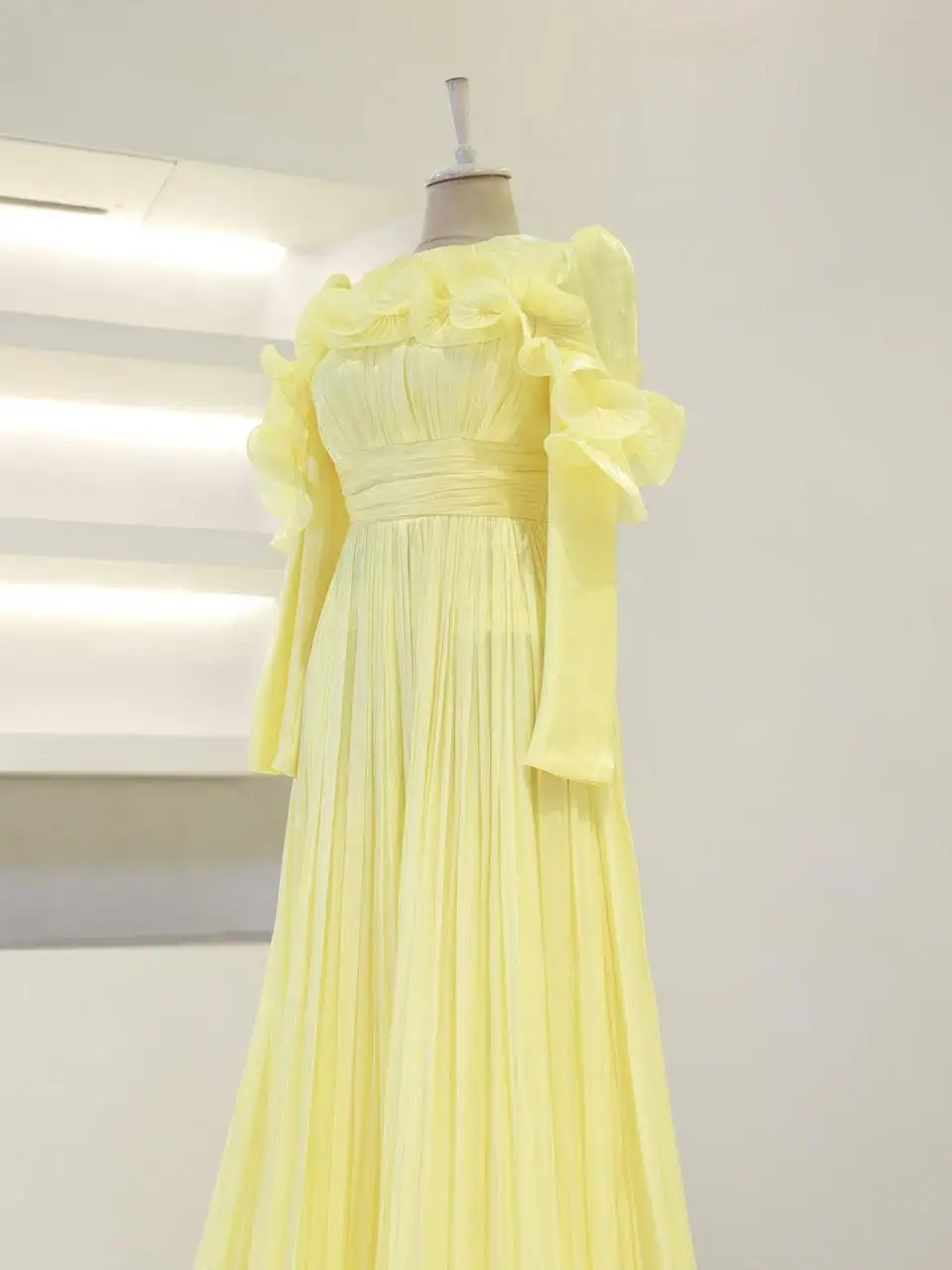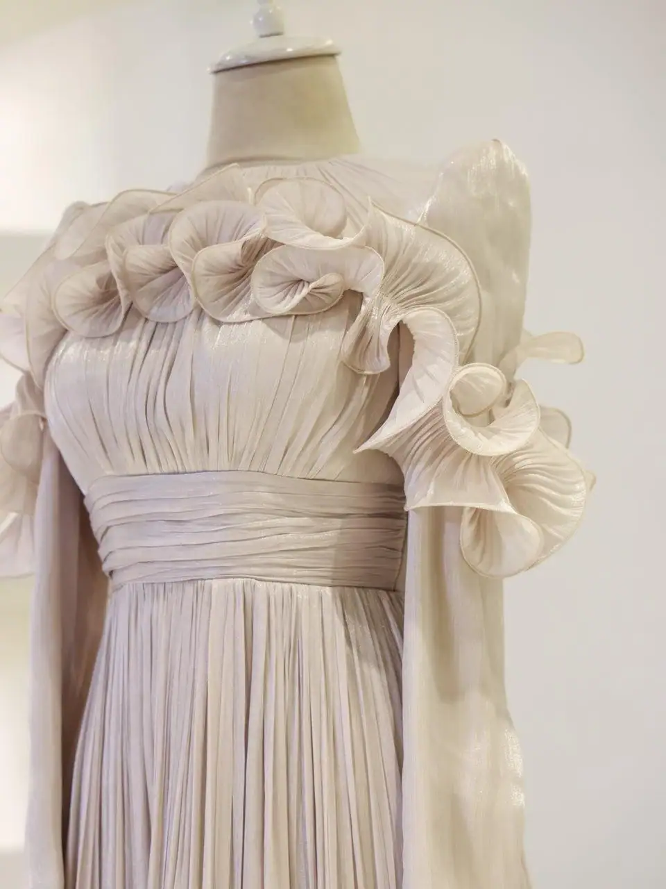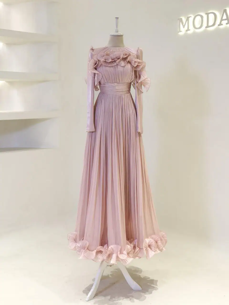 The Charpin Modest Evening Dress is crafted from orchid fabric and measures 150 cm in length. This dress offers a true-to-size fit and includes a built-in chest pad for added comfort. It features a pleated skirt design and is fully lined, ensuring a smooth silhouette. The dress is secured with a zipper at the back.
