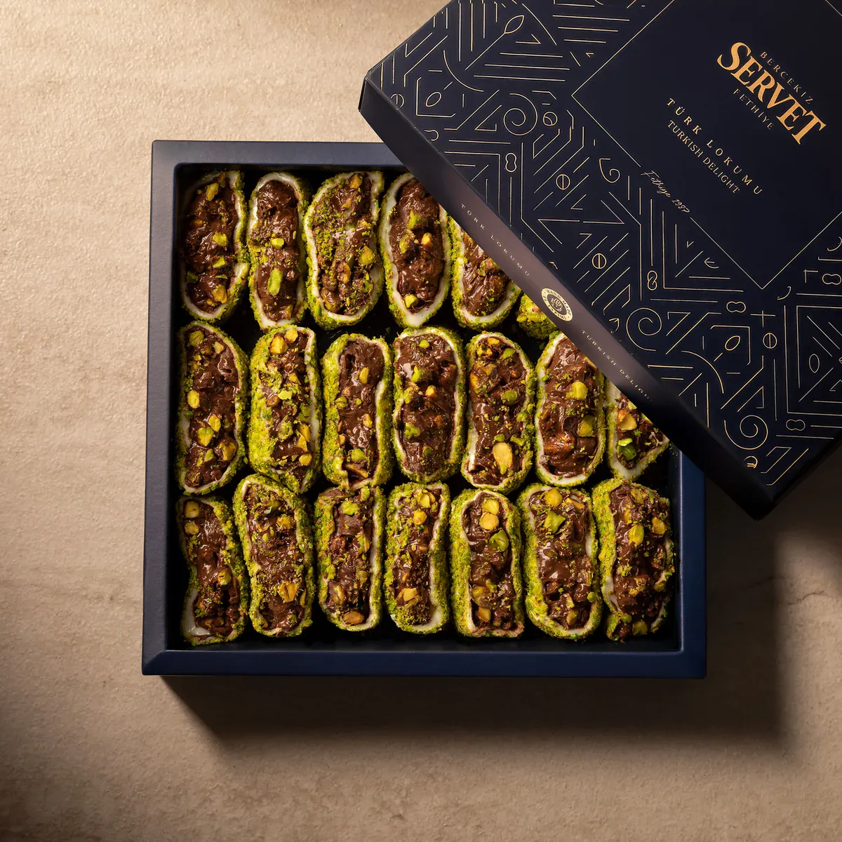 Çikolatalı Antep Fıstıklı Sarma Lokum 1250g is a Turkish confectionery product. It is freshly produced and packaged by Servet, with a net weight of 1250 grams.