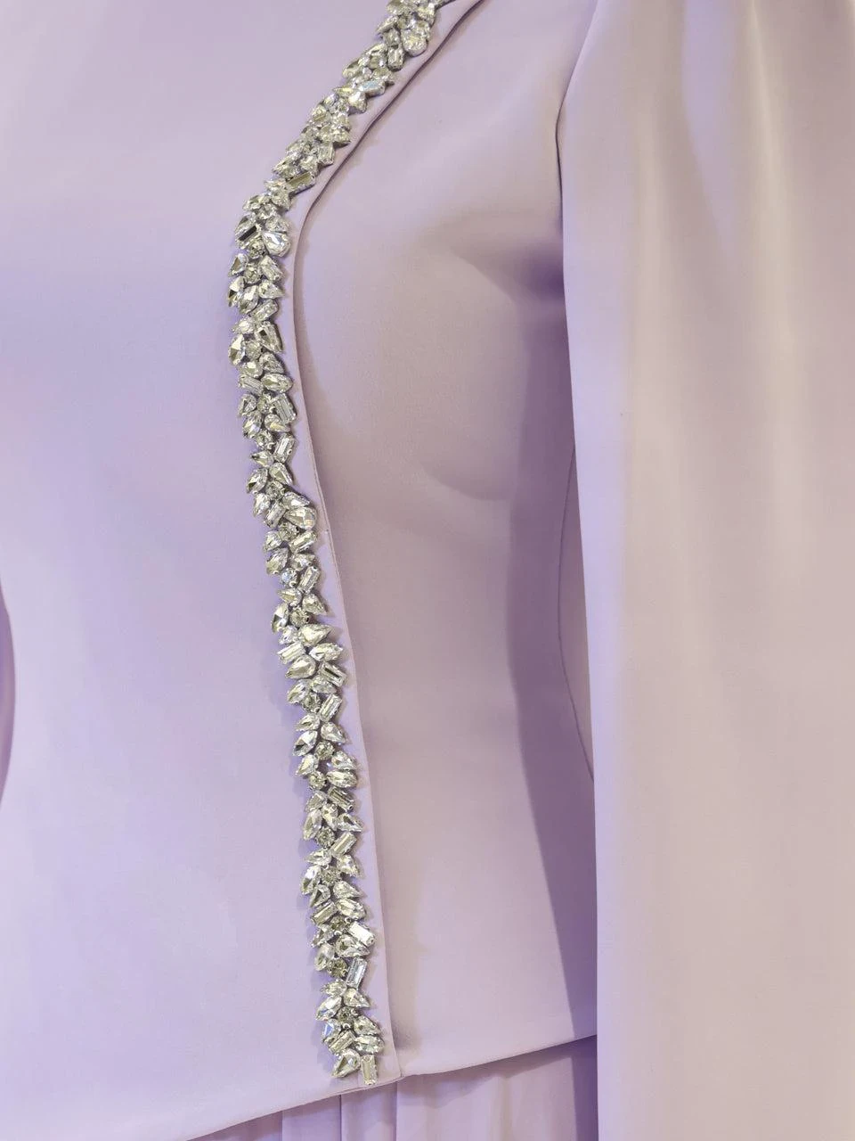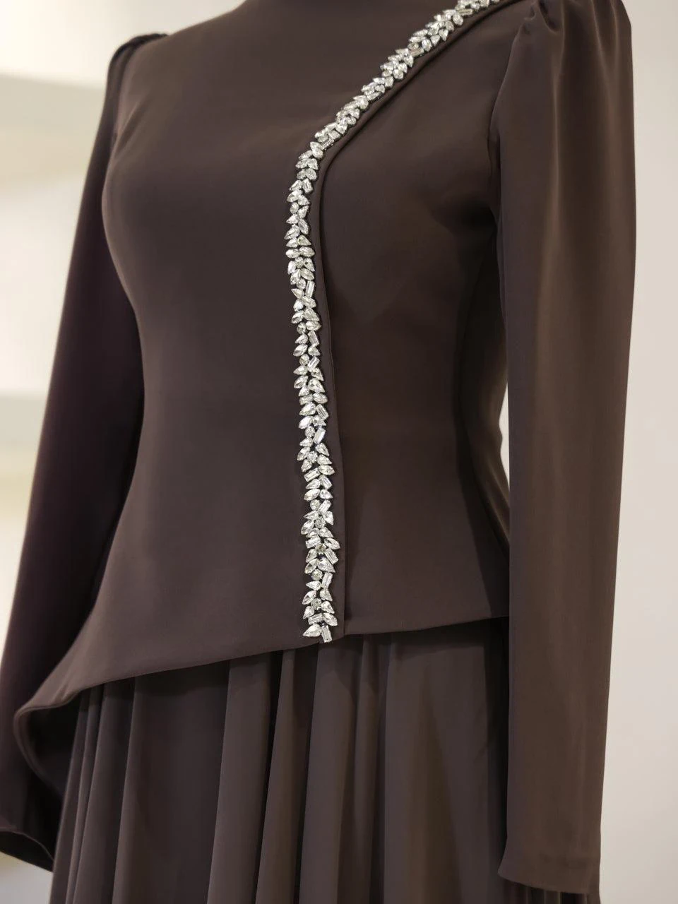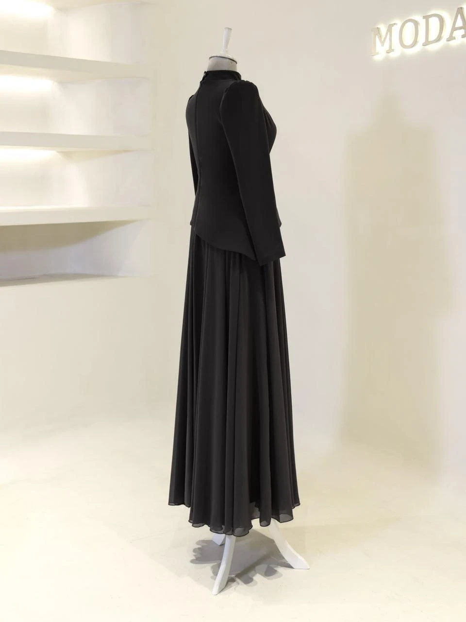 The Chris Modest Evening Dress offers a sophisticated look with its full-length design, measuring approximately 160 cm. The dress combines a chiffon lower section with a crepe upper section, providing a stylish and comfortable fit. It is fully lined and includes a back zipper for easy wear. The dress is equipped with a built-in bust pad and features adhesive embellishments for added detail. Its flared skirt design adds a touch of elegance to any formal occasion.