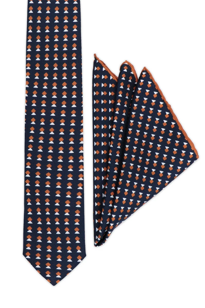 The "Tarçın Desenli İpek Kravat Takımı" is a 100% silk tie made in Bursa, Turkey. It features a soft texture and vibrant colors with elegant patterns suitable for both daily wear and special occasions.