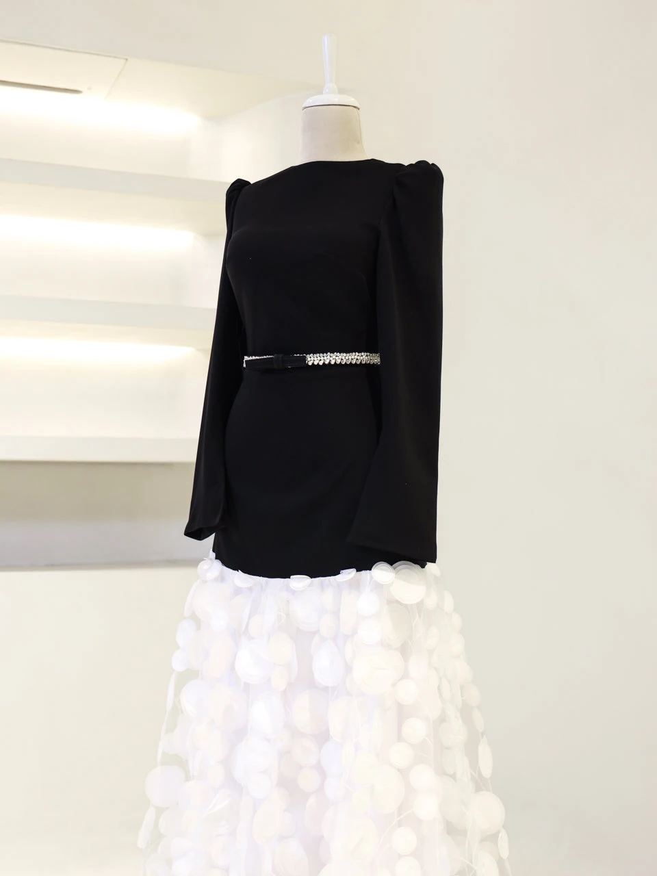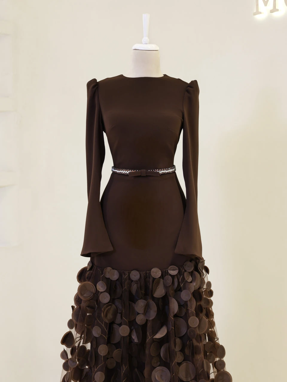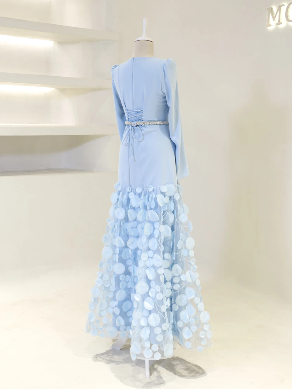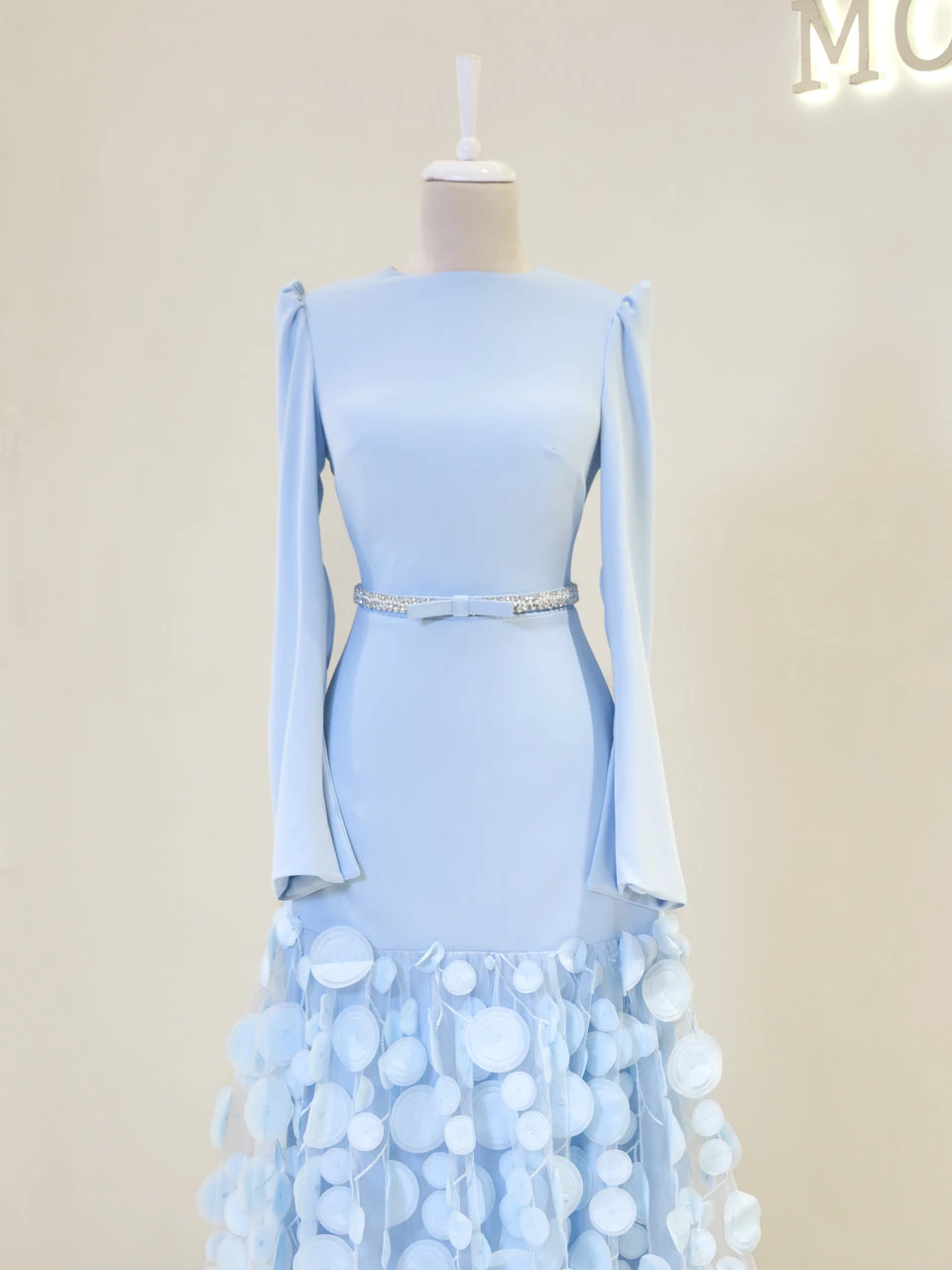 The Clarin Modest Evening Dress is designed with precision to offer a perfect fit. It measures 155 cm in length and features a crepe fabric top and a tulle skirt. The dress is equipped with a back zipper and tie for secure fastening. It includes a built-in bust pad and is fully lined for comfort. The embellishments are securely attached, and the dress has a mermaid skirt form.