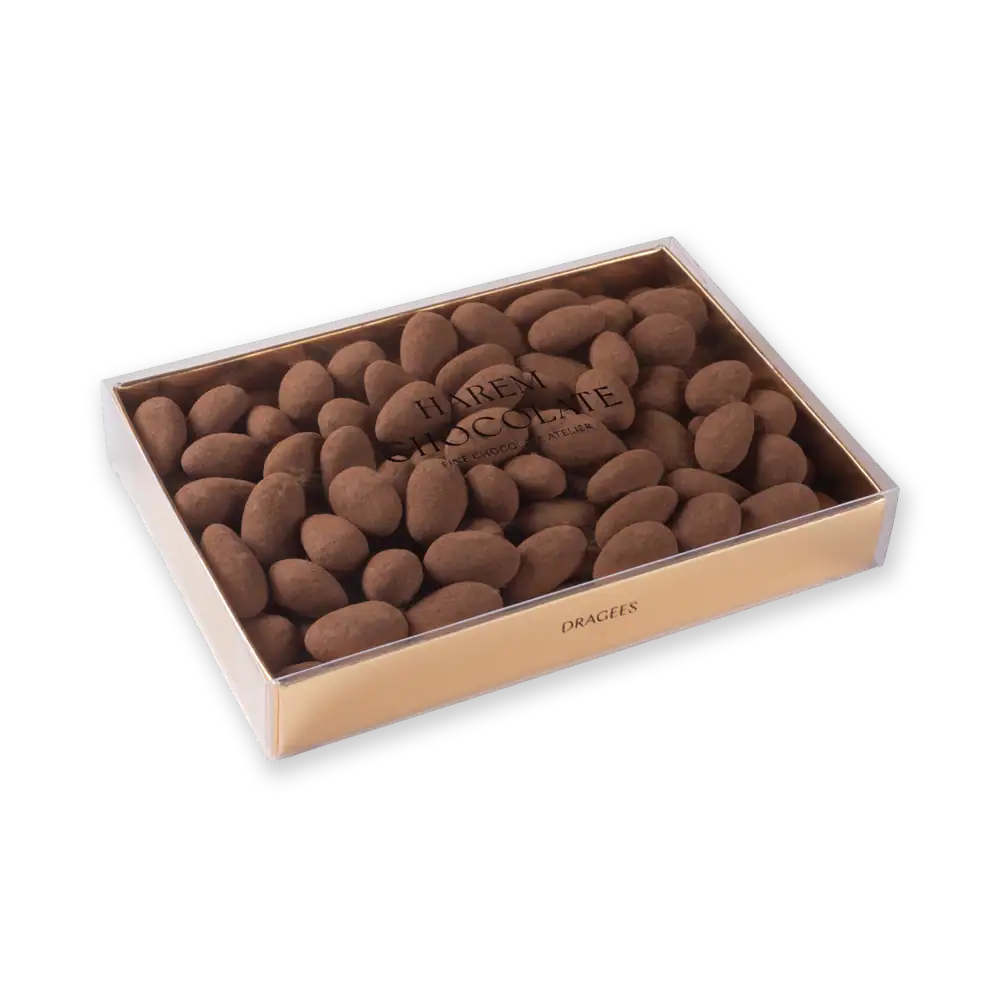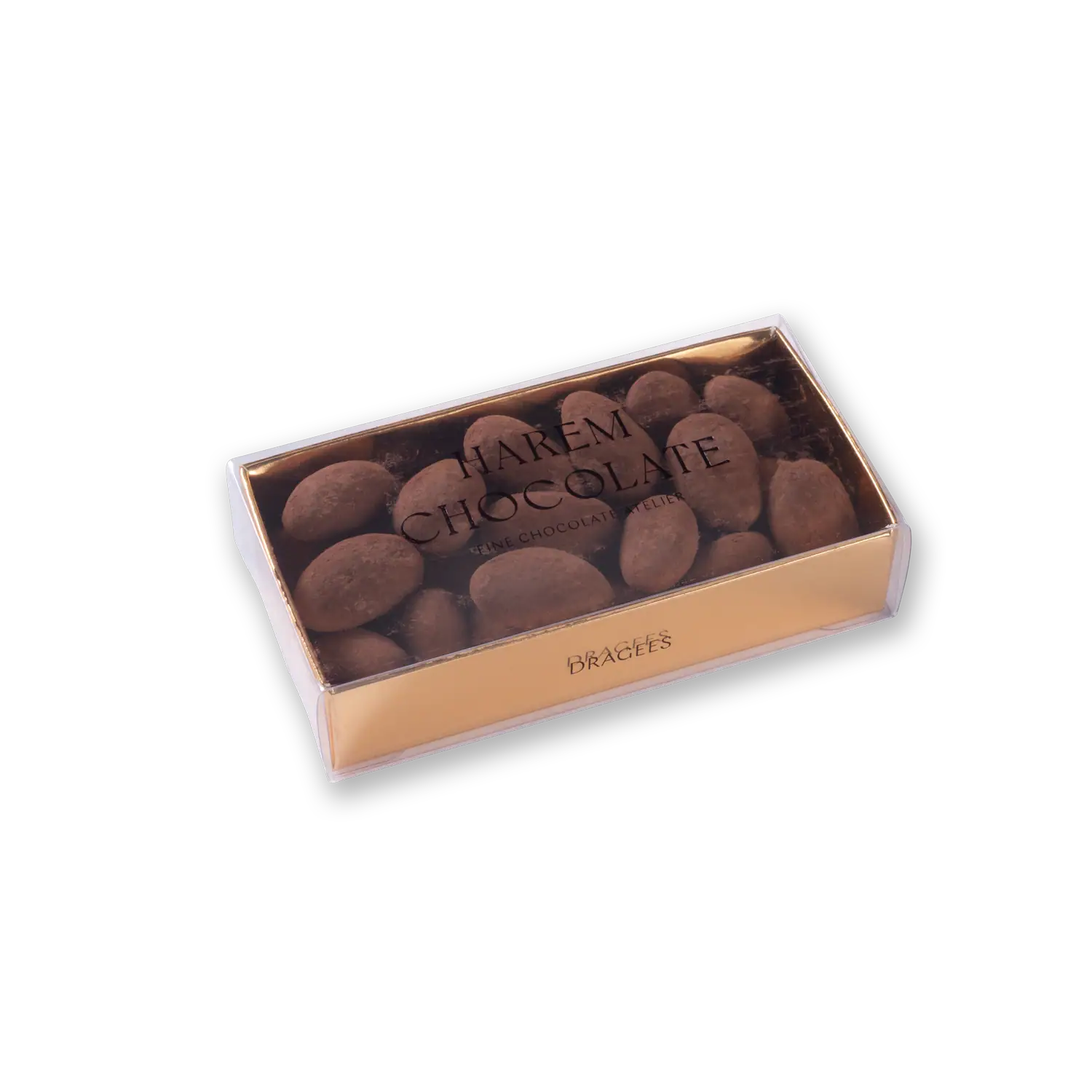 Cocoa Almond Dragee presents a refined combination of chocolate-covered almonds elegantly dusted with cocoa powder. This treat is among the most popular offerings from Harem Chocolate. Enjoy the full flavor of these chocolate-coated, cocoa-dusted whole almond dragees. Available in weights of 75g, 150g, and 300g.