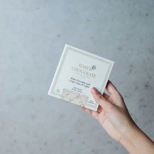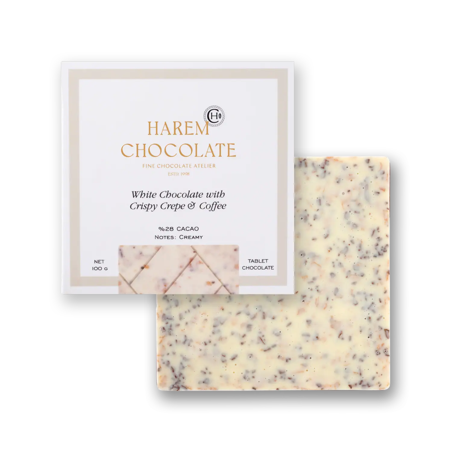 The Coffee & Crepe White Chocolate Bar combines the rich taste of white chocolate with coffee notes, crafted by Harem Chocolate for a delightful experience. This white chocolate bar with coffee and crispy crepe pieces is a unique choice for those seeking a special taste.