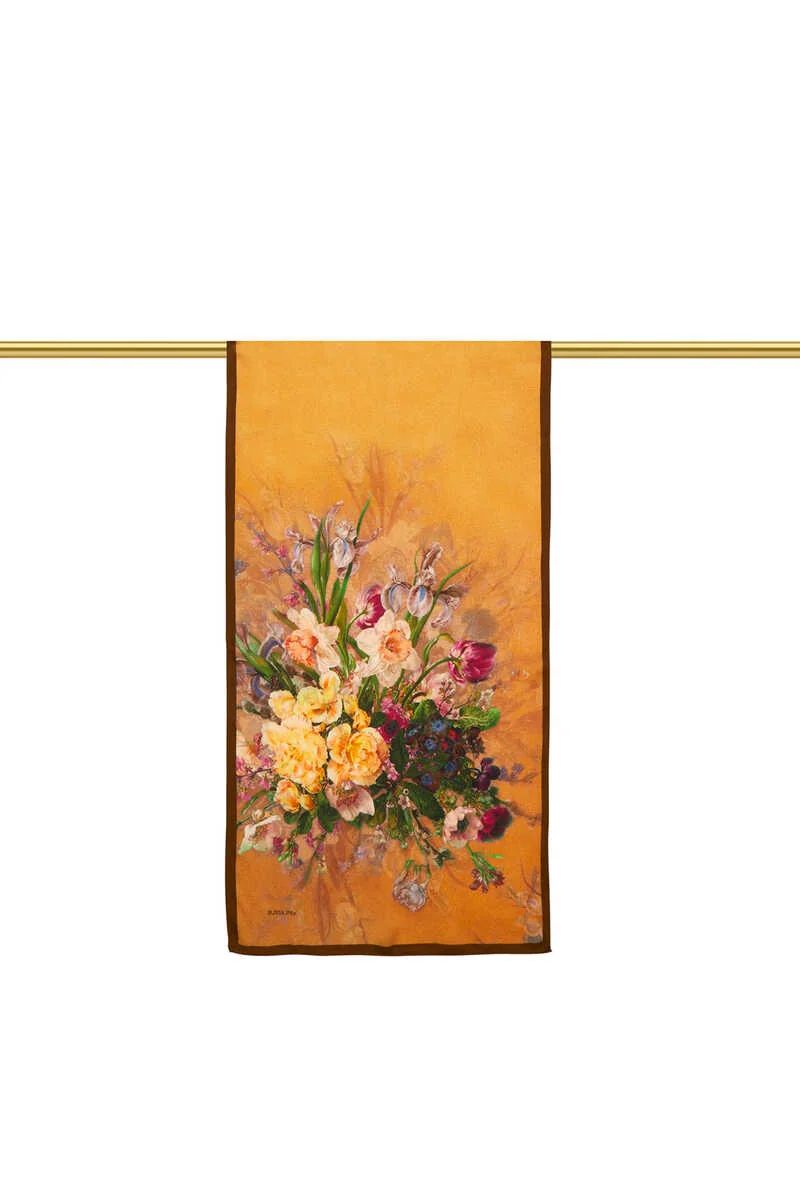 The Coffee Floral Narrow Silk Scarf adds elegance to any outfit. Its eye-catching floral patterns in brown make it suitable for both formal meetings and art gallery visits. Crafted from 100% silk, this scarf offers a luxurious feel and easy styling with its dimensions of 40×150 cm. Originating from Bursa, Turkey, it reflects quality craftsmanship.