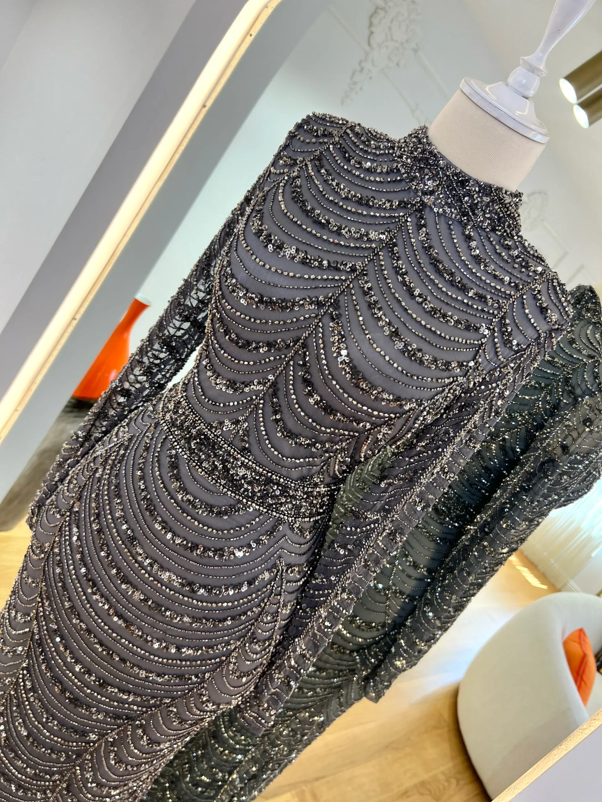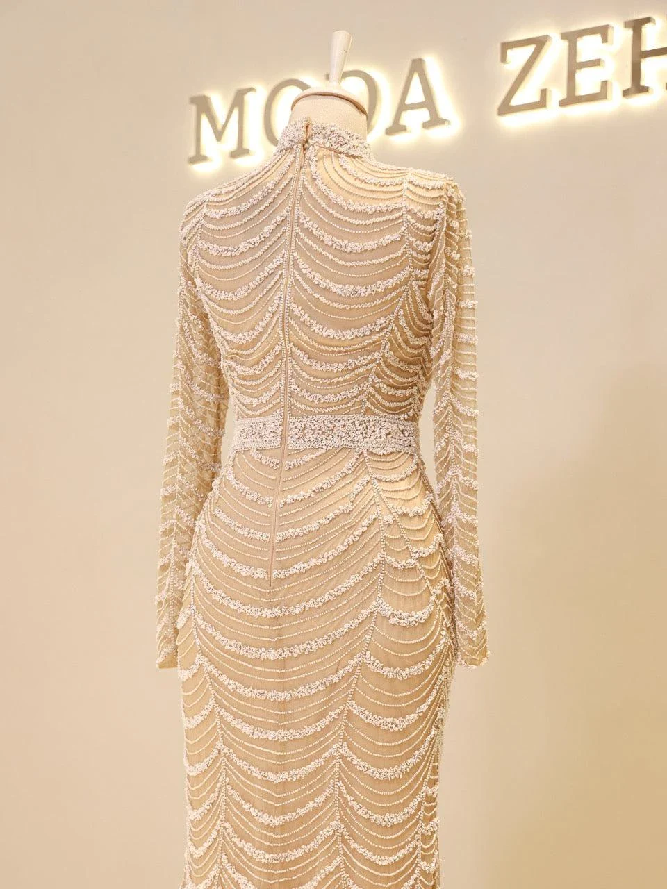 The Couture Aisha Evening Dress is a sophisticated garment designed for special occasions. It features a fitted silhouette with a length of 155 cm and an additional 30 cm train for added elegance. The dress includes a mandarin collar and a back zipper closure. Made from embroidered stretch fabric, it offers a flared skirt shape and is fully lined for comfort. The sleeves are transparent, but can be modified upon request. For further customization details, please contact us via WhatsApp at -.