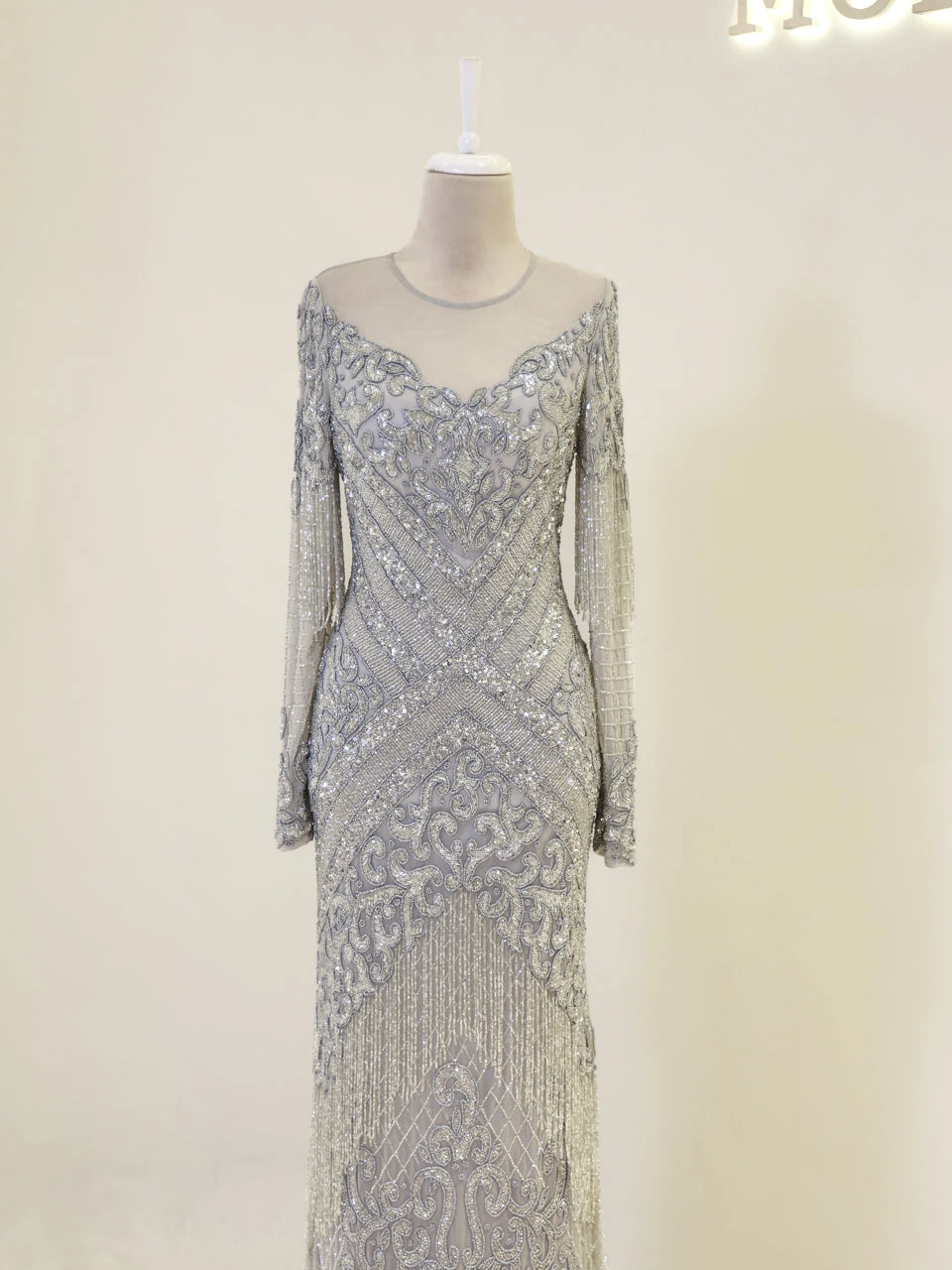 The Couture Alviera Evening Dress features a form-fitting design with an average length of 160 cm. It includes a train and a back zipper for easy wear. The dress is crafted from embroidered stretch fabric and is fully lined. It has a pencil skirt silhouette, with transparent sections on the sleeves, chest, and waist. Note: The transparent sections on the sleeves, chest, and waist can be covered upon request. For more details, please contact our WhatsApp line at +90 553 978 48 86.