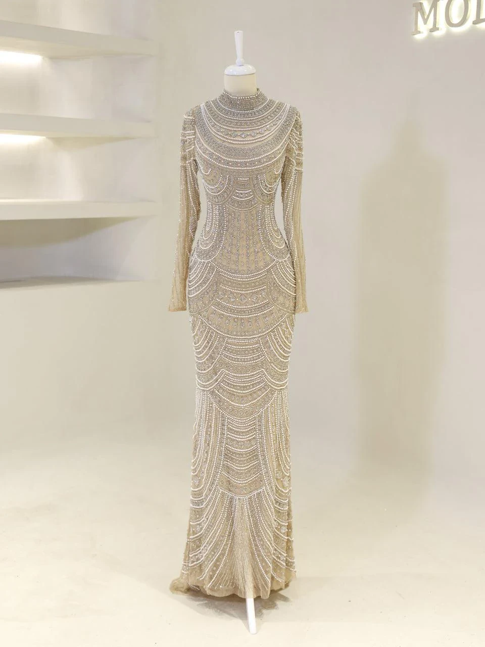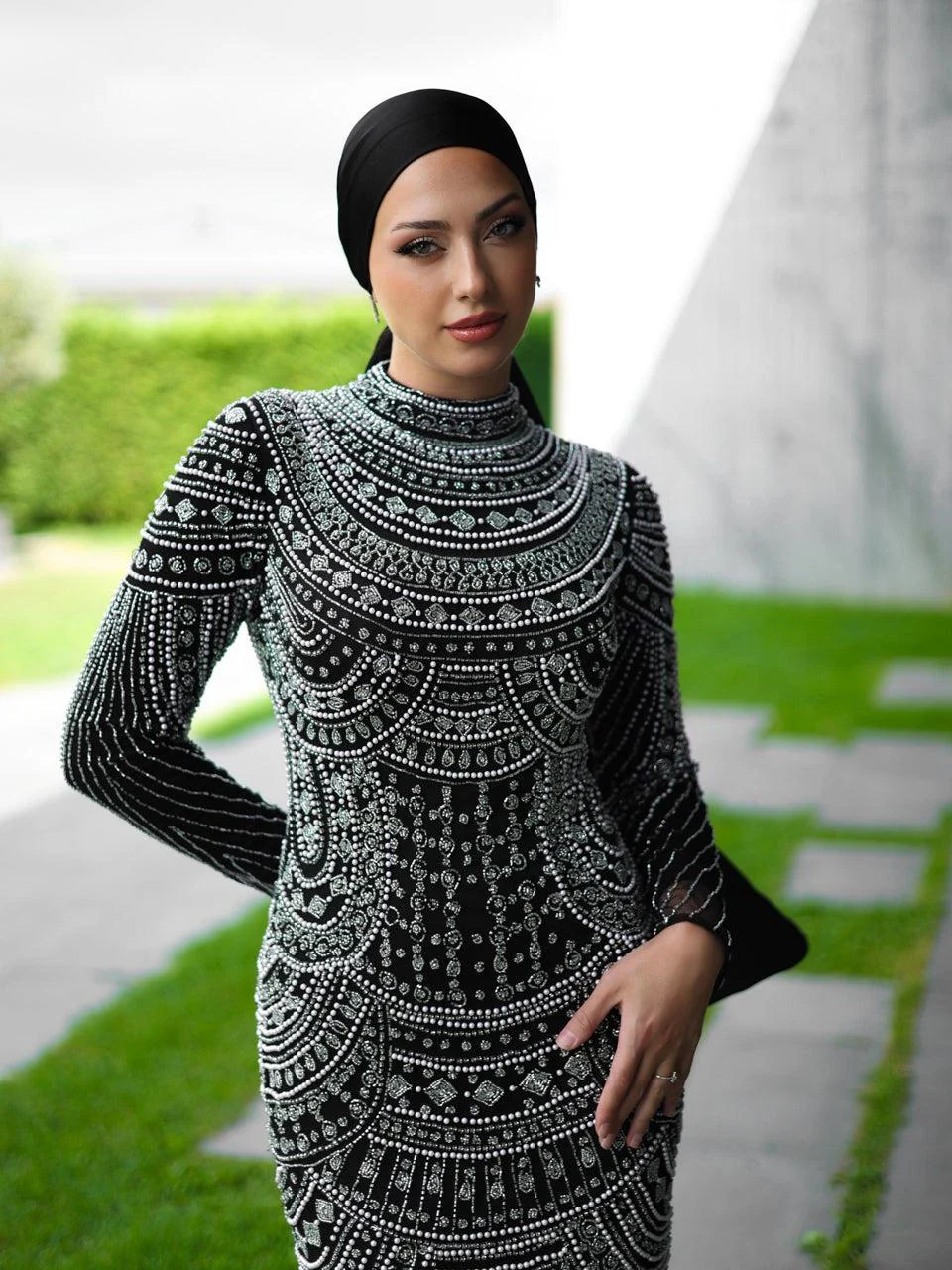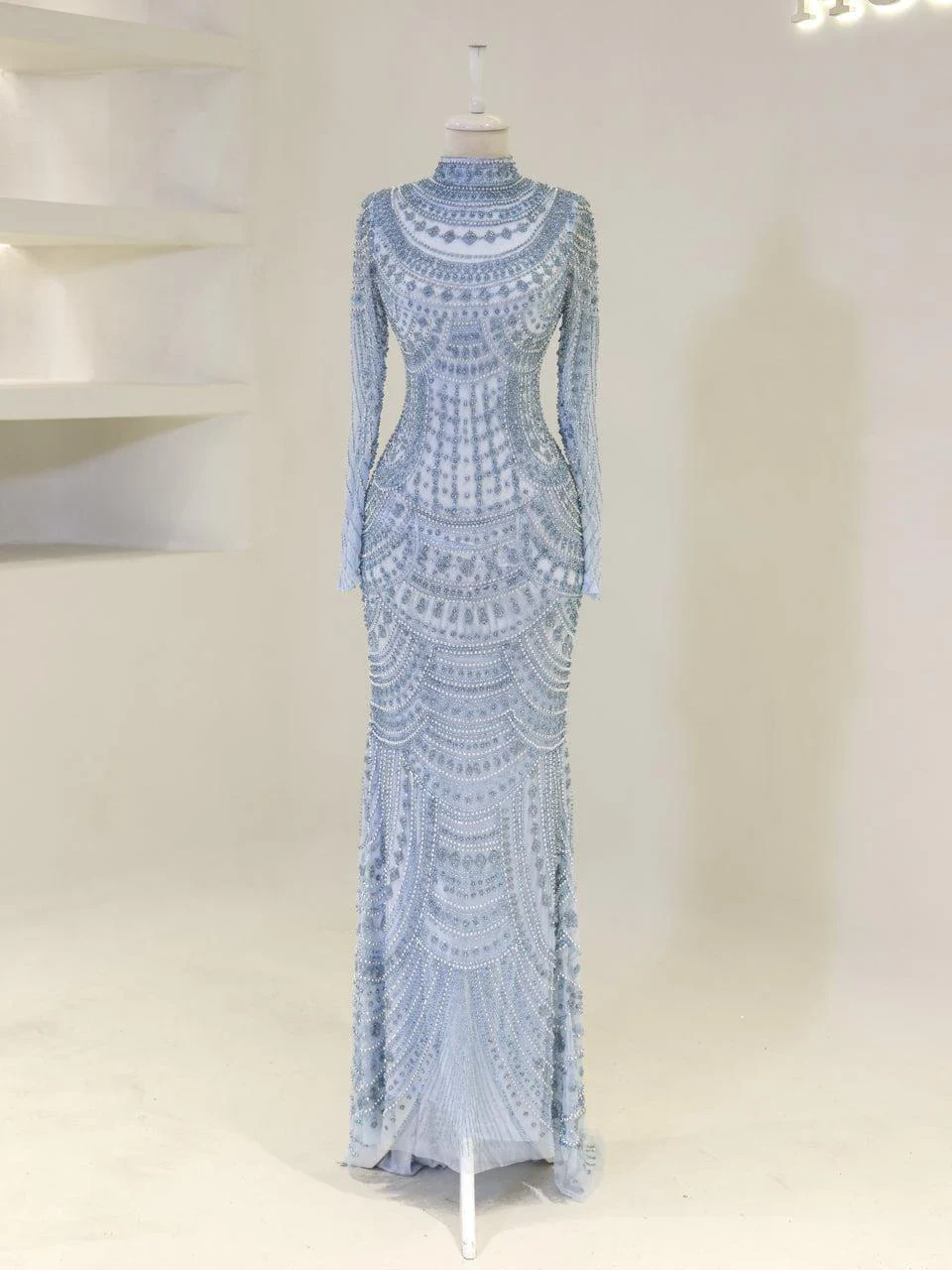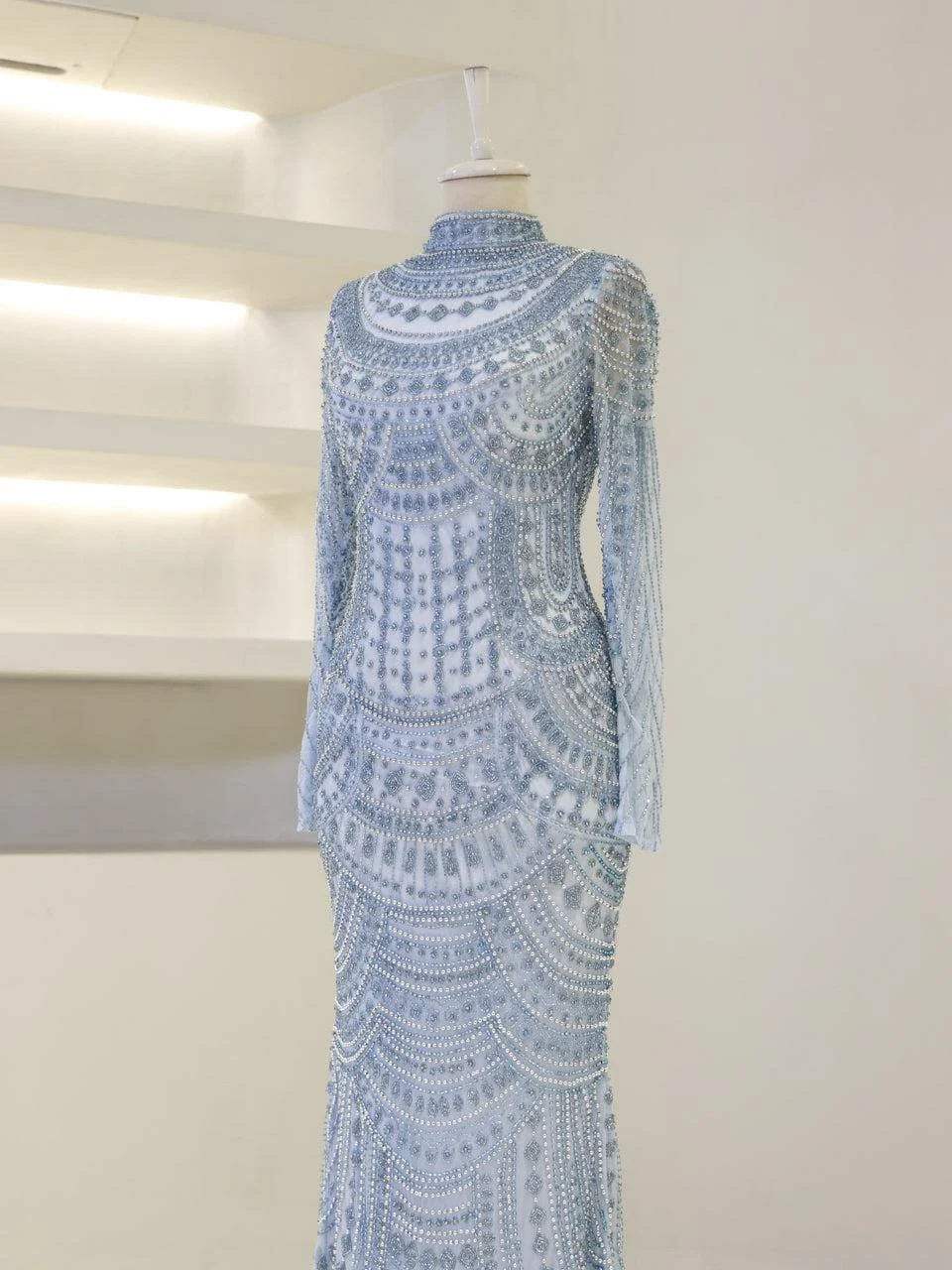 The Couture Amy Modest Evening Dress is designed with a full-length of 155 cm, featuring a high neckline and a back zipper for easy wear. Made from embroidered stretch fabric, this dress includes a lining for added comfort. The long sleeves are transparent, but can be modified upon request. For more details on sleeve modifications and pricing, please contact our WhatsApp line.