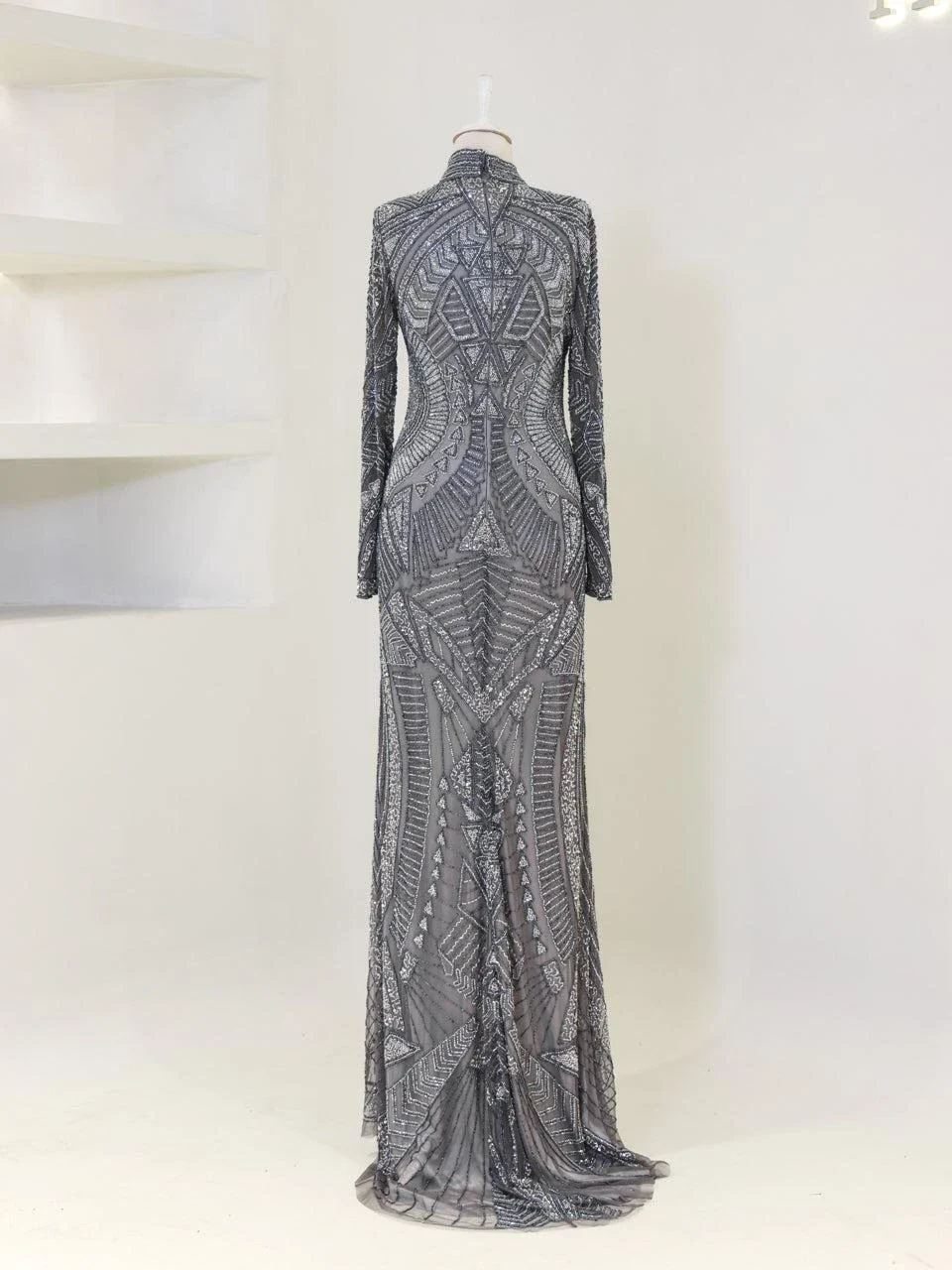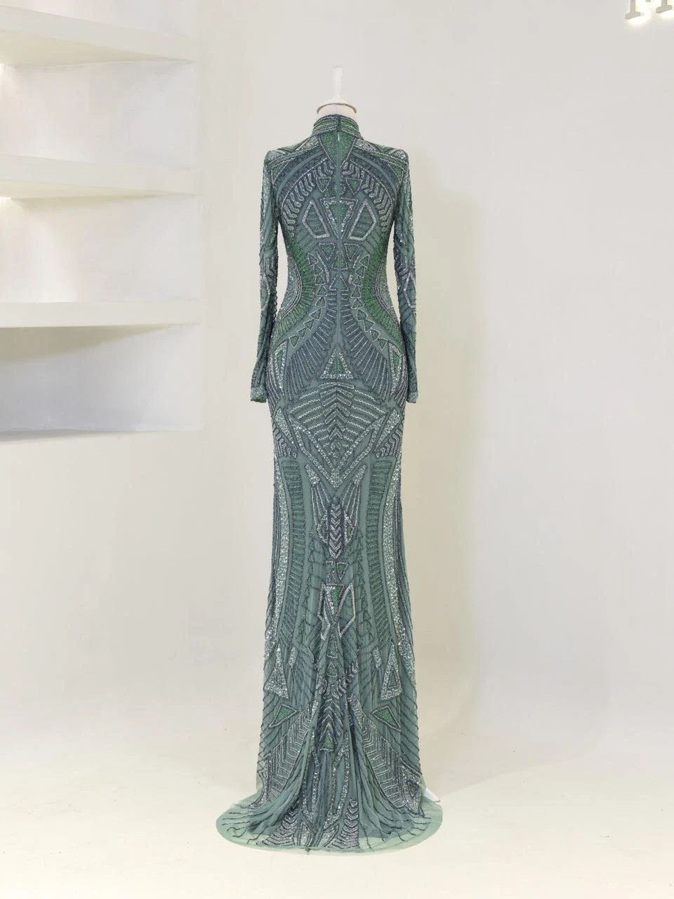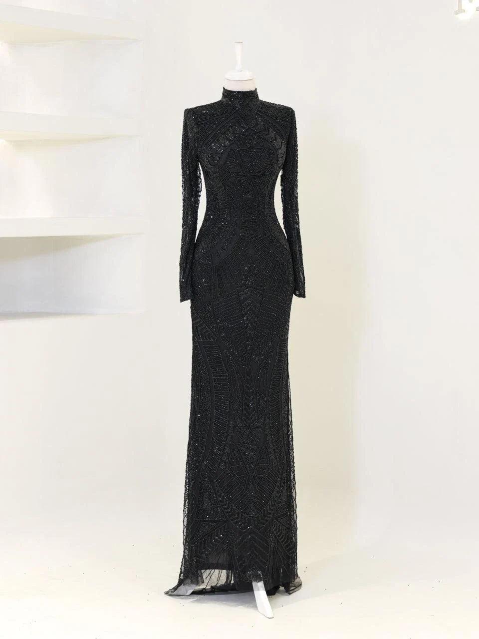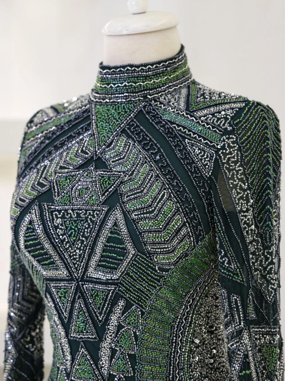 The Couture Asya Evening Dress is designed with precision, featuring a full-length of 160 cm and a 20 cm back train detail. Made from embroidered fabric, the dress includes a stand-up collar and a back zipper for easy wear. The sleeves are transparent, and customization is available upon request to cover the transparent details. For more information, please contact our WhatsApp line at -.