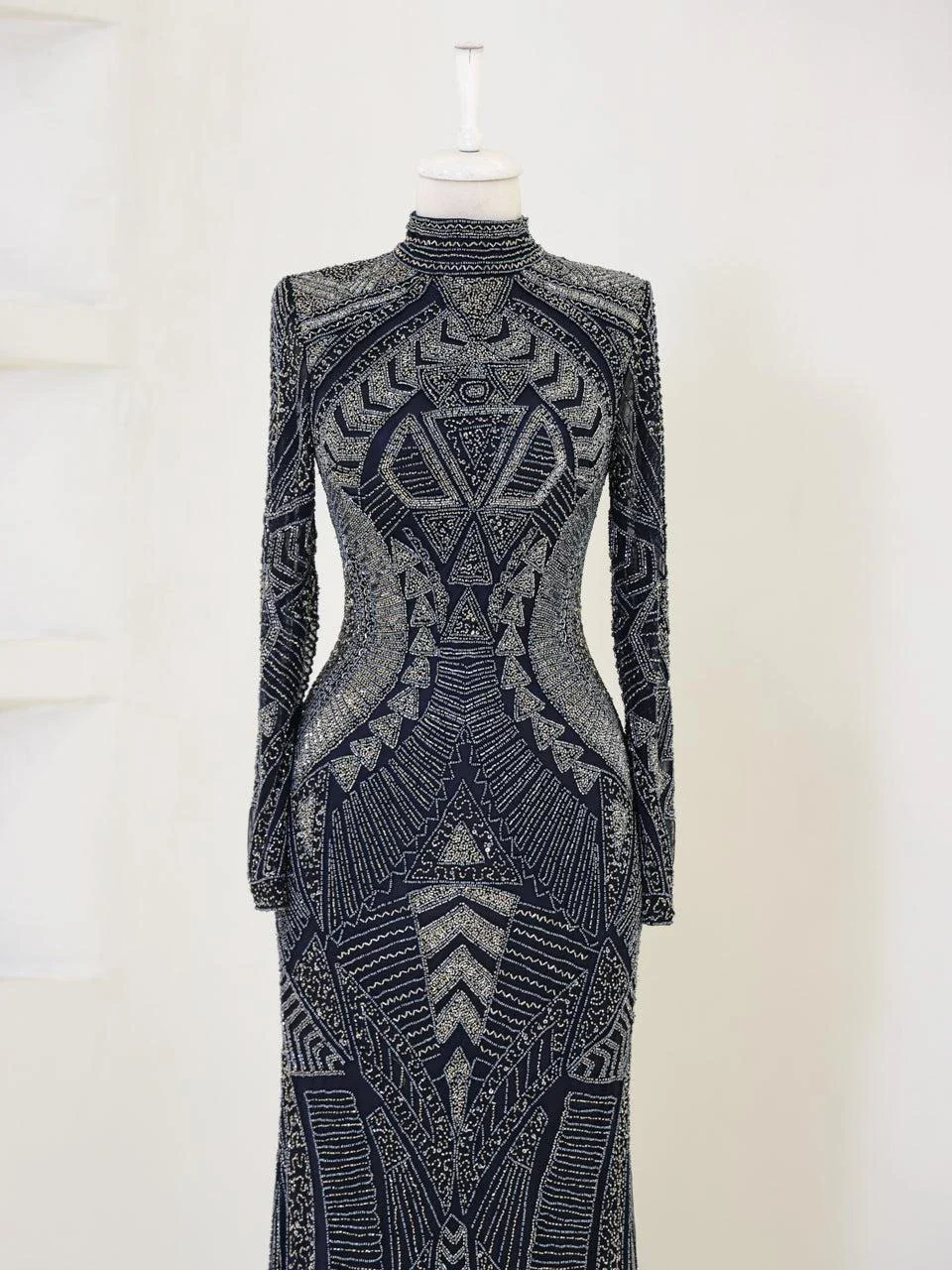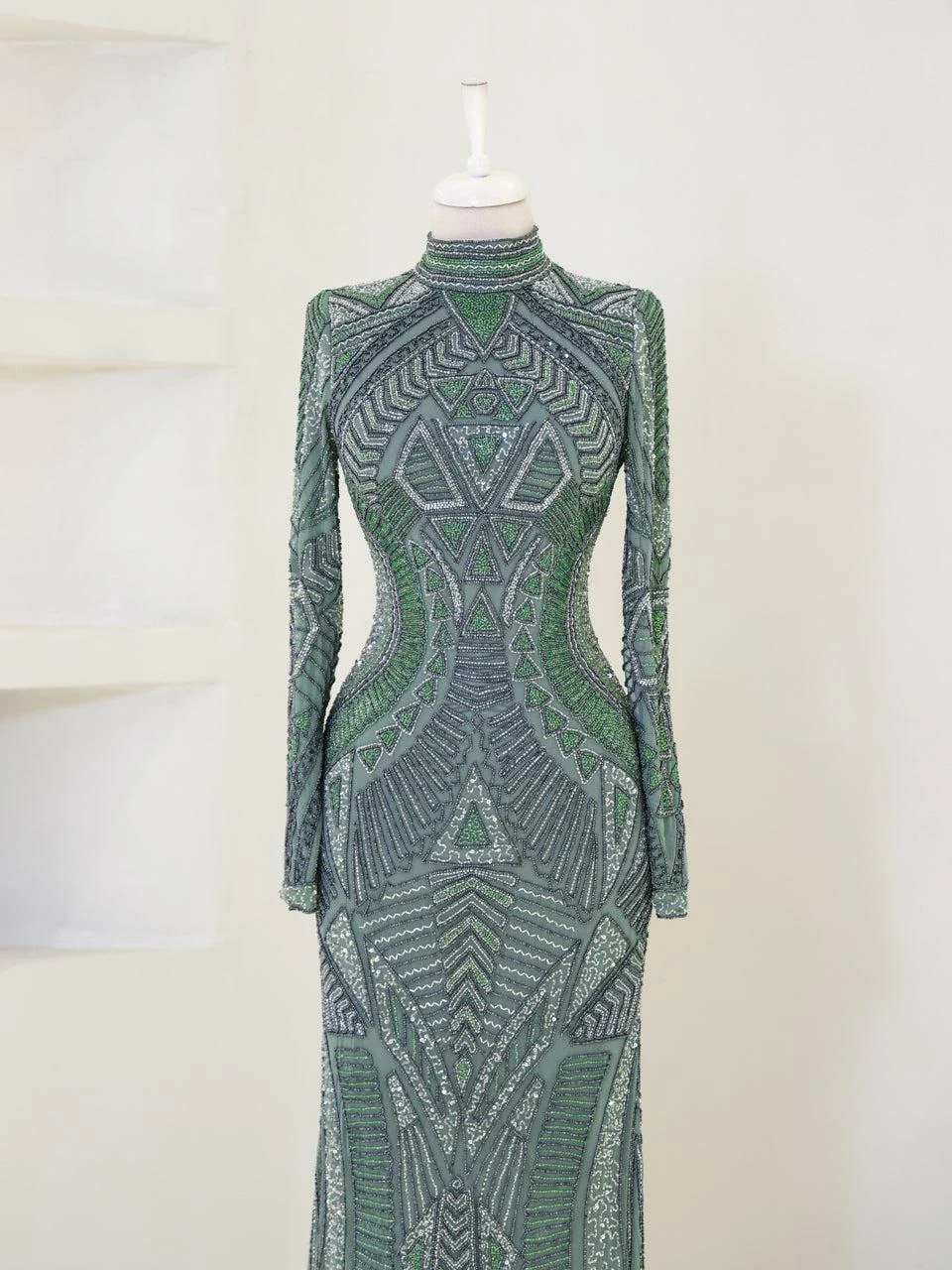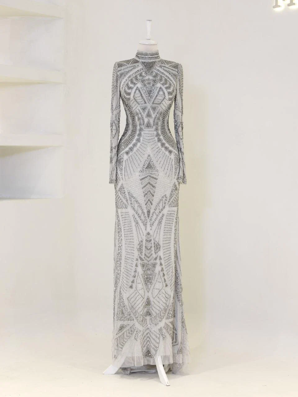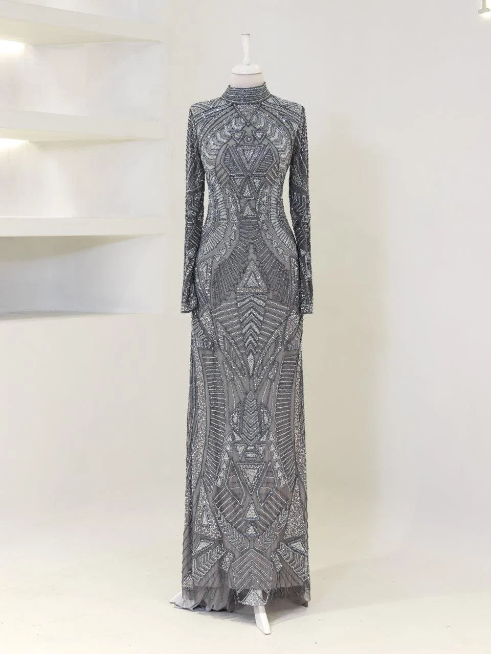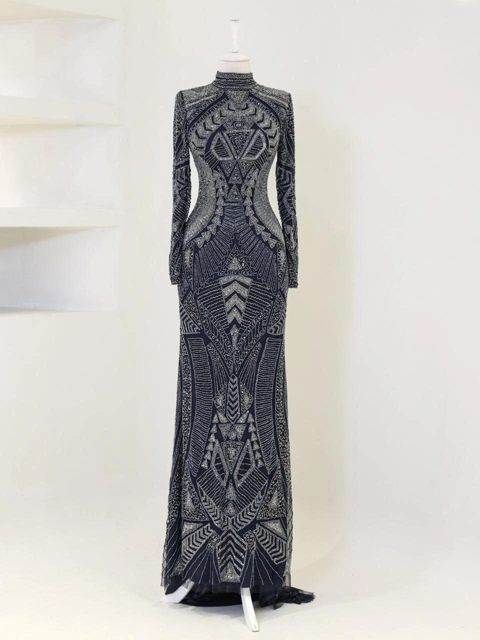 The Couture Asya Evening Dress is designed with precision, featuring a full-length of 160 cm and a 20 cm back train detail. Made from embroidered fabric, the dress includes a stand-up collar and a back zipper for easy wear. The sleeves are transparent, and customization is available upon request to cover the transparent details. For more information, please contact our WhatsApp line at -.