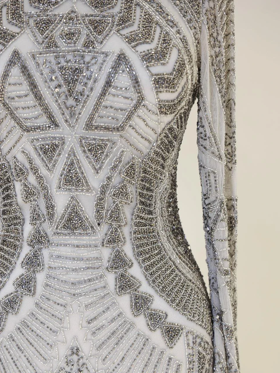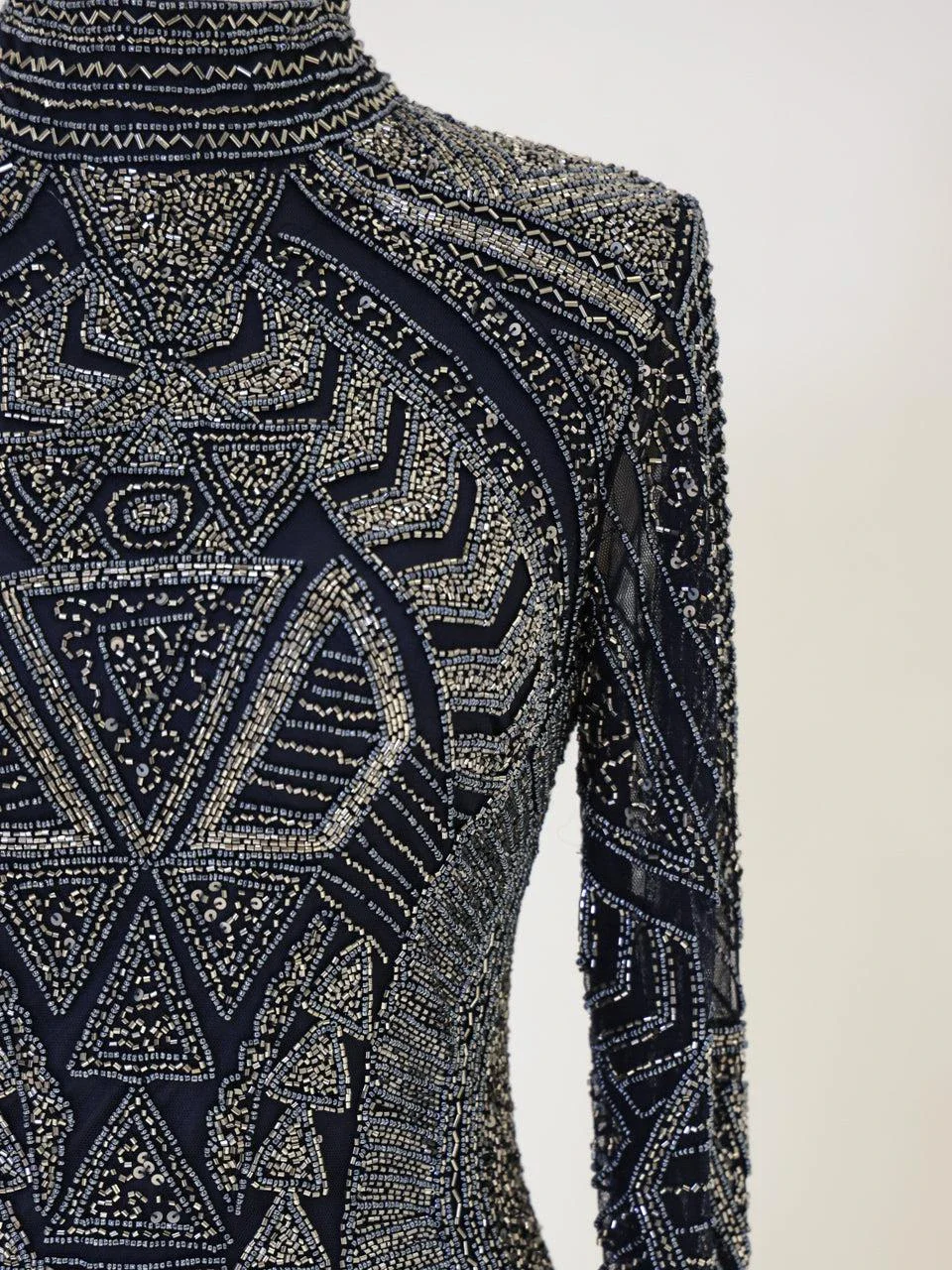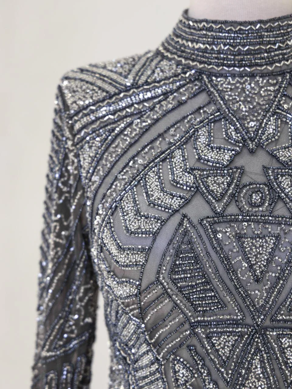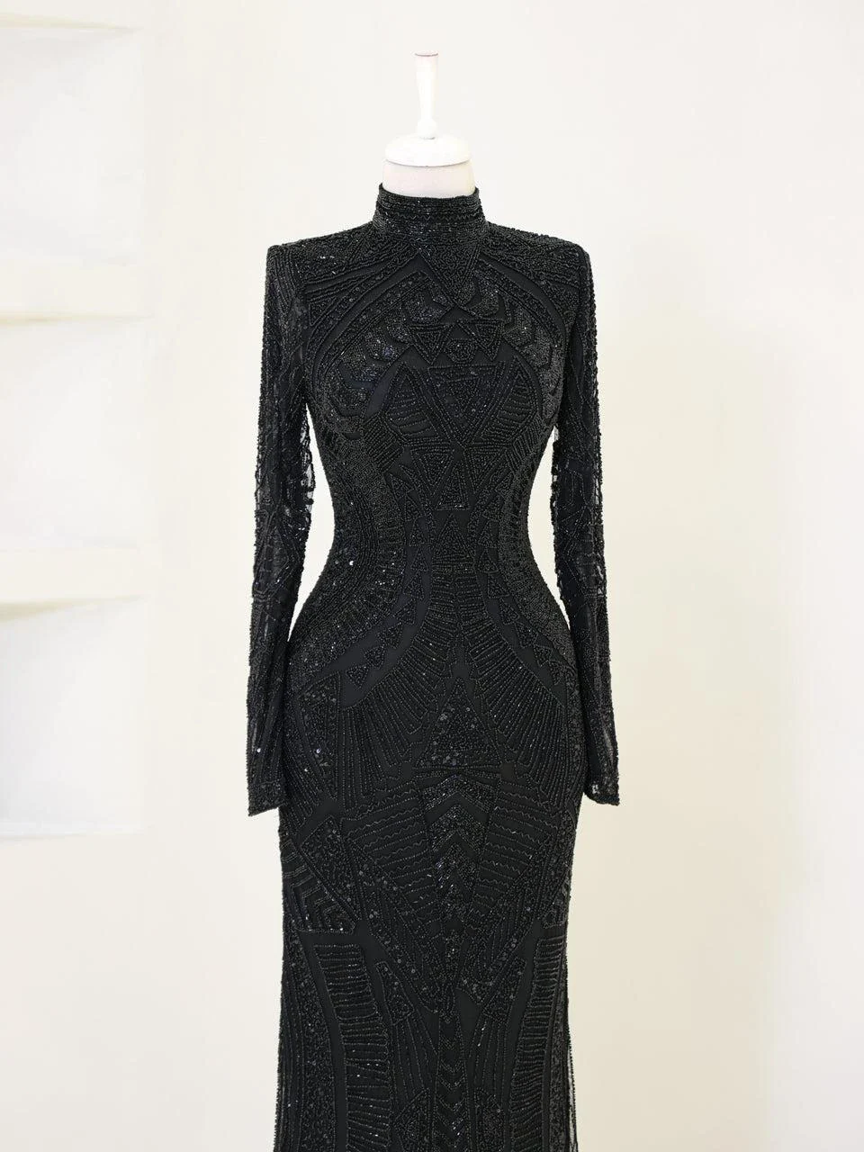 The Couture Asya Evening Dress is designed with precision, featuring a full-length of 160 cm and a 20 cm back train detail. Made from embroidered fabric, the dress includes a stand-up collar and a back zipper for easy wear. The sleeves are transparent, and customization is available upon request to cover the transparent details. For more information, please contact our WhatsApp line at -.