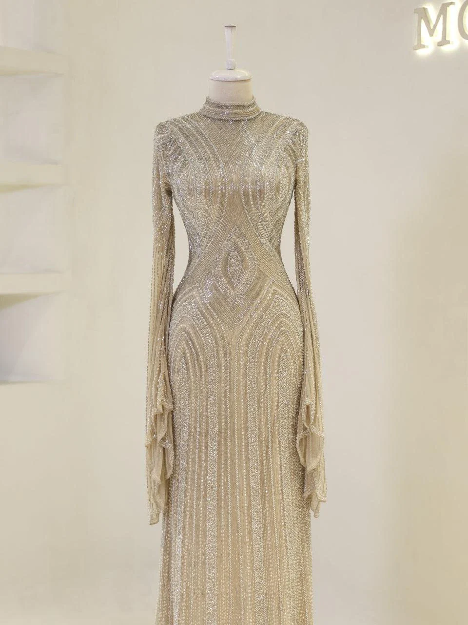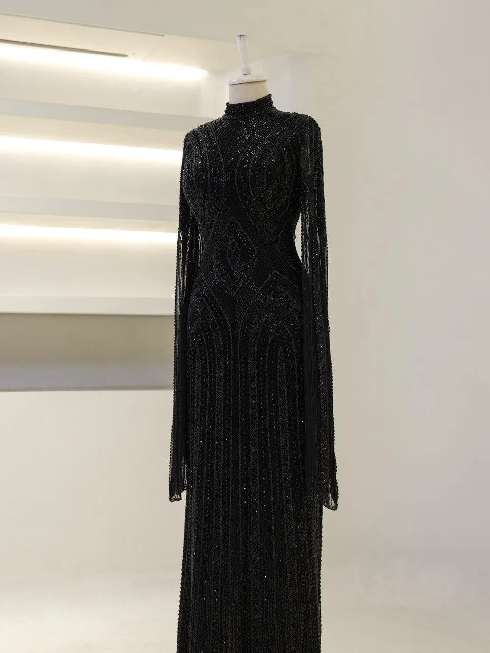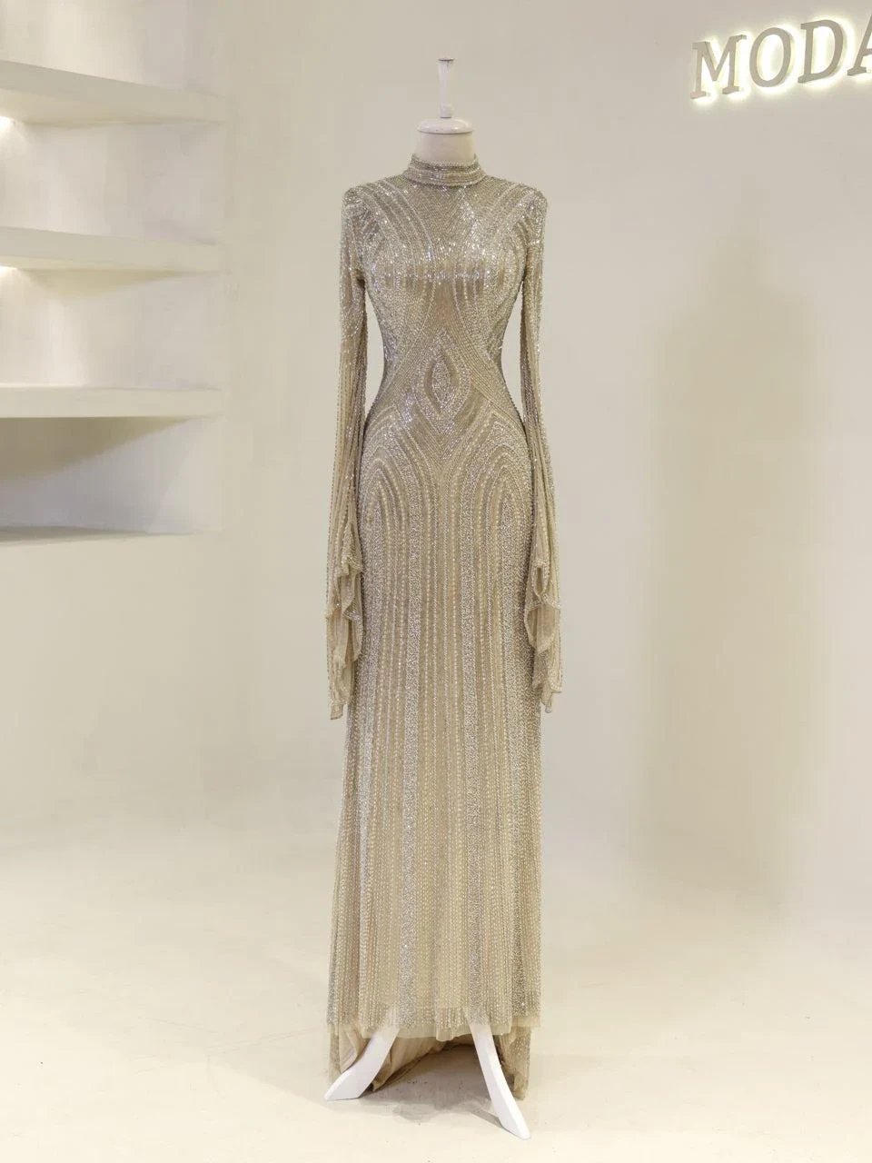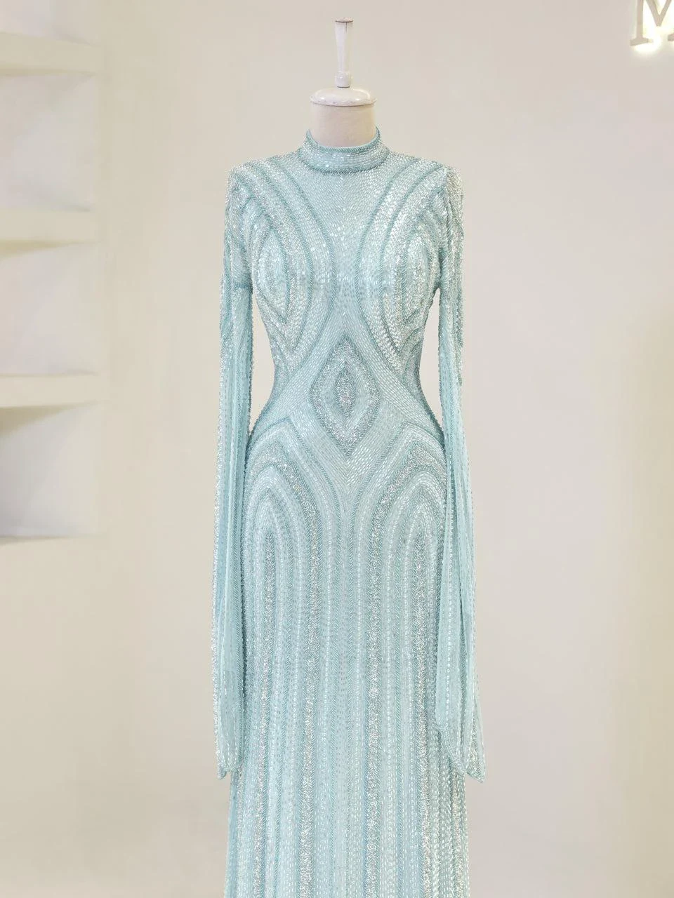 The Couture Berru Modest Evening Dress is designed with a precise fit, offering an elegant silhouette. The dress features a front length of approximately 160 cm and a back length of approximately 190 cm. It is fully lined and includes a back zipper for easy wear. The high neckline adds a sophisticated touch, while the transparent sleeves can be lined for additional coverage to suit modest preferences. The dress is designed in a pencil form, providing a sleek and refined look.