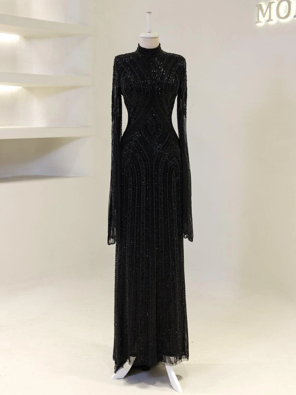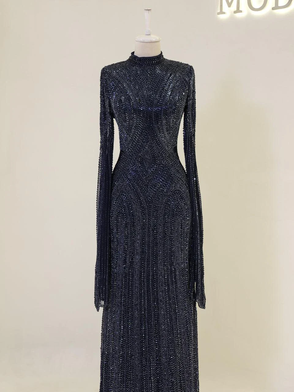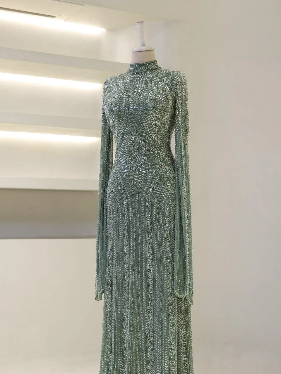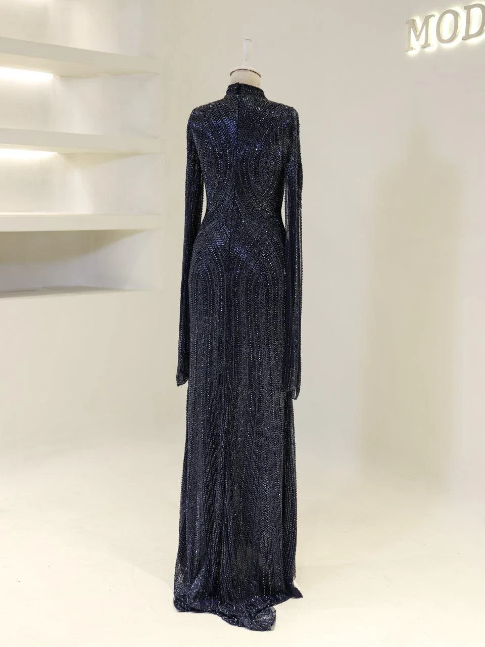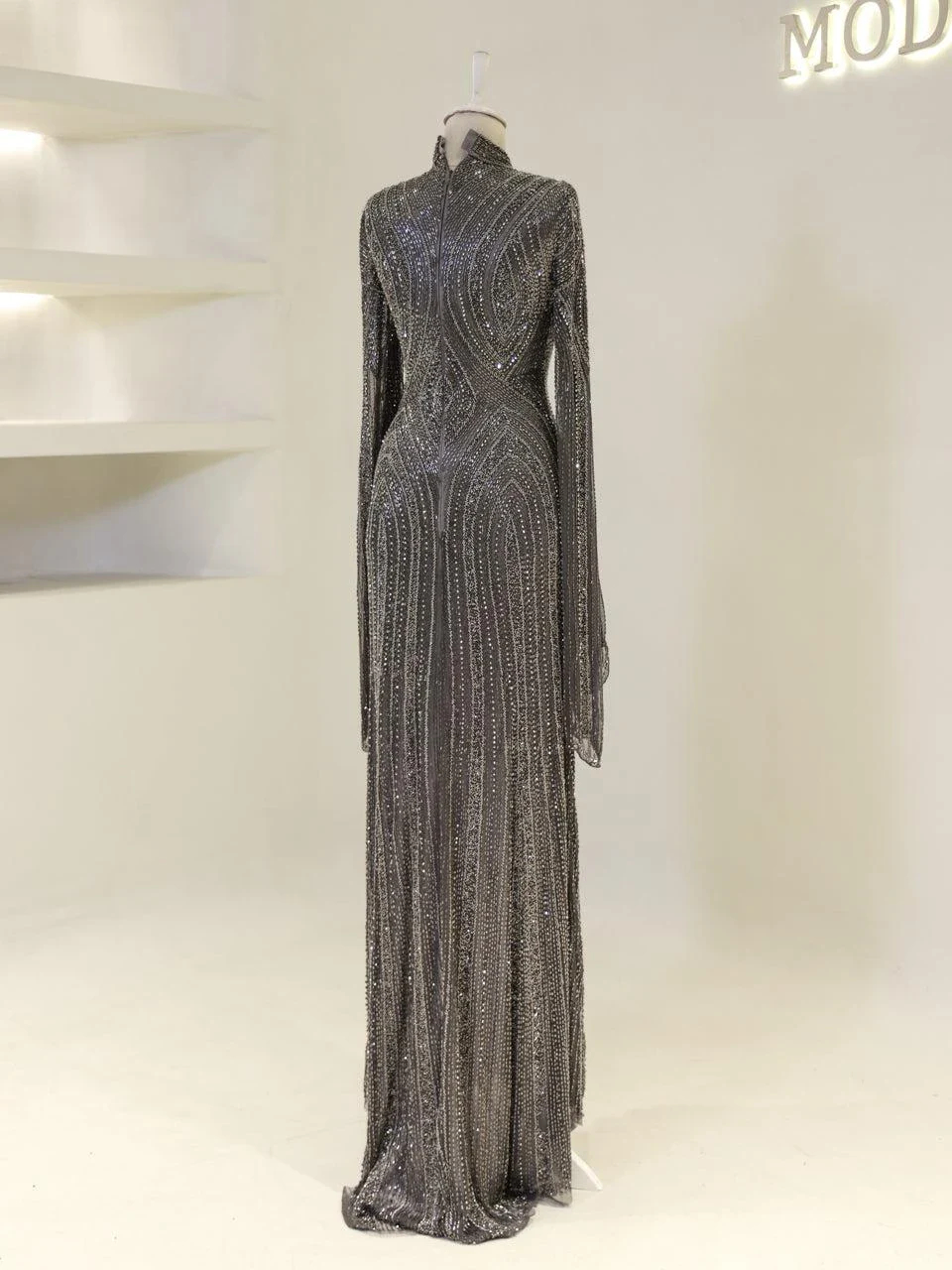 The Couture Berru Modest Evening Dress is designed with a precise fit, offering an elegant silhouette. The dress features a front length of approximately 160 cm and a back length of approximately 190 cm. It is fully lined and includes a back zipper for easy wear. The high neckline adds a sophisticated touch, while the transparent sleeves can be lined for additional coverage to suit modest preferences. The dress is designed in a pencil form, providing a sleek and refined look.
