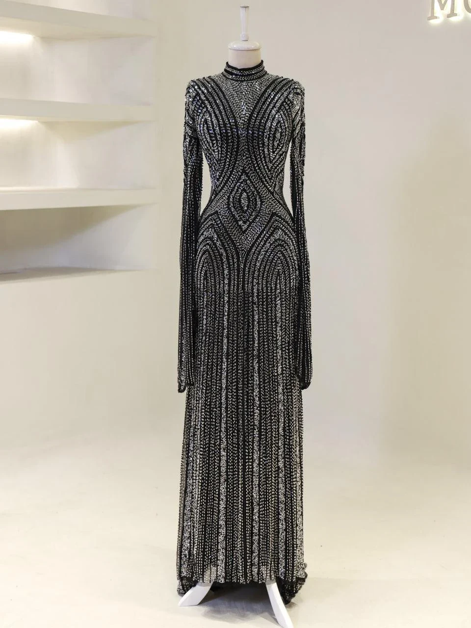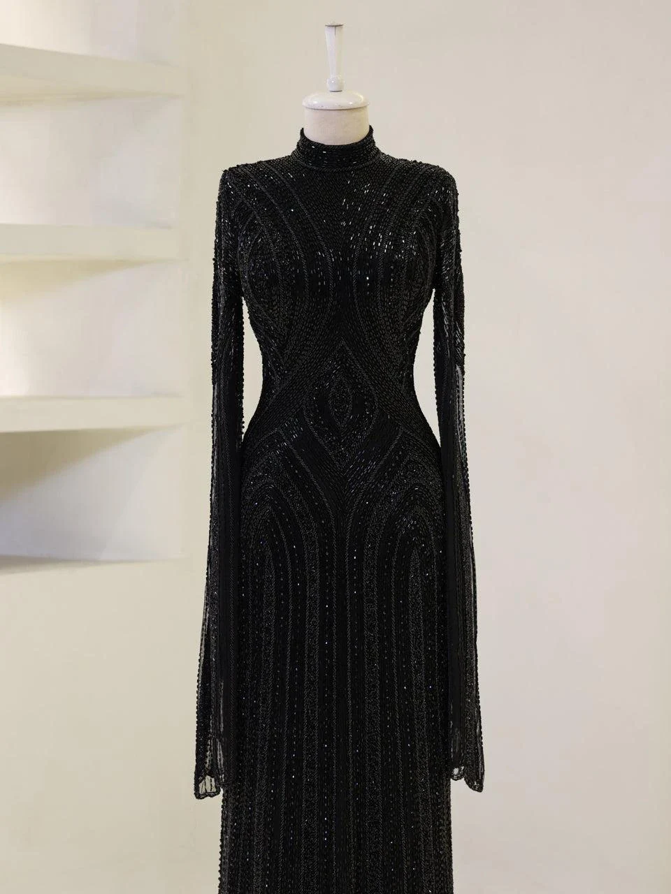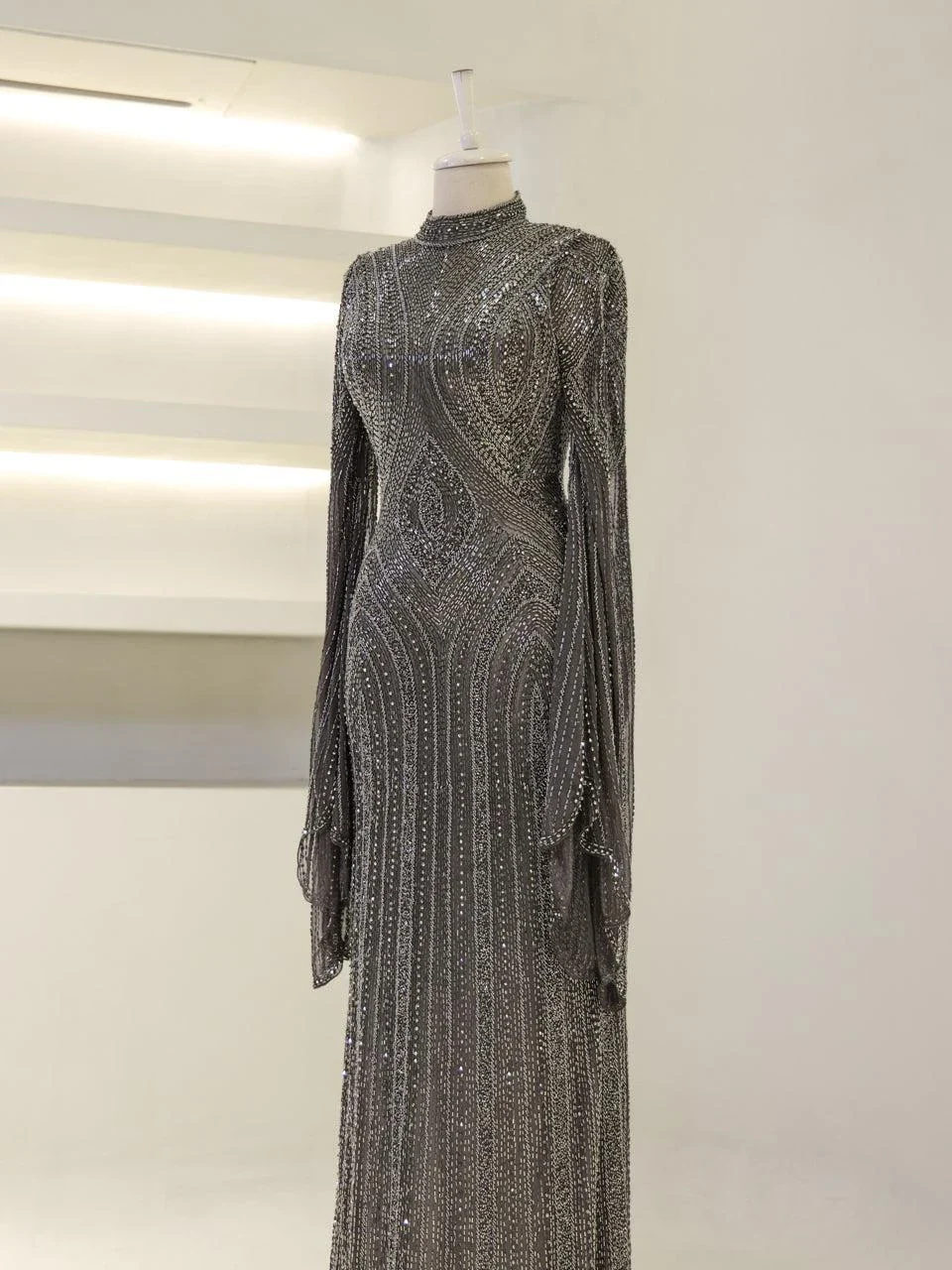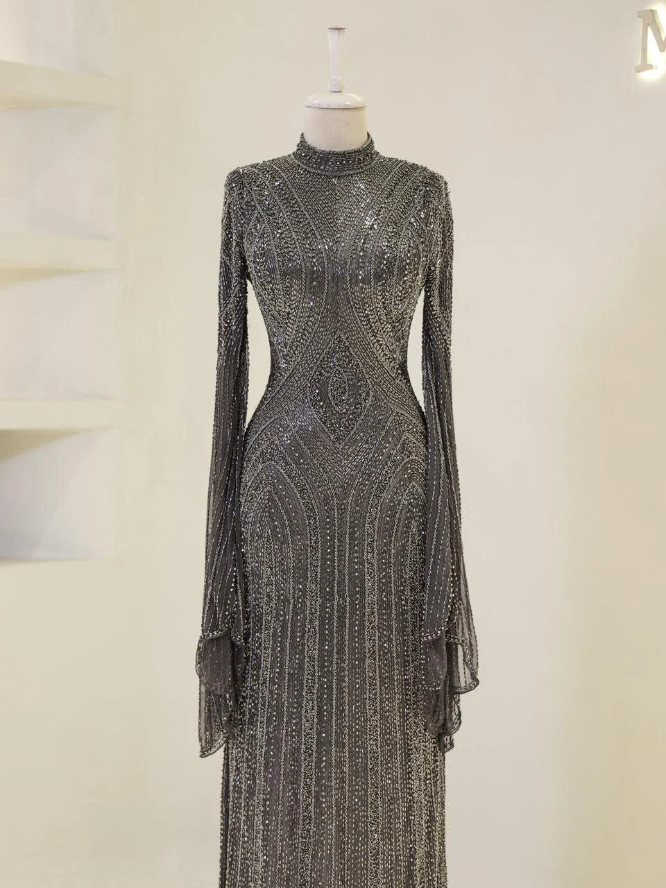The Couture Berru Modest Evening Dress is designed with a precise fit, offering an elegant silhouette. The dress features a front length of approximately 160 cm and a back length of approximately 190 cm. It is fully lined and includes a back zipper for easy wear. The high neckline adds a sophisticated touch, while the transparent sleeves can be lined for additional coverage to suit modest preferences. The dress is designed in a pencil form, providing a sleek and refined look.