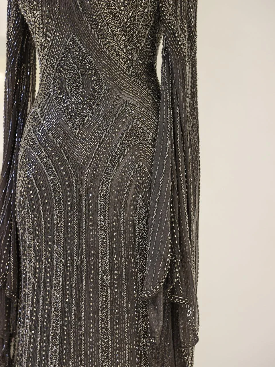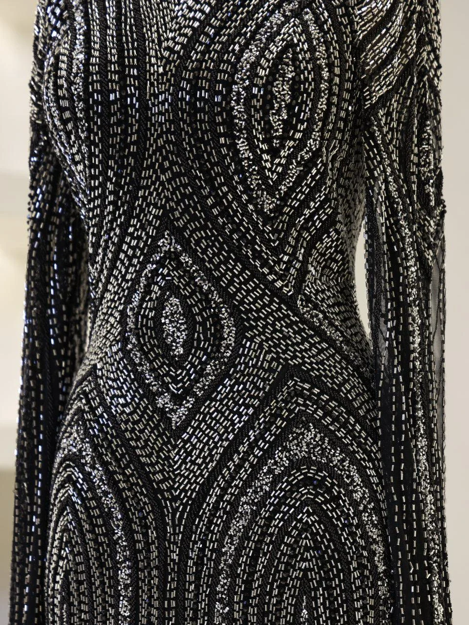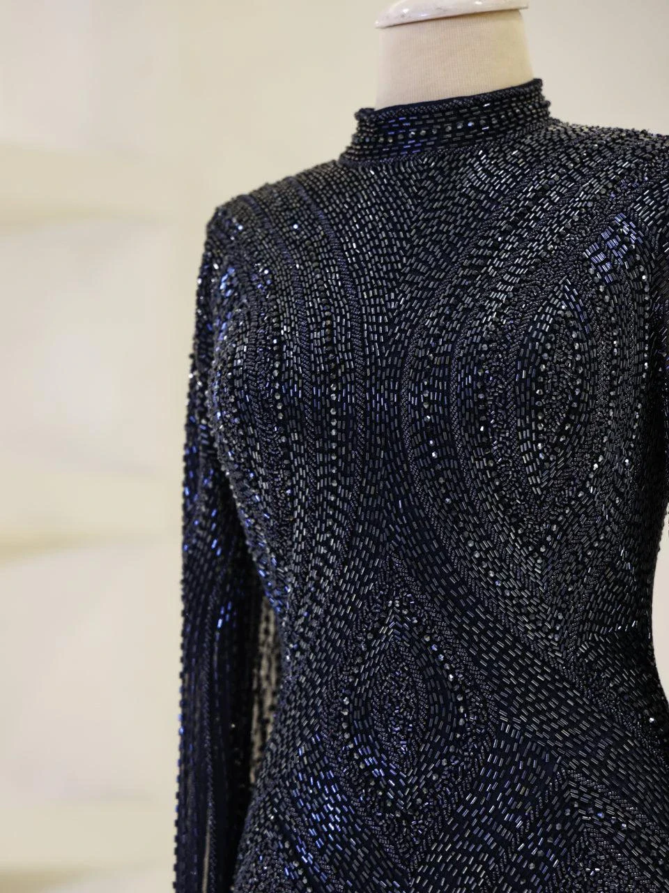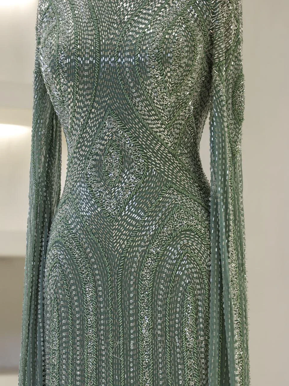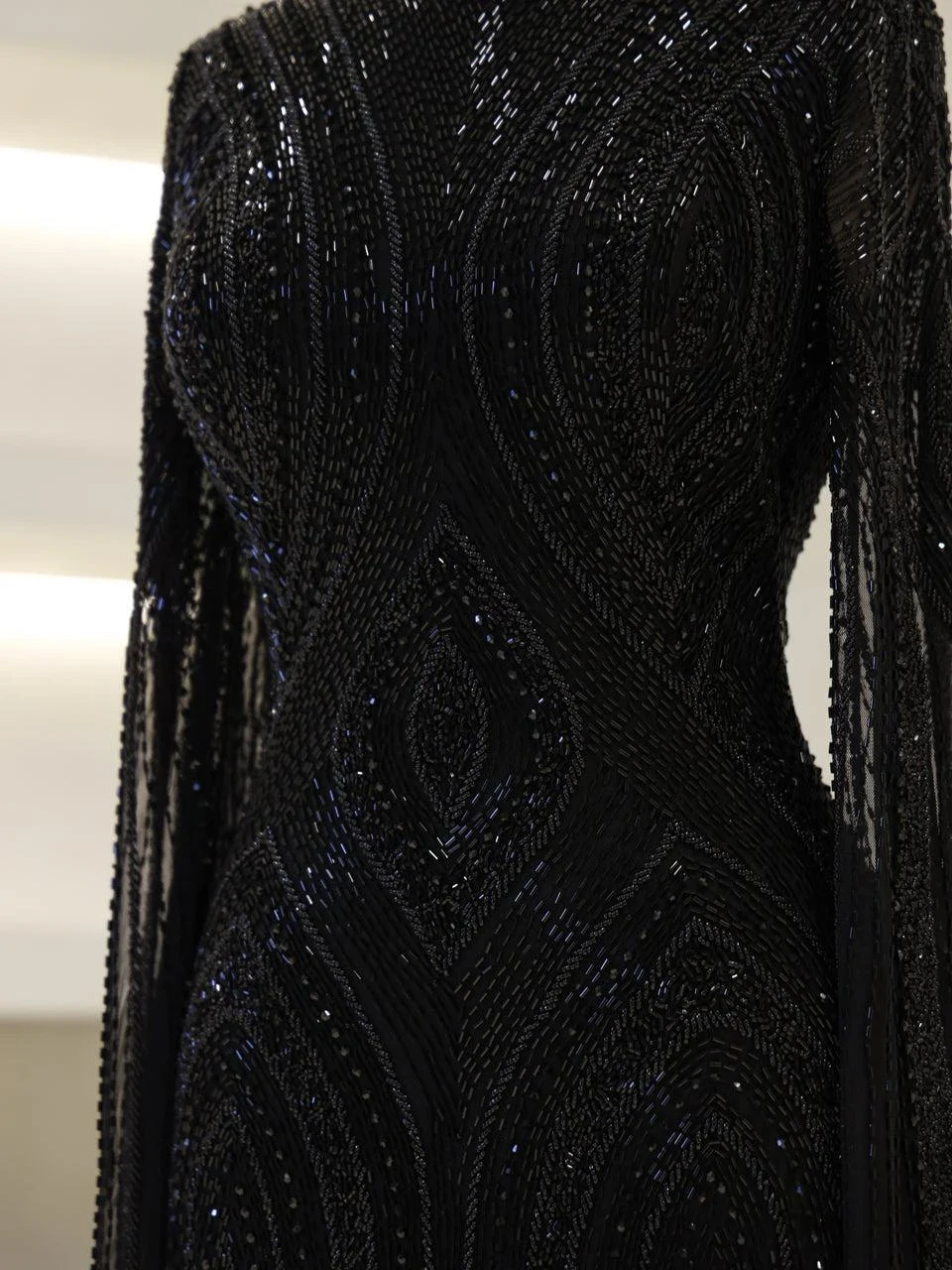 The Couture Berru Modest Evening Dress is designed with a precise fit, offering an elegant silhouette. The dress features a front length of approximately 160 cm and a back length of approximately 190 cm. It is fully lined and includes a back zipper for easy wear. The high neckline adds a sophisticated touch, while the transparent sleeves can be lined for additional coverage to suit modest preferences. The dress is designed in a pencil form, providing a sleek and refined look.