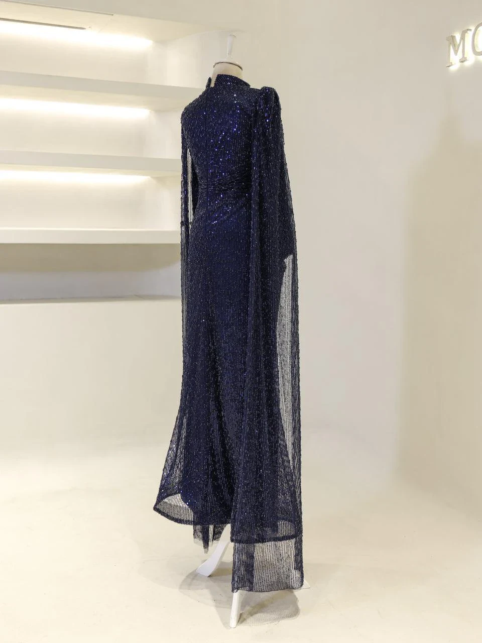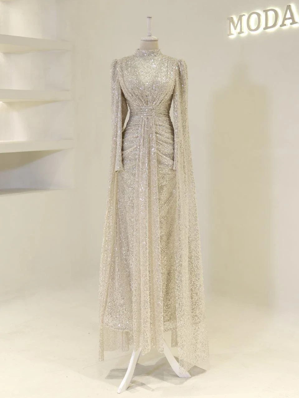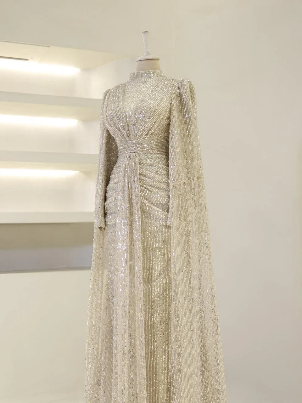 The Couture Bonilla Modest Evening Dress is designed with a true-to-size fit and an average length of 155 cm. Crafted from embroidered tulle fabric, this dress features a lining for added comfort. It includes a built-in chest pad and a back zipper for easy wear. The dress is distinguished by a cape detail that flows from the shoulders to the hem, complementing its flared skirt design.