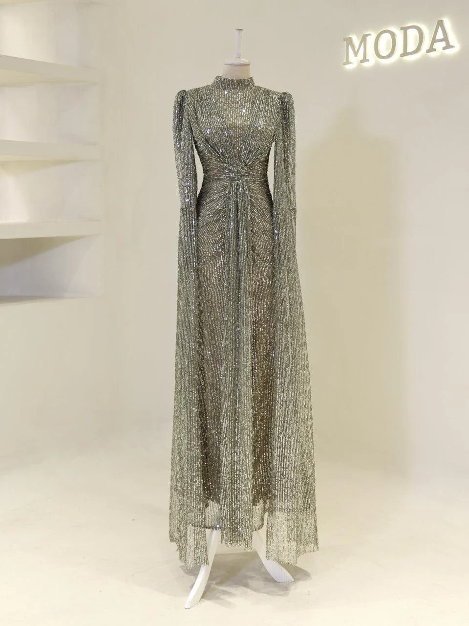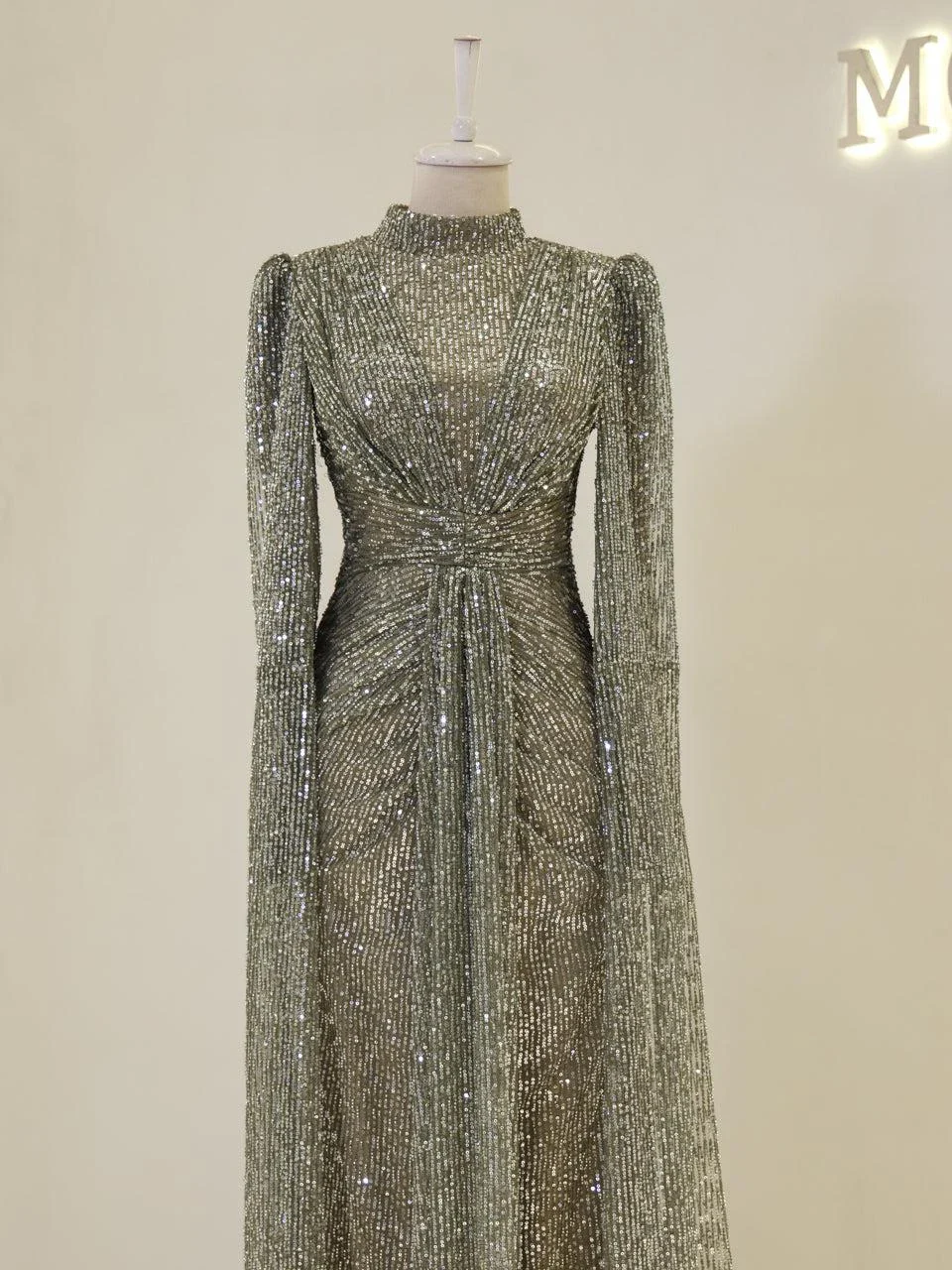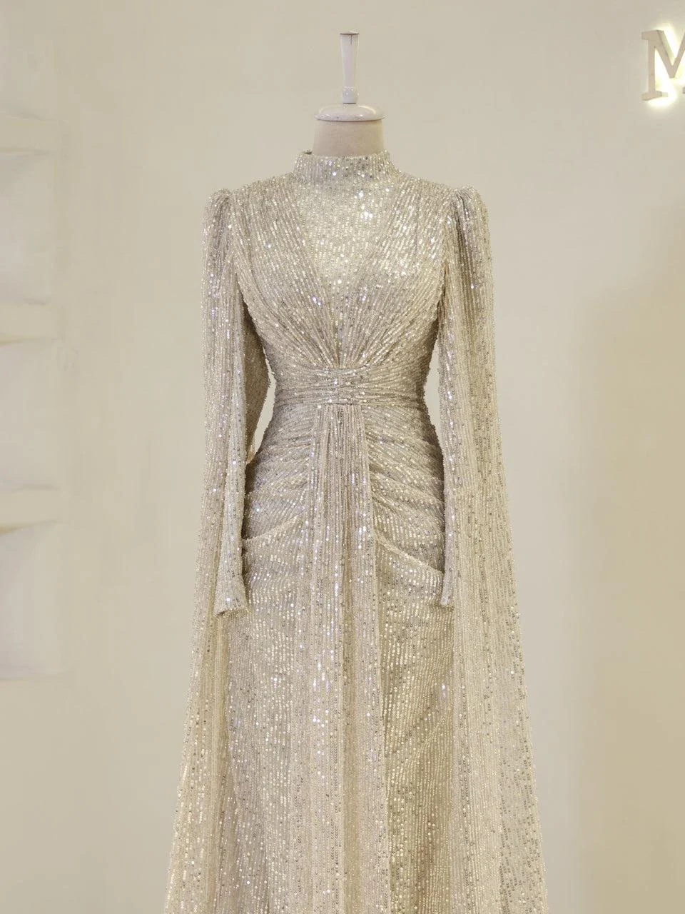 The Couture Bonilla Modest Evening Dress is designed with a true-to-size fit and an average length of 155 cm. Crafted from embroidered tulle fabric, this dress features a lining for added comfort. It includes a built-in chest pad and a back zipper for easy wear. The dress is distinguished by a cape detail that flows from the shoulders to the hem, complementing its flared skirt design.