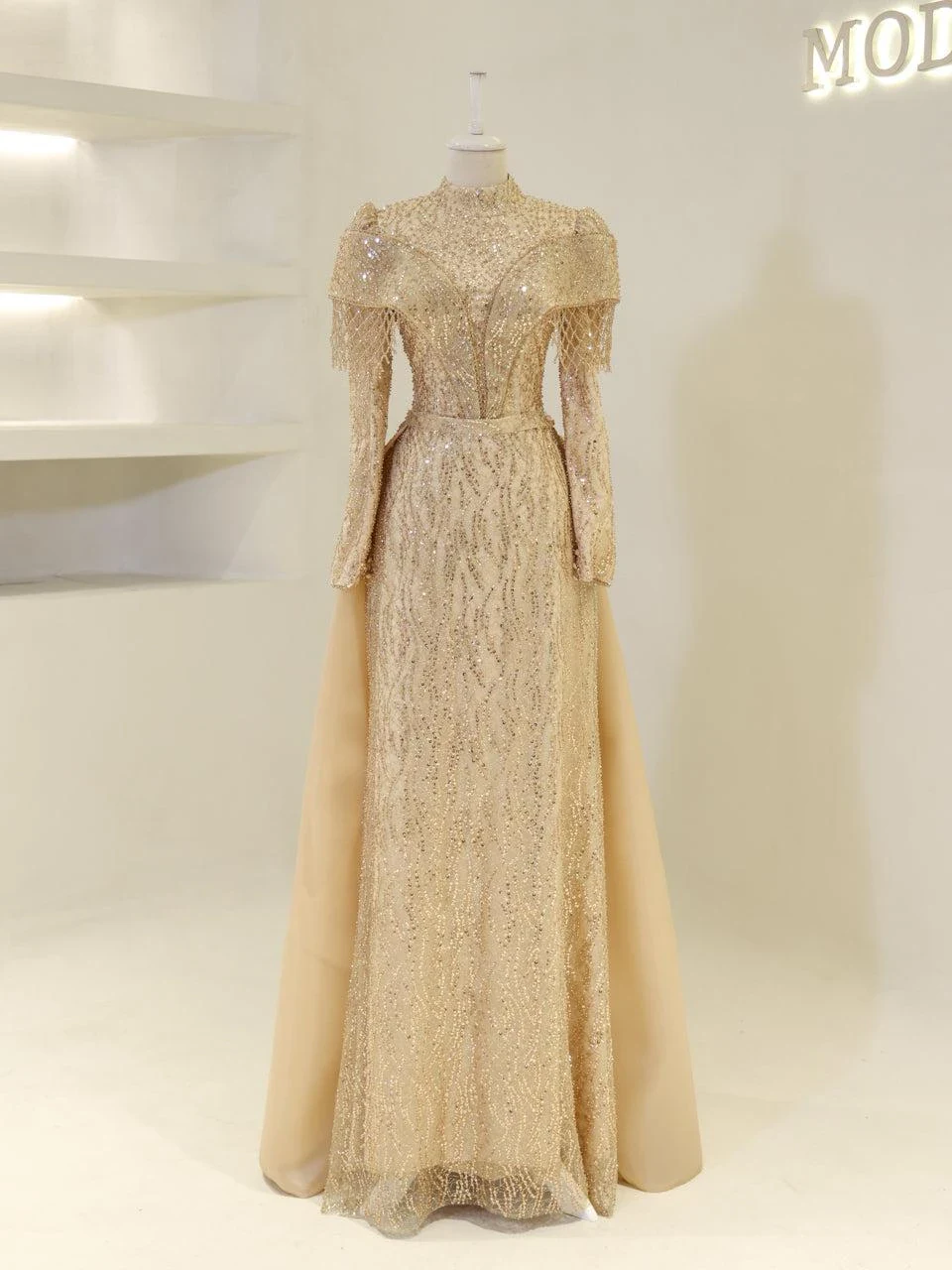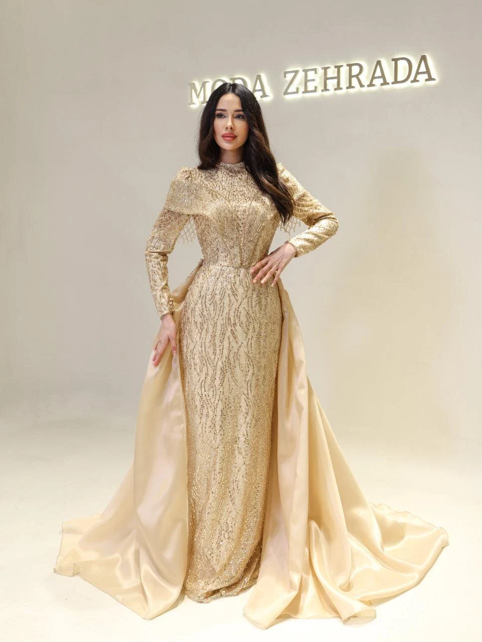 The Couture Bowie Modest Evening Dress is tailored to your measurements upon order. The average preparation time is 15-20 days. This special design features hand-embroidered embellishments. For detailed information and remote fitting, you can contact us via WhatsApp at -. IMPORTANT: In our custom-made models, slight changes in embellishments may occur as the size increases. NOTE: The embellishments are glued, which may result in some shedding. (This does not affect the appearance.)