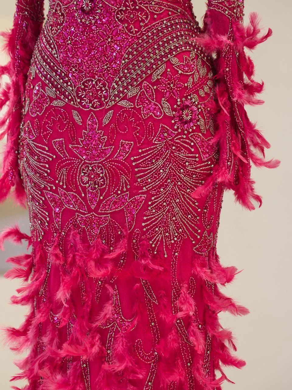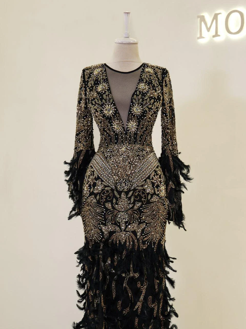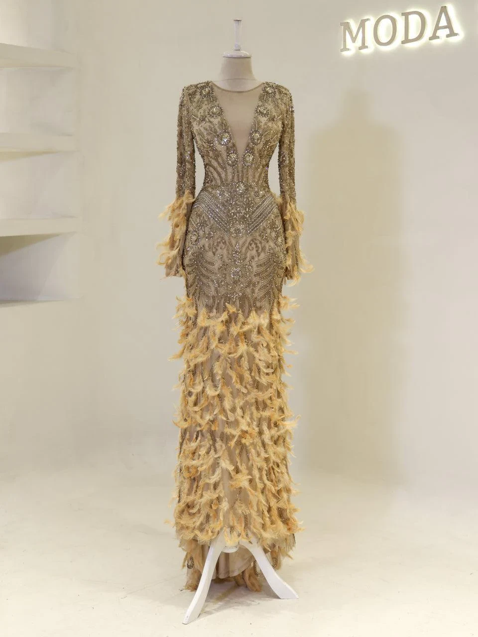 The Couture Bremen Modest Evening Dress is designed with precise tailoring and features an average length of 160 cm. Made from tulle fabric, it includes a transparent chest area and a cape detail extending from the shoulders to the hem. The dress is fastened with a back zipper and is fully lined, ensuring comfort and modesty. The skirt has a straight form. Note: The transparent chest area can be covered upon request. For more information, please contact our WhatsApp line at -.