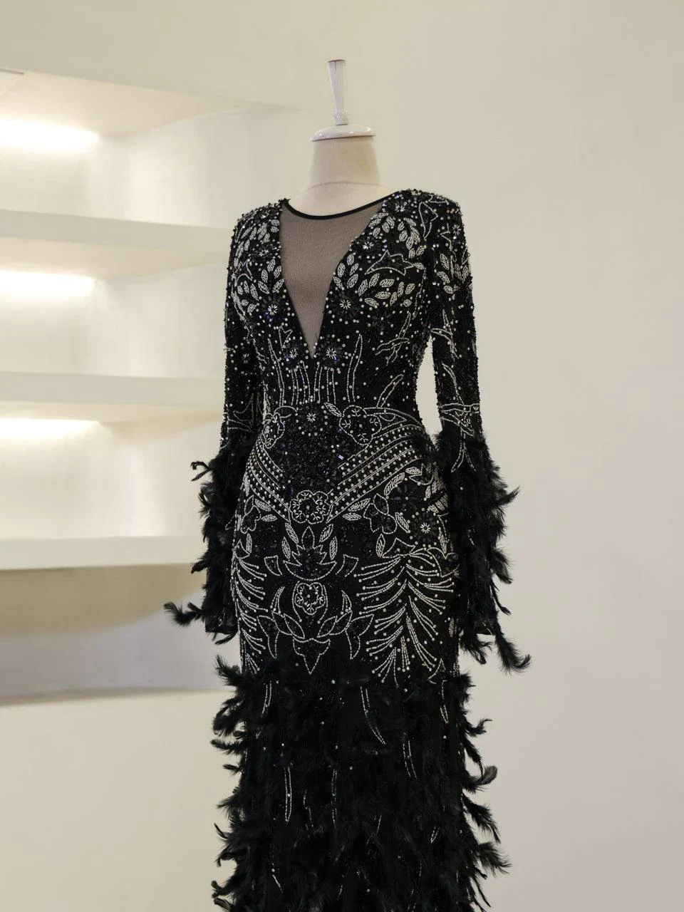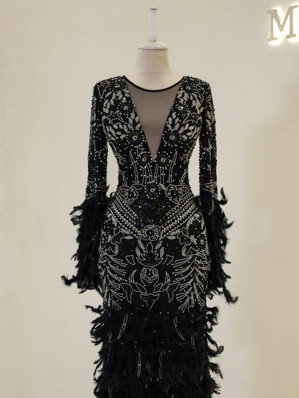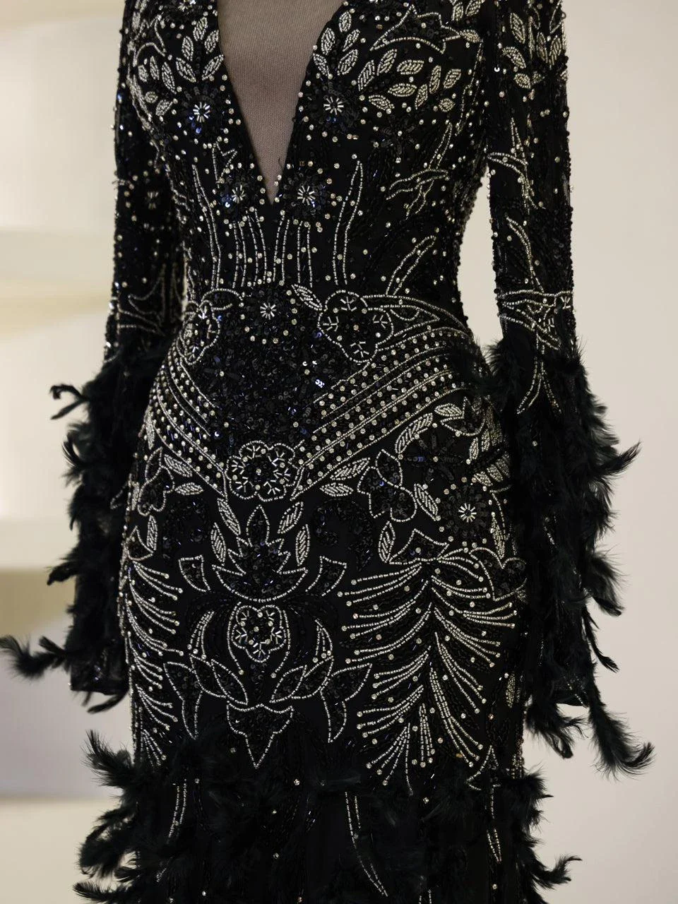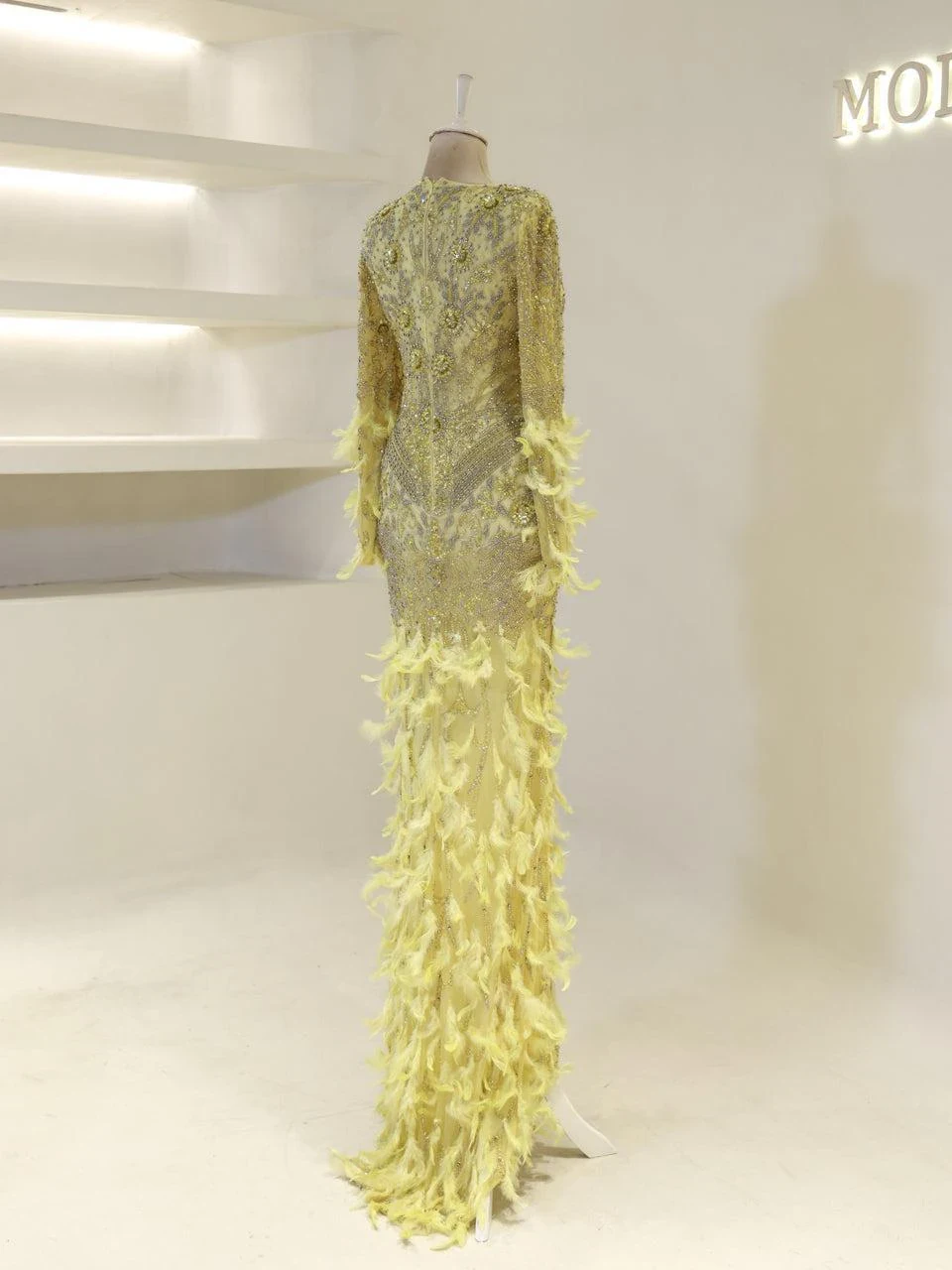 The Couture Bremen Modest Evening Dress is designed with precise tailoring and features an average length of 160 cm. Made from tulle fabric, it includes a transparent chest area and a cape detail extending from the shoulders to the hem. The dress is fastened with a back zipper and is fully lined, ensuring comfort and modesty. The skirt has a straight form. Note: The transparent chest area can be covered upon request. For more information, please contact our WhatsApp line at -.