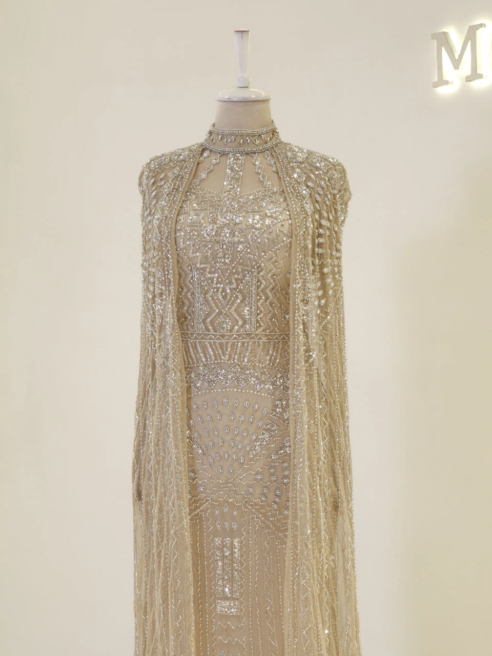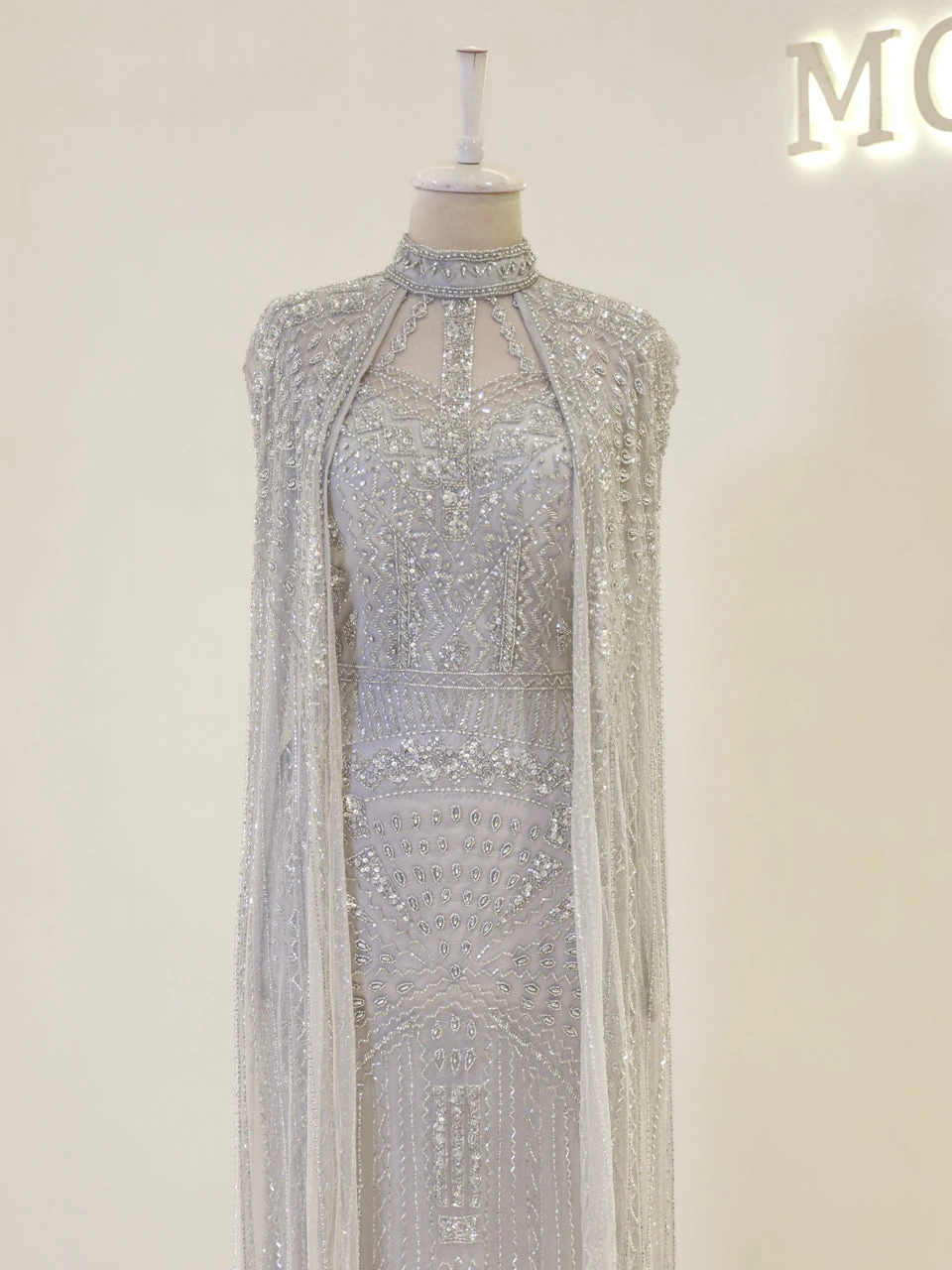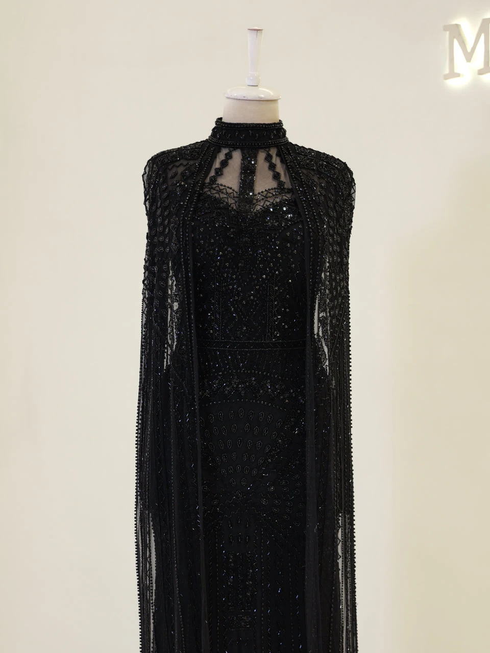 The Couture Bretagne Evening Dress features a full-length design with an average length of 165 cm. It includes a non-detachable cape detail and is crafted from embroidered stretch fabric. The dress is lined and has a pencil skirt form. The back is equipped with a zipper closure, and the chest area is designed with a transparent section.