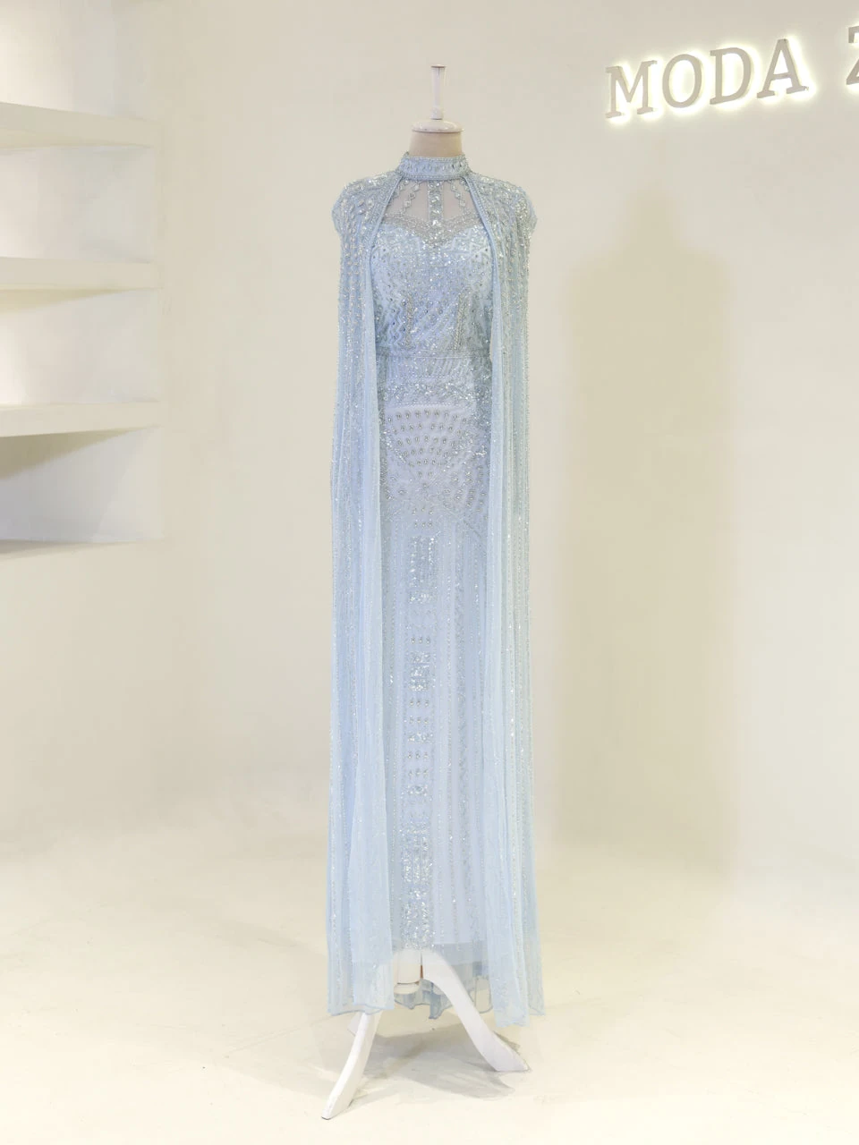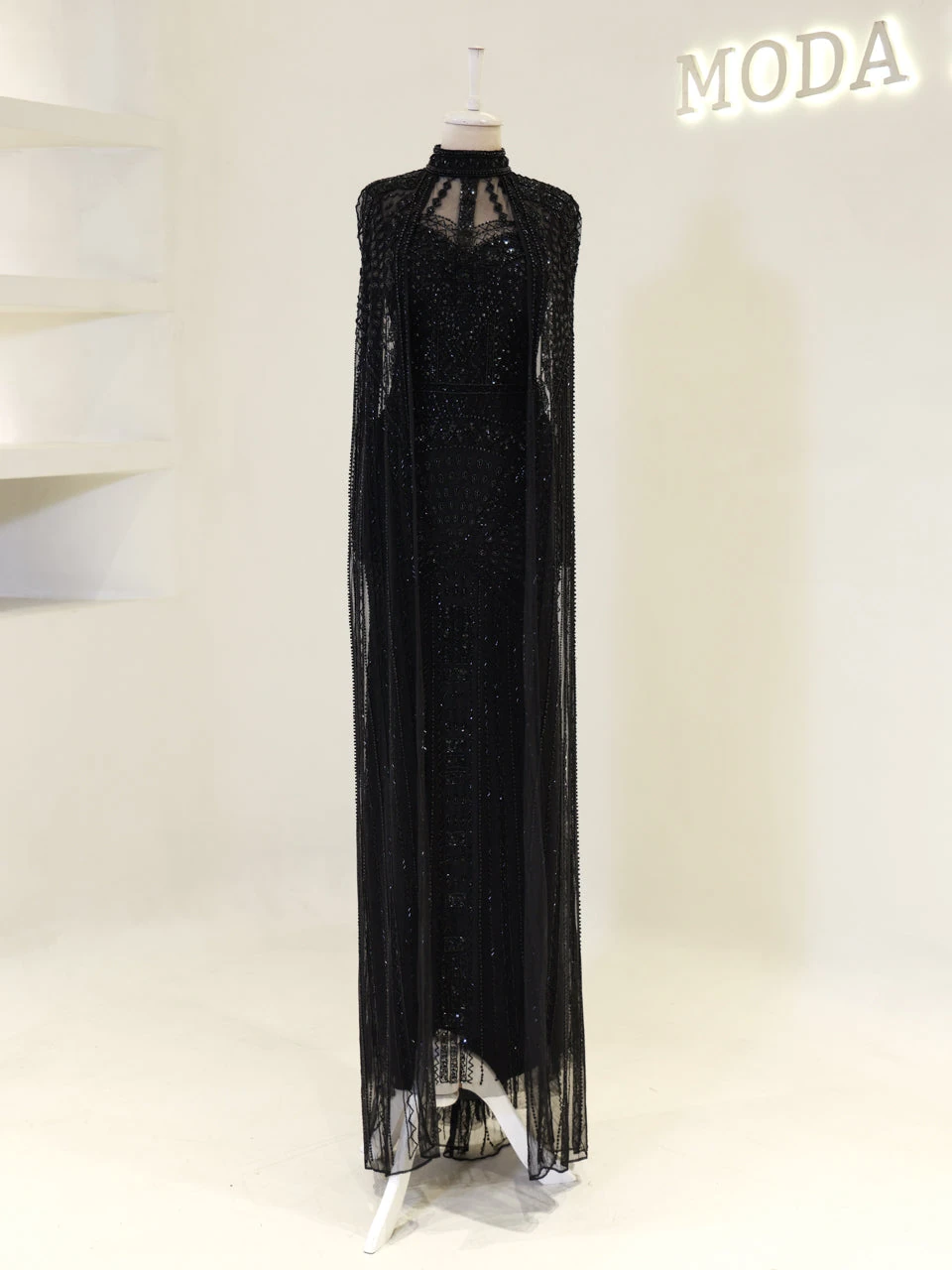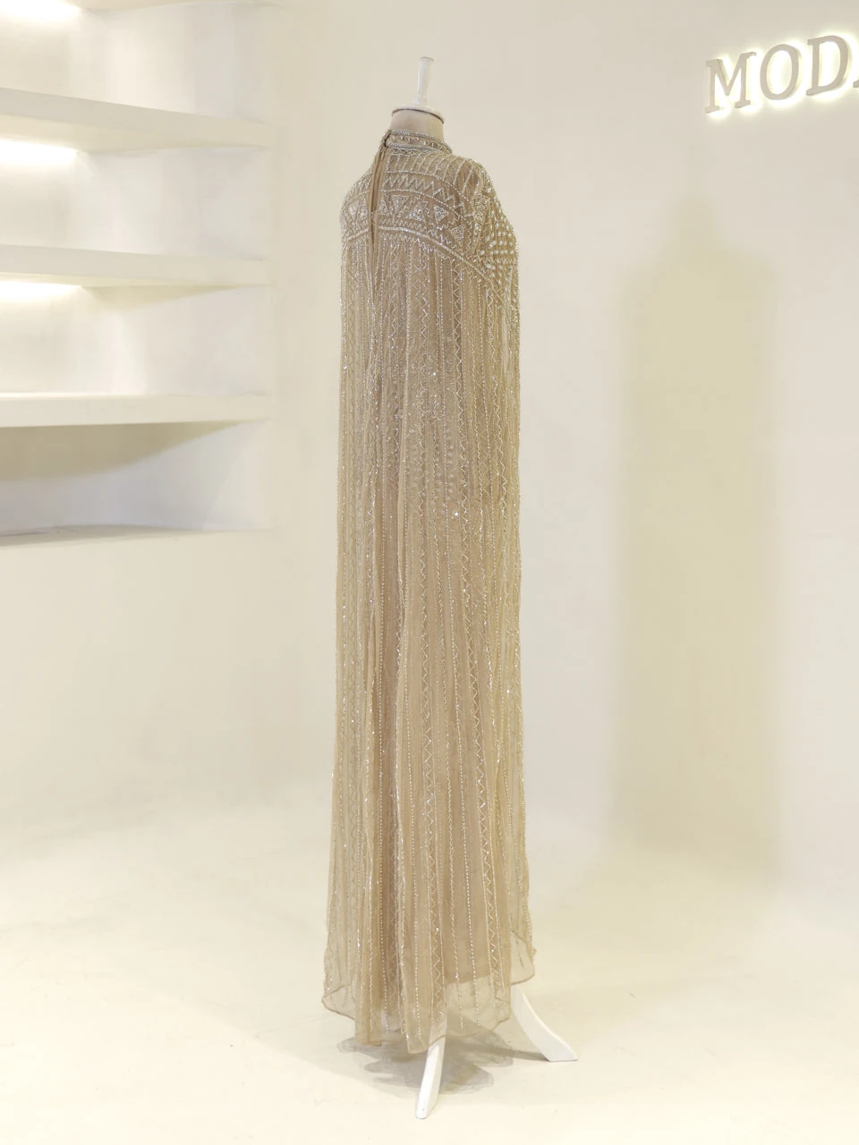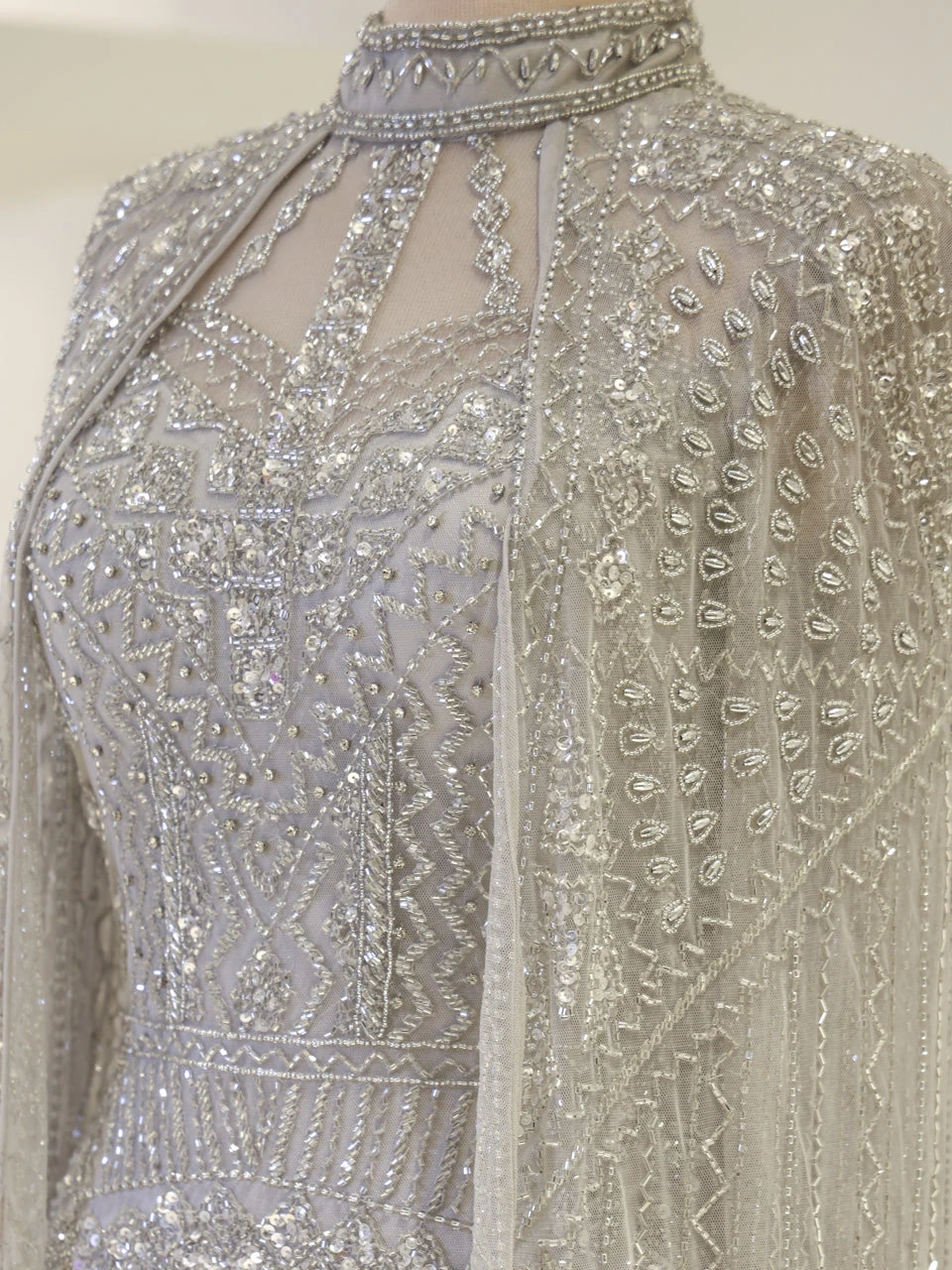 The Couture Bretagne Evening Dress features a full-length design with an average length of 165 cm. It includes a non-detachable cape detail and is crafted from embroidered stretch fabric. The dress is lined and has a pencil skirt form. The back is equipped with a zipper closure, and the chest area is designed with a transparent section.