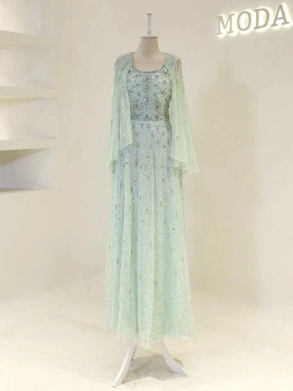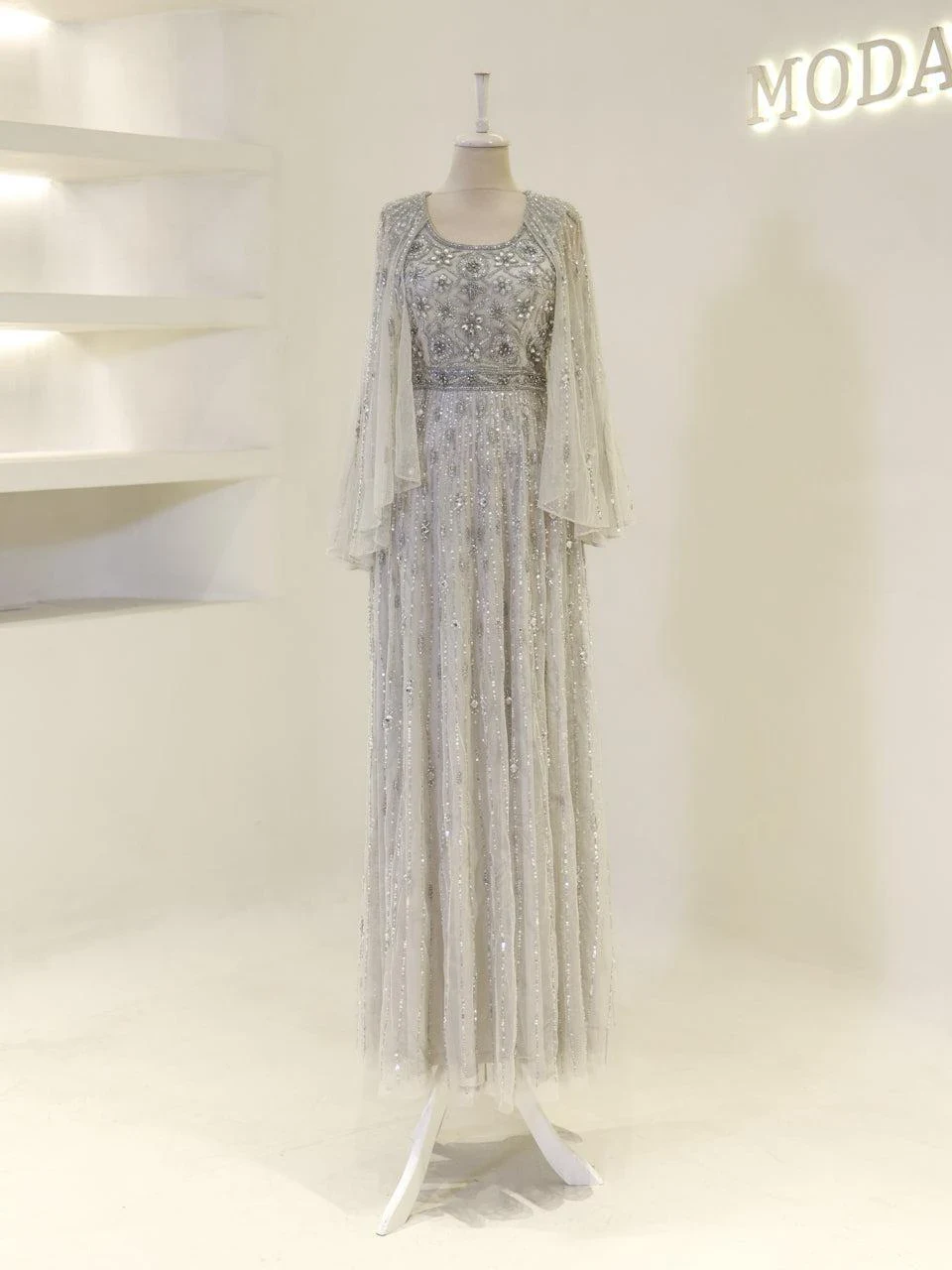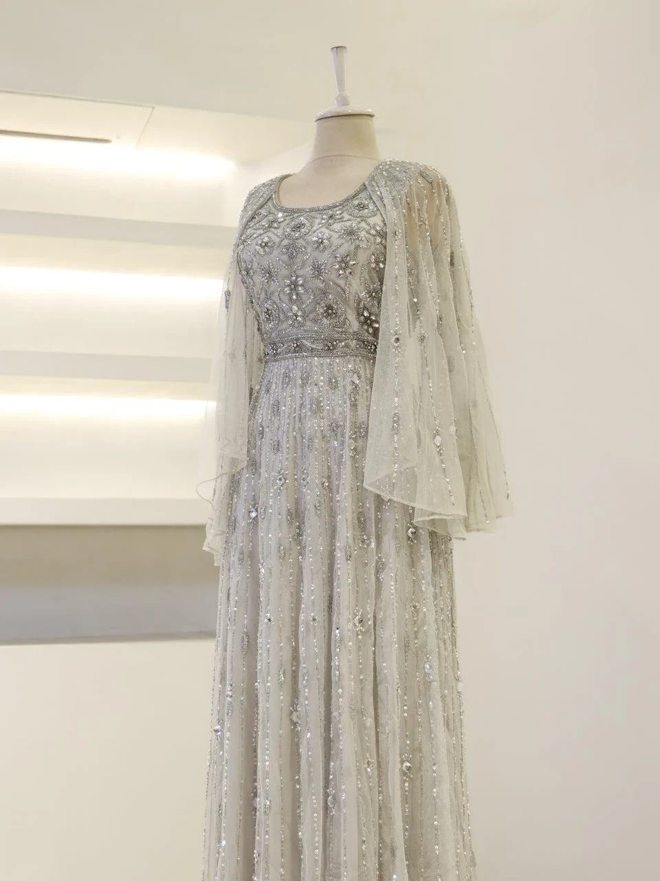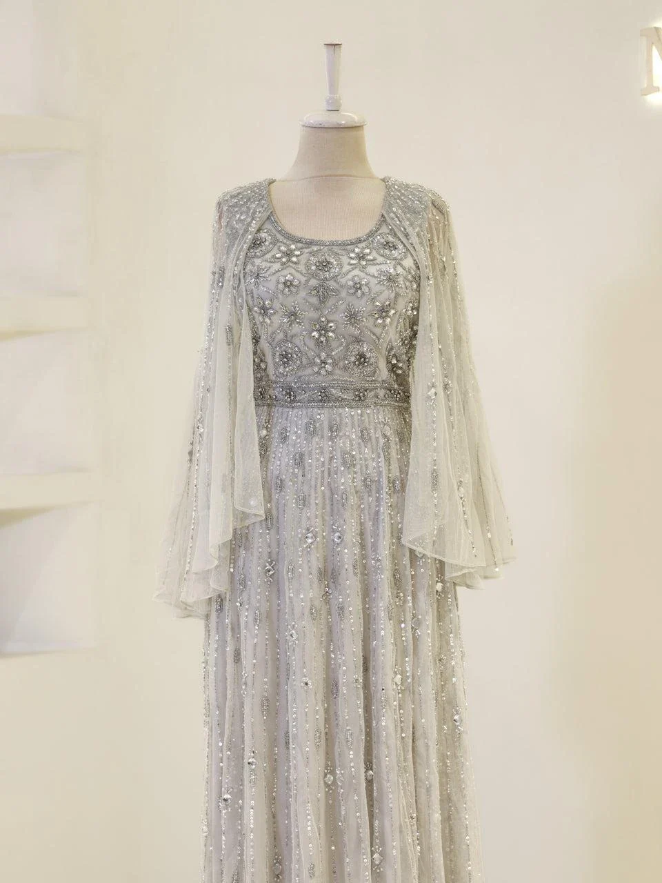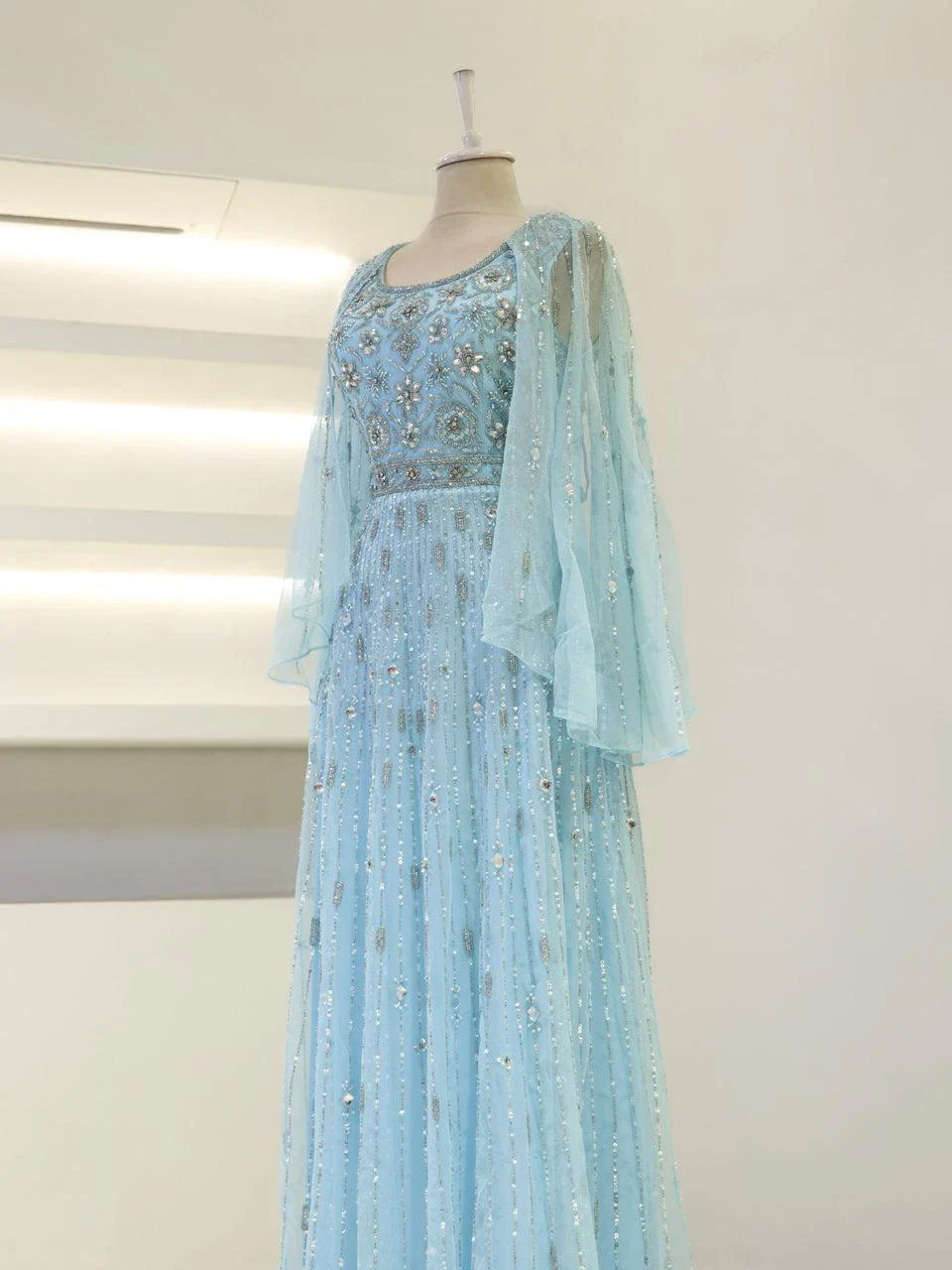 The Couture Cindy Evening Dress is designed with precision to fit true to size. It features an average length of 165 cm and is crafted from embroidered fabric, offering a sophisticated look. The dress is fully lined and includes a back zipper for easy wear. It has a wide neckline and transparent Spanish-style sleeves, complemented by a flared skirt design.