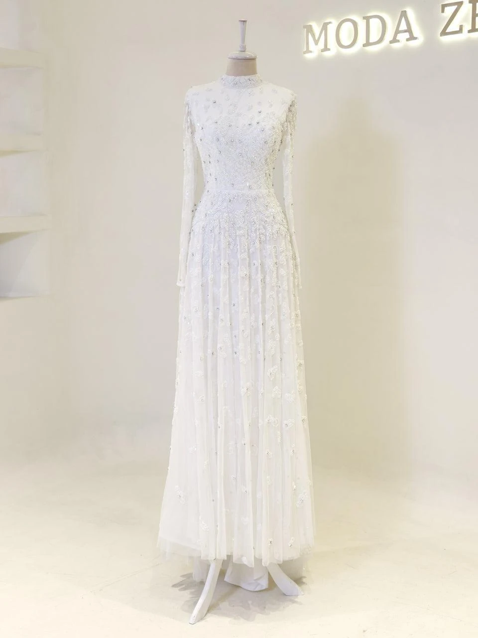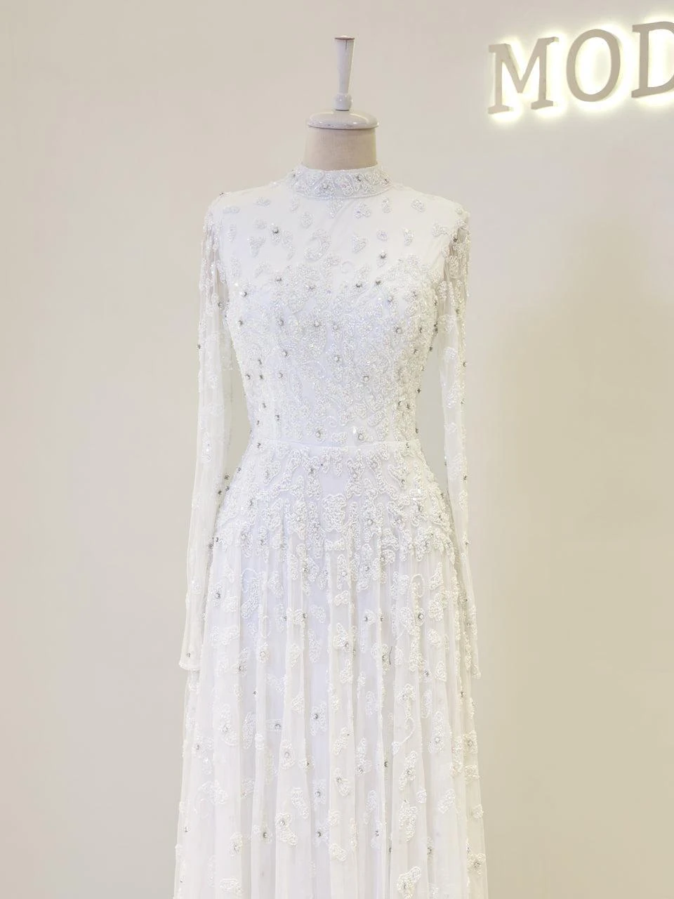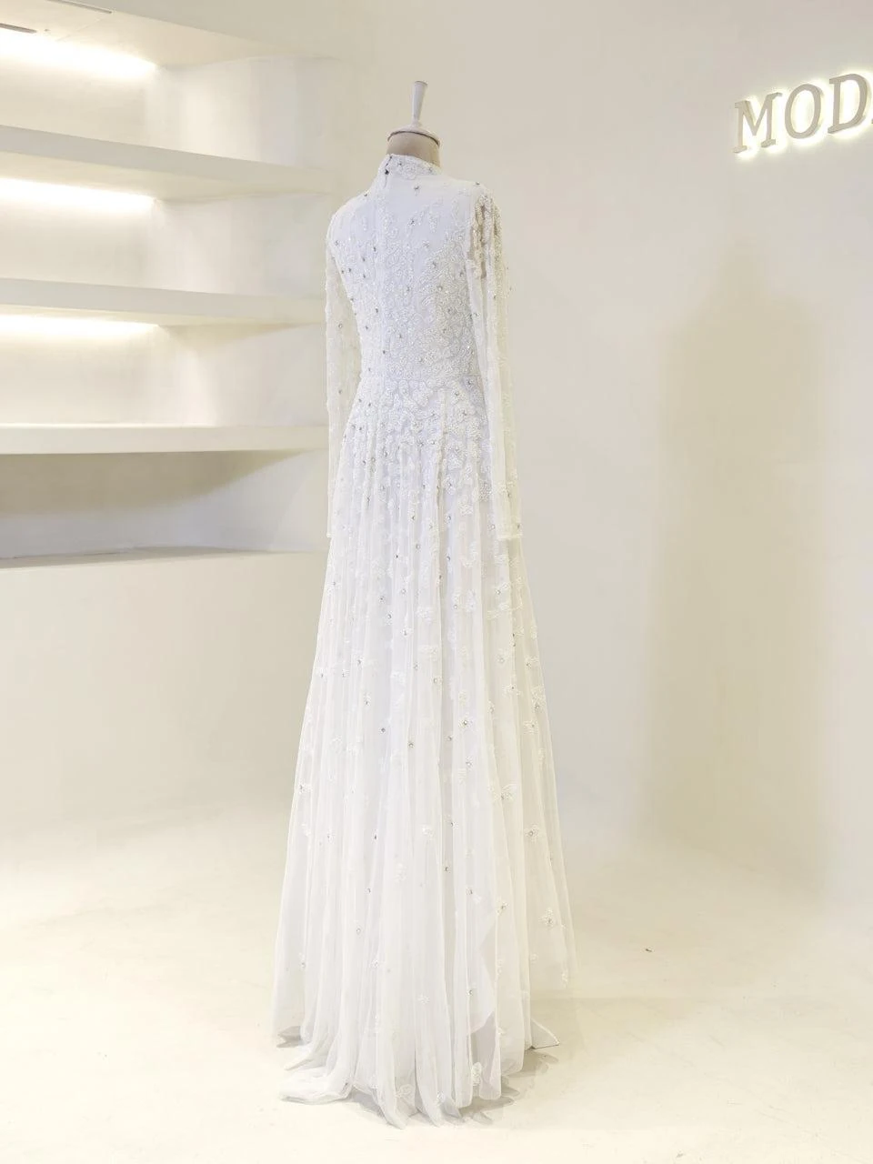 The Couture Derel Modest Evening Dress offers a tailored fit and an average length of 160 cm. It features a train and is fully lined, with non-adhesive embellishments. The dress includes a built-in bust pad and a mandarin collar, and it is fastened with a back zipper. The sleeves are transparent, and the skirt has a flared design. Note: Upon request, the transparent sleeve details can be covered. For more information, please contact our WhatsApp line at +90 553 978 48 86.