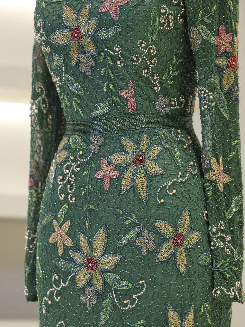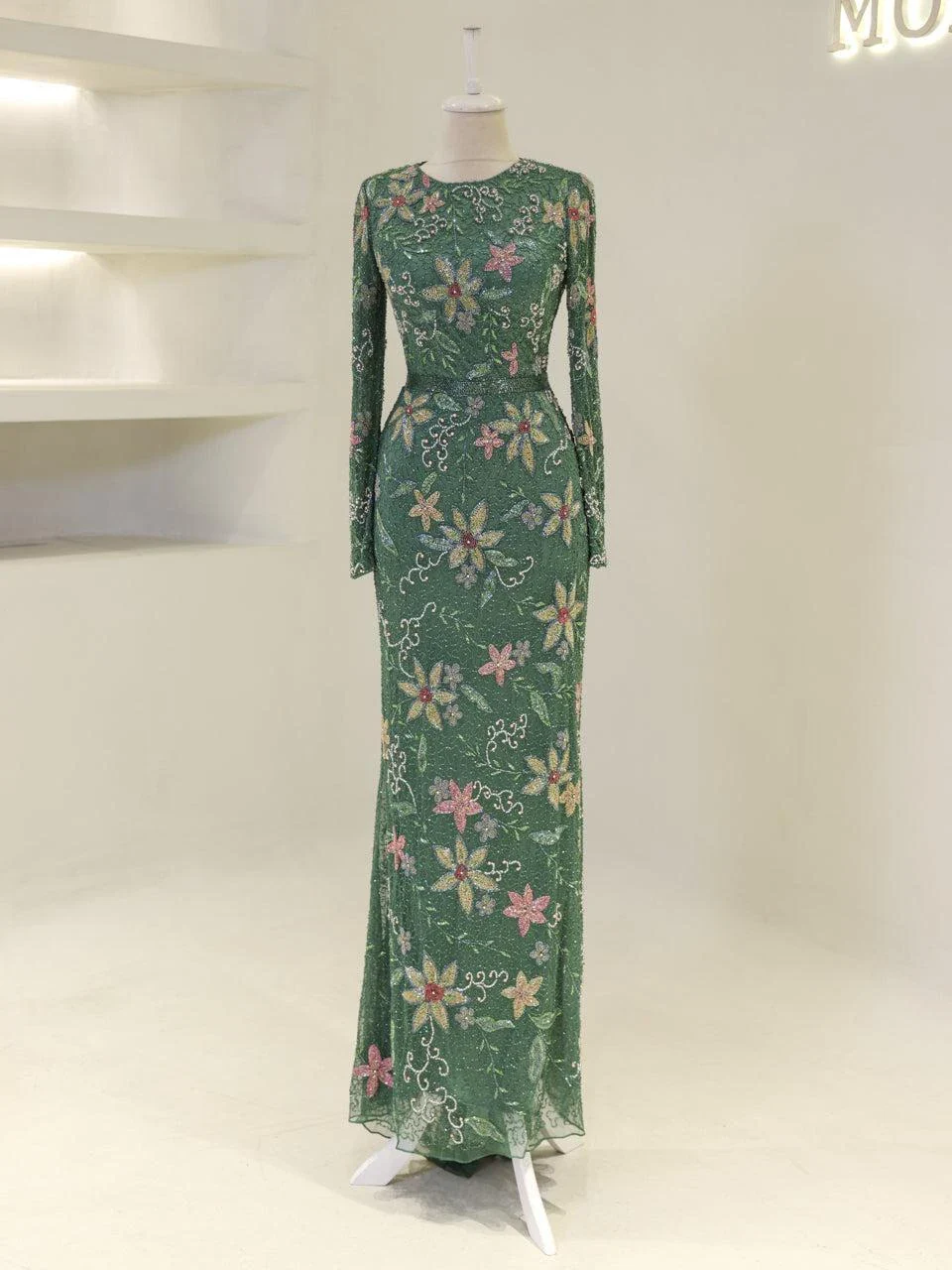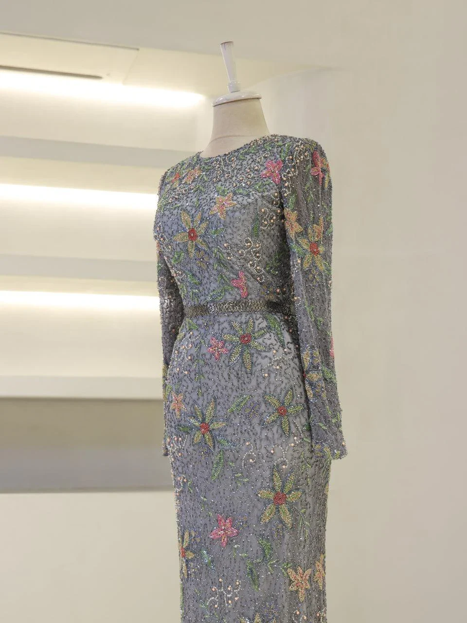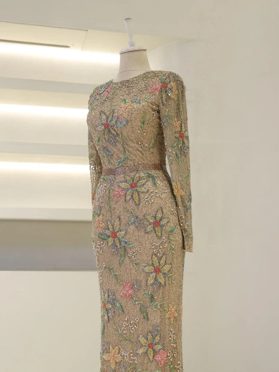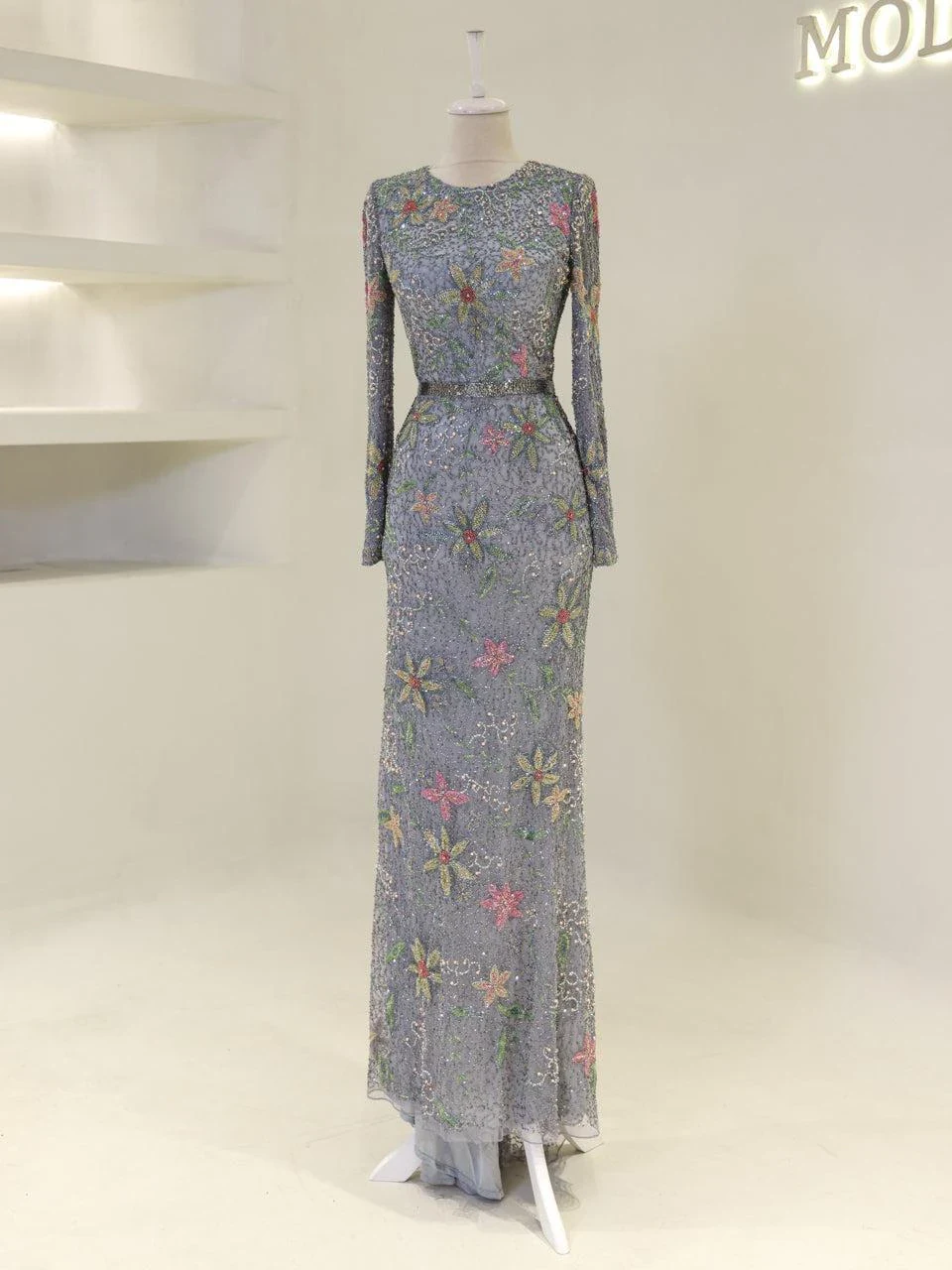 The Couture Elina Modest Evening Dress offers a precise fit with a front length of 170 cm and a back length of 195 cm. It features an oval neckline and is fully lined for comfort. The dress is secured with a back zipper and is adorned with non-adhesive embellishments. The sleeves are transparent, adding a touch of sophistication, and the dress has a pencil silhouette. Note: Upon request, the transparent sleeve details can be covered. For pricing information, please contact us via WhatsApp at -.