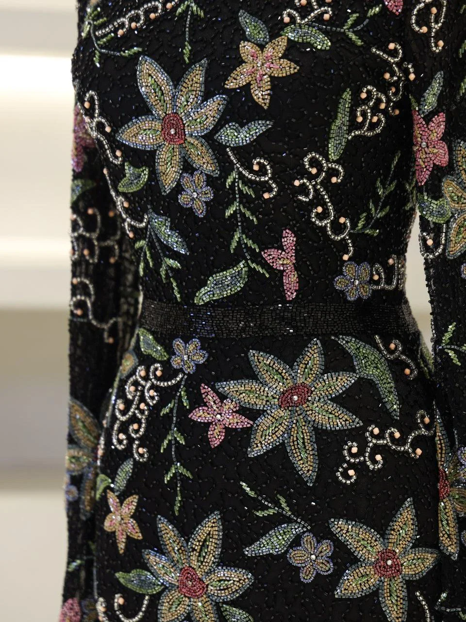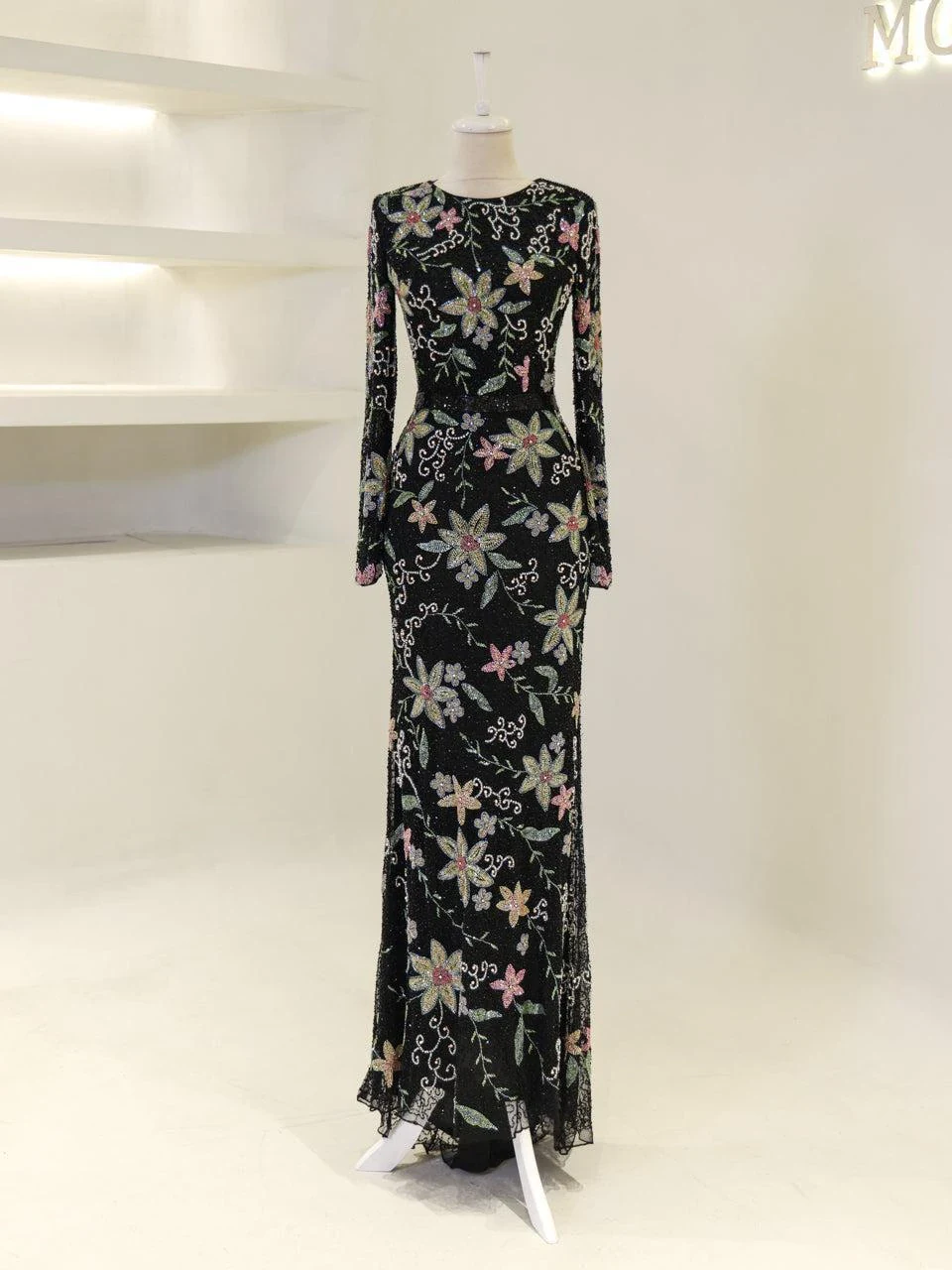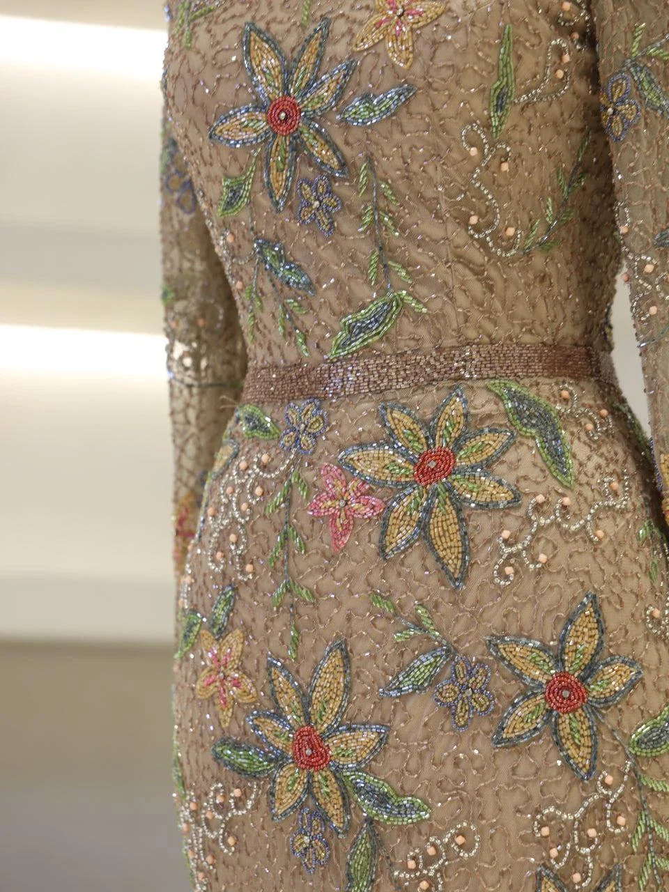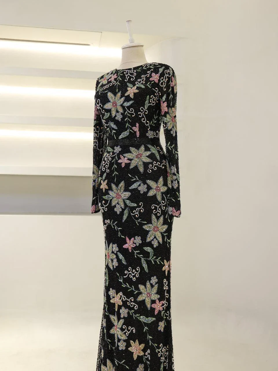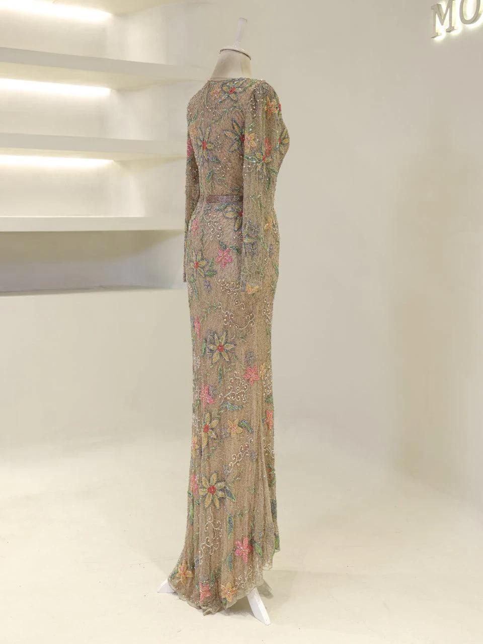 The Couture Elina Modest Evening Dress offers a precise fit with a front length of 170 cm and a back length of 195 cm. It features an oval neckline and is fully lined for comfort. The dress is secured with a back zipper and is adorned with non-adhesive embellishments. The sleeves are transparent, adding a touch of sophistication, and the dress has a pencil silhouette. Note: Upon request, the transparent sleeve details can be covered. For pricing information, please contact us via WhatsApp at -.