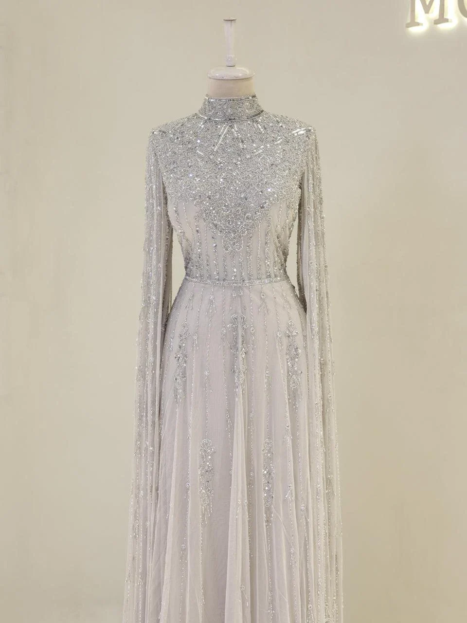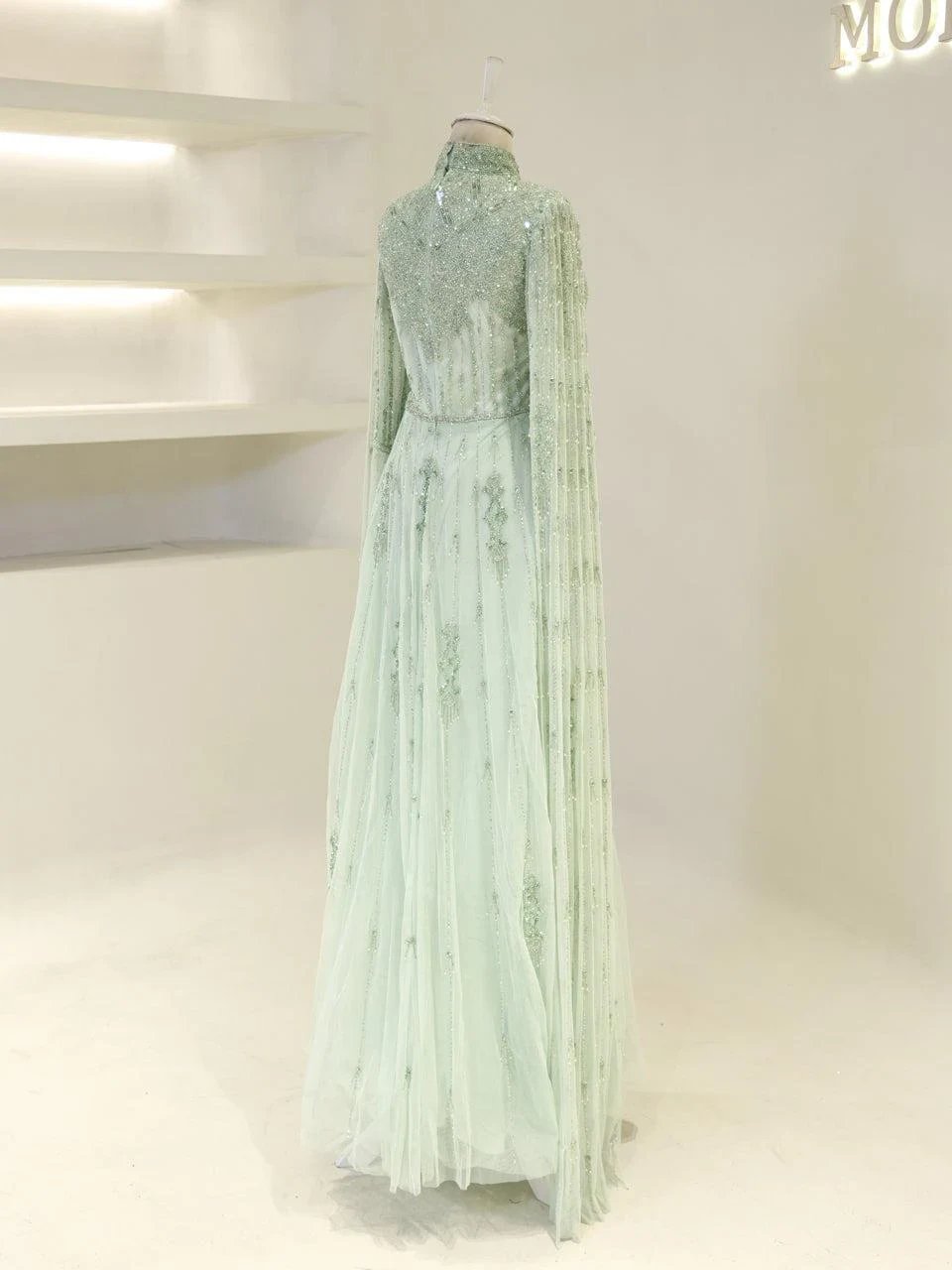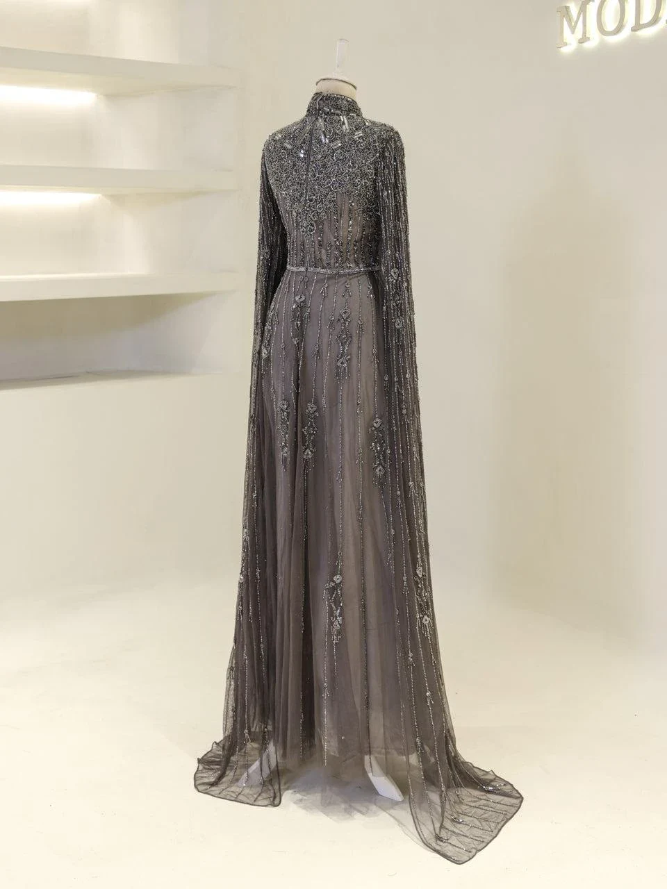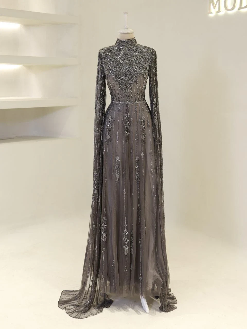 The Couture Evania Modest Evening Dress is designed with precision to fit true to size. It features a length of approximately 160 cm and is adorned with non-adhesive embellishments. The dress includes a lining and a back zipper closure for ease of wear. A distinctive cape detail flows from the shoulders to the hem, adding a touch of elegance. The sleeves are transparent, and the skirt has a flared design. Note: Upon request, the transparent sleeve details can be covered. For more information, please contact our WhatsApp line at -.