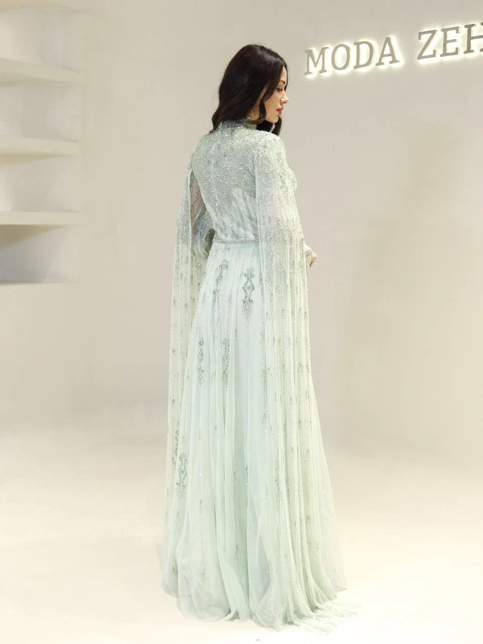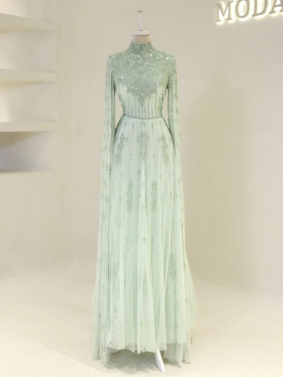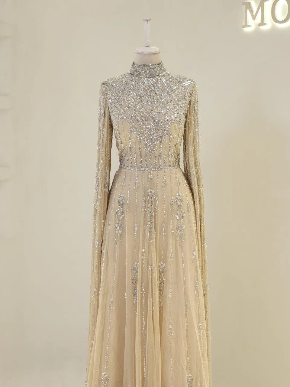 The Couture Evania Modest Evening Dress is designed with precision to fit true to size. It features a length of approximately 160 cm and is adorned with non-adhesive embellishments. The dress includes a lining and a back zipper closure for ease of wear. A distinctive cape detail flows from the shoulders to the hem, adding a touch of elegance. The sleeves are transparent, and the skirt has a flared design. Note: Upon request, the transparent sleeve details can be covered. For more information, please contact our WhatsApp line at -.