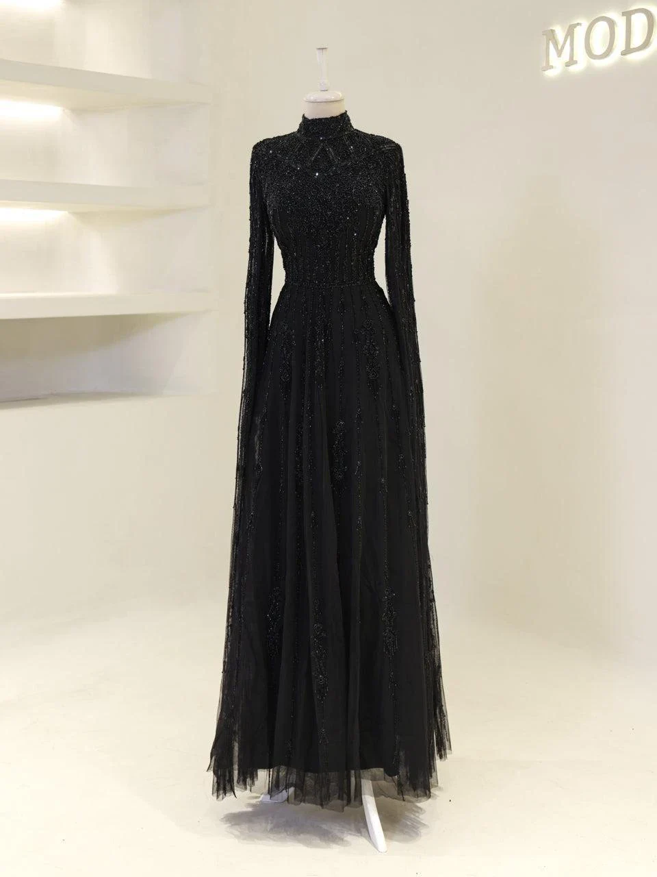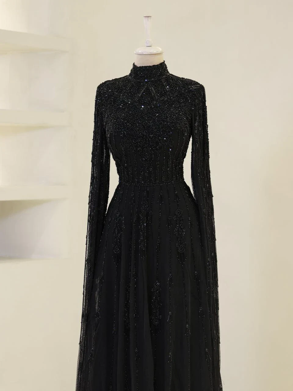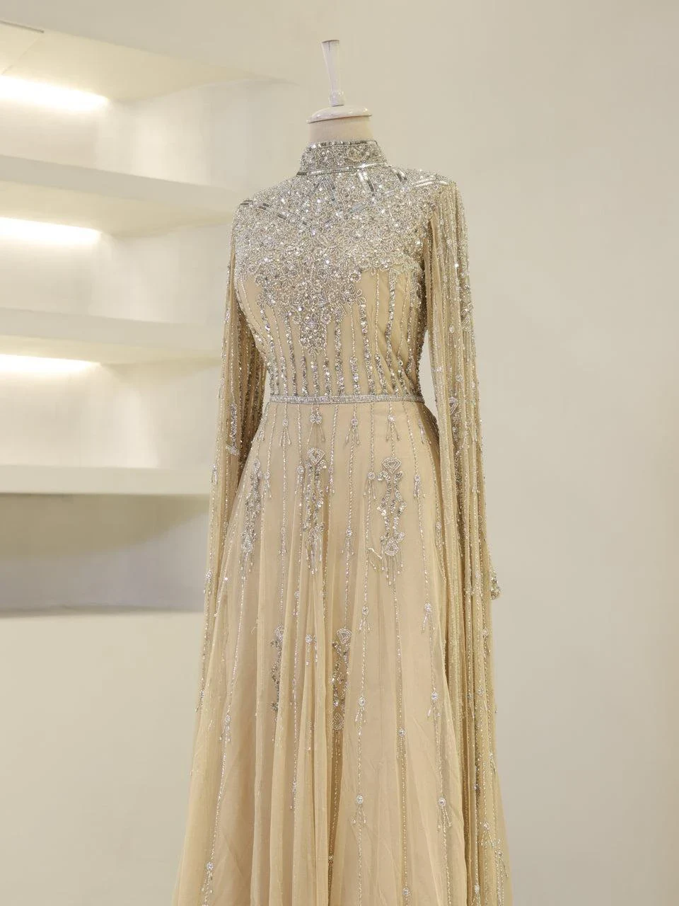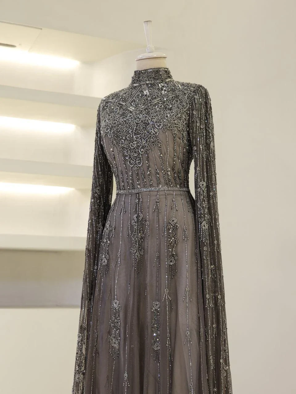 The Couture Evania Modest Evening Dress is designed with precision to fit true to size. It features a length of approximately 160 cm and is adorned with non-adhesive embellishments. The dress includes a lining and a back zipper closure for ease of wear. A distinctive cape detail flows from the shoulders to the hem, adding a touch of elegance. The sleeves are transparent, and the skirt has a flared design. Note: Upon request, the transparent sleeve details can be covered. For more information, please contact our WhatsApp line at -.
