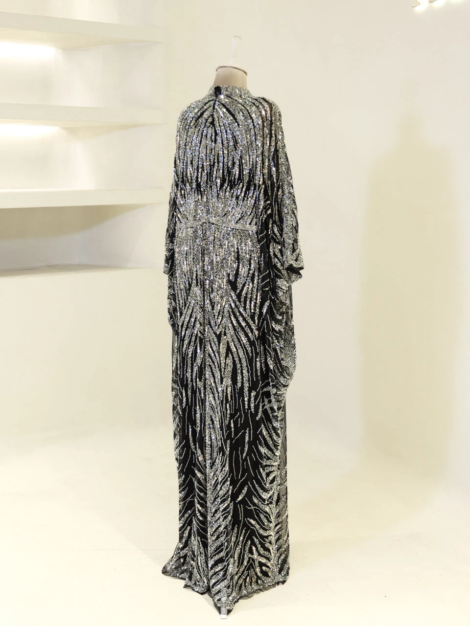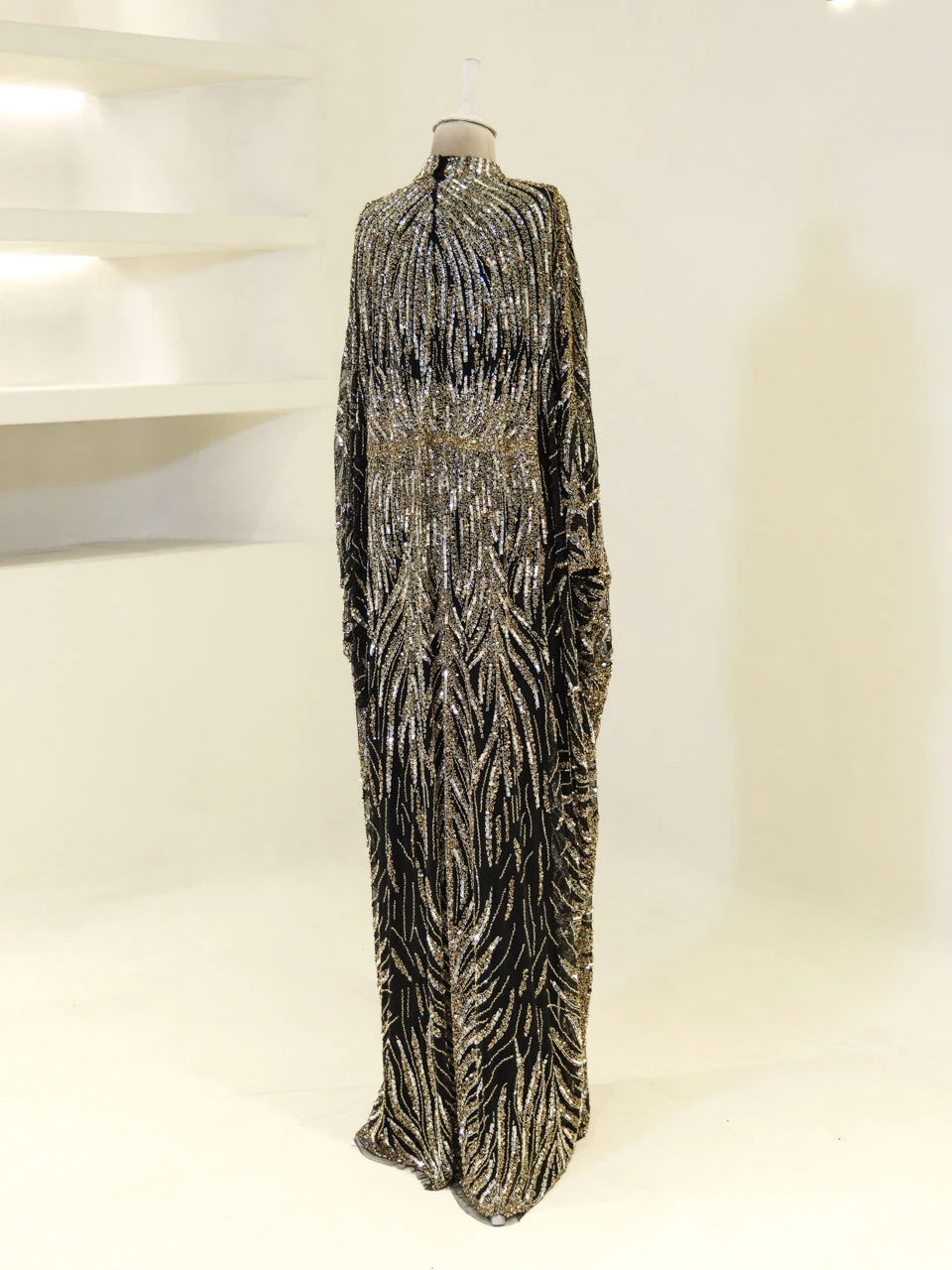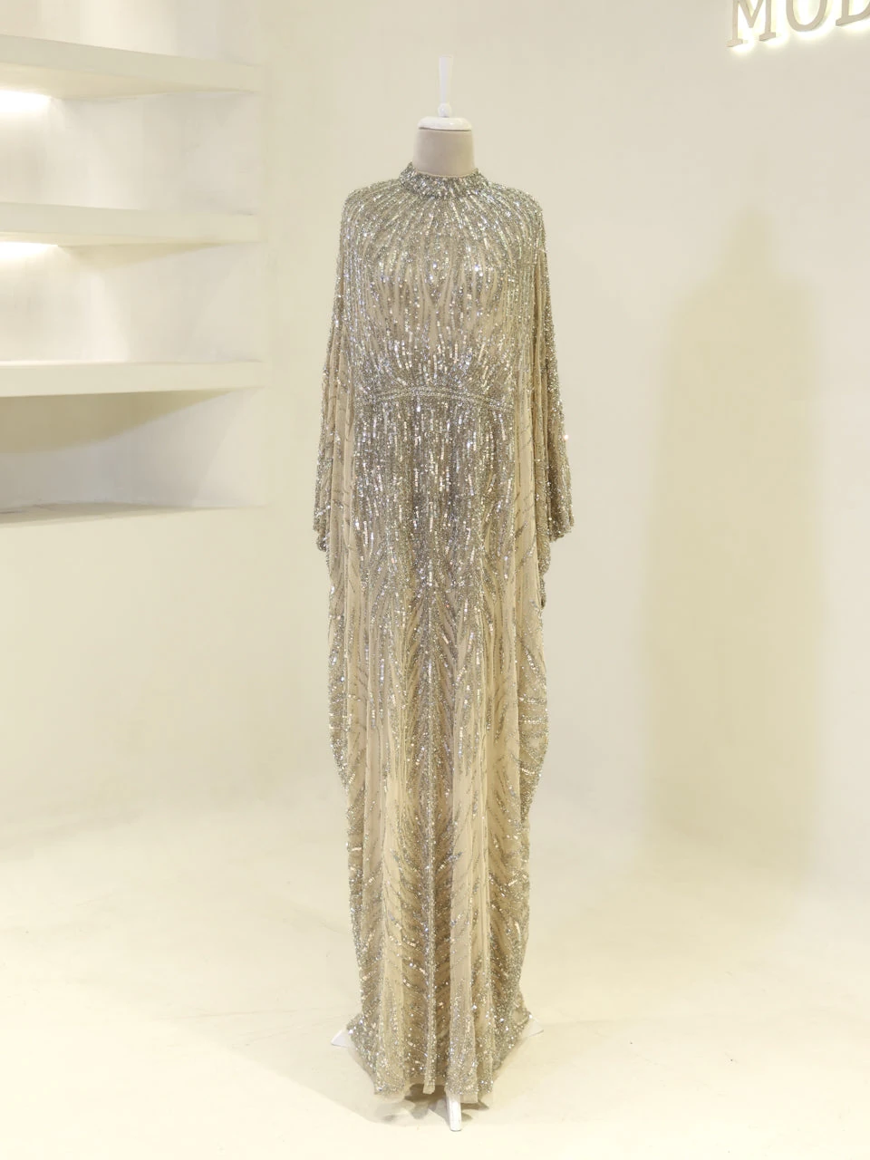 The Couture Foggia Evening Dress is designed with a standard fit and measures approximately 160 cm in length. It features an embroidered stretch fabric that offers both style and comfort. The inner dress is sleeveless, while the cape comes with batwing sleeves. The cape detail is not detachable, providing a seamless look. The dress is fully lined and has a straight skirt form, making it suitable for various formal occasions.