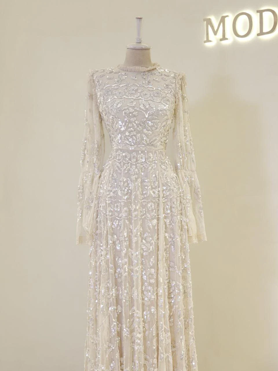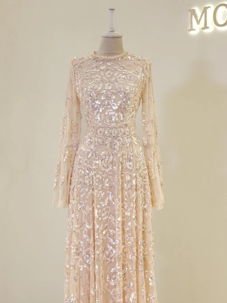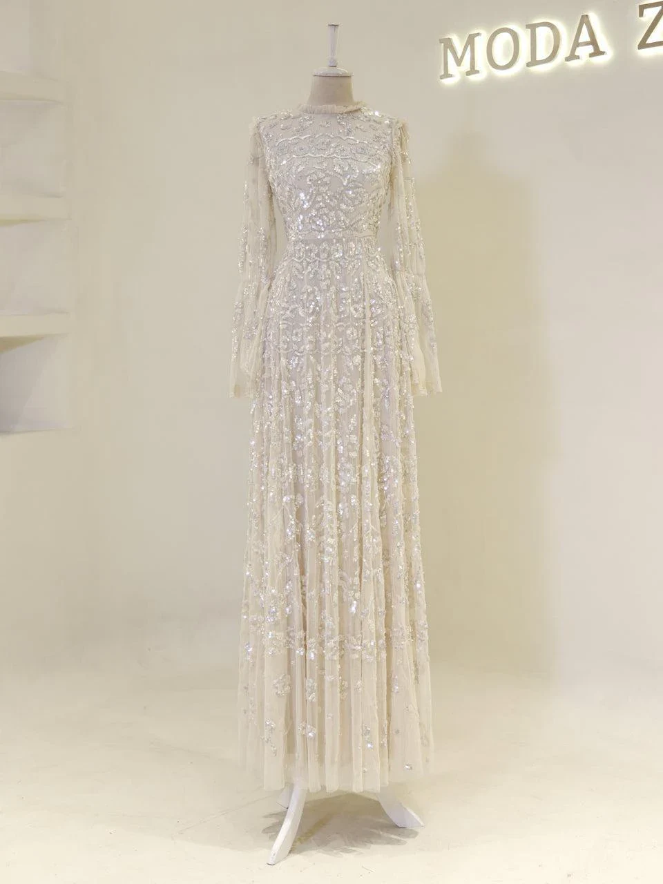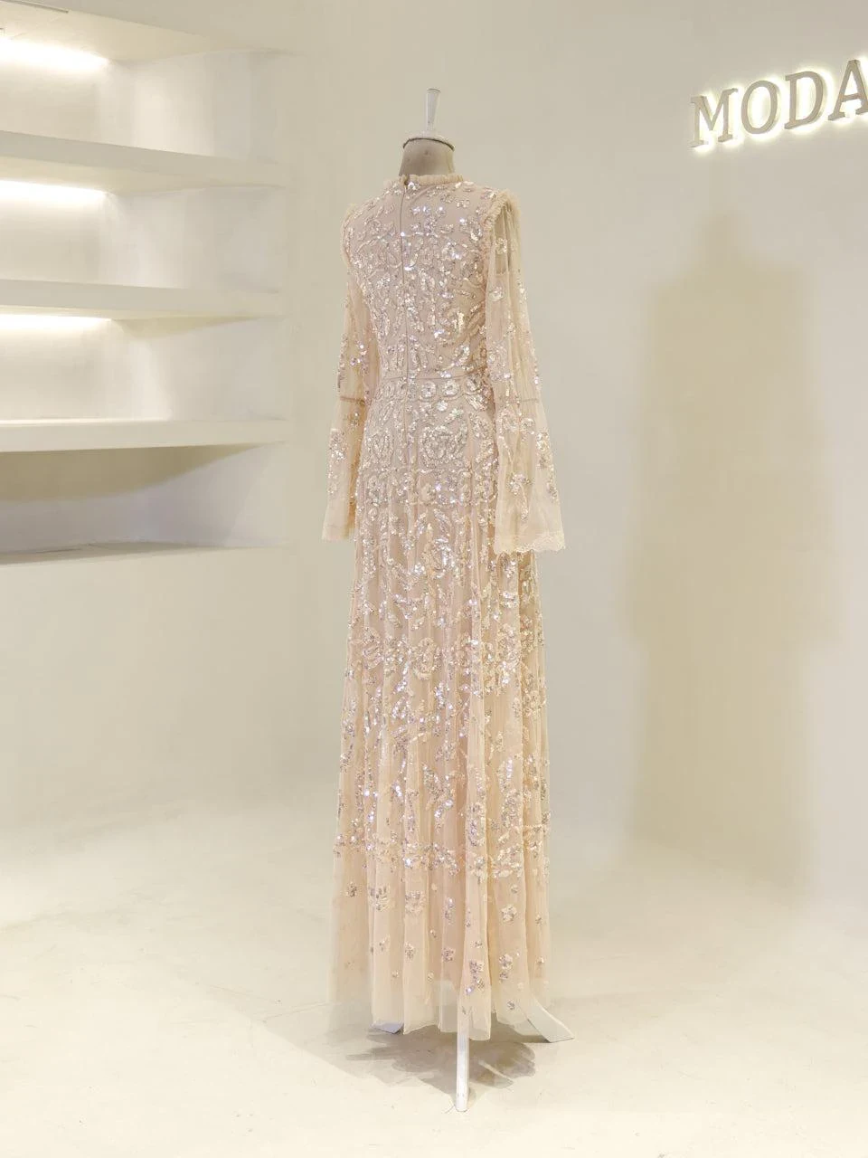 The Couture Goldie Modest Evening Dress is designed with a true-to-size fit and an average length of 170 cm. The dress features non-adhesive embellishments and is fully lined for comfort. It has a back zipper closure and transparent sleeves. The skirt is designed with a voluminous, layered structure. Note: Upon request, the transparent sleeve details can be covered. For more information, please contact our WhatsApp line at -.