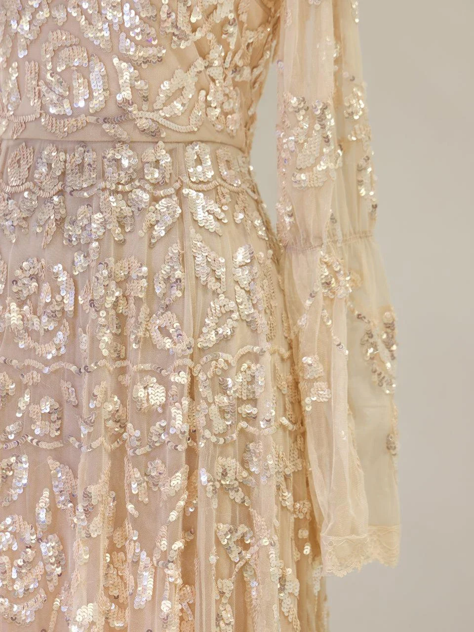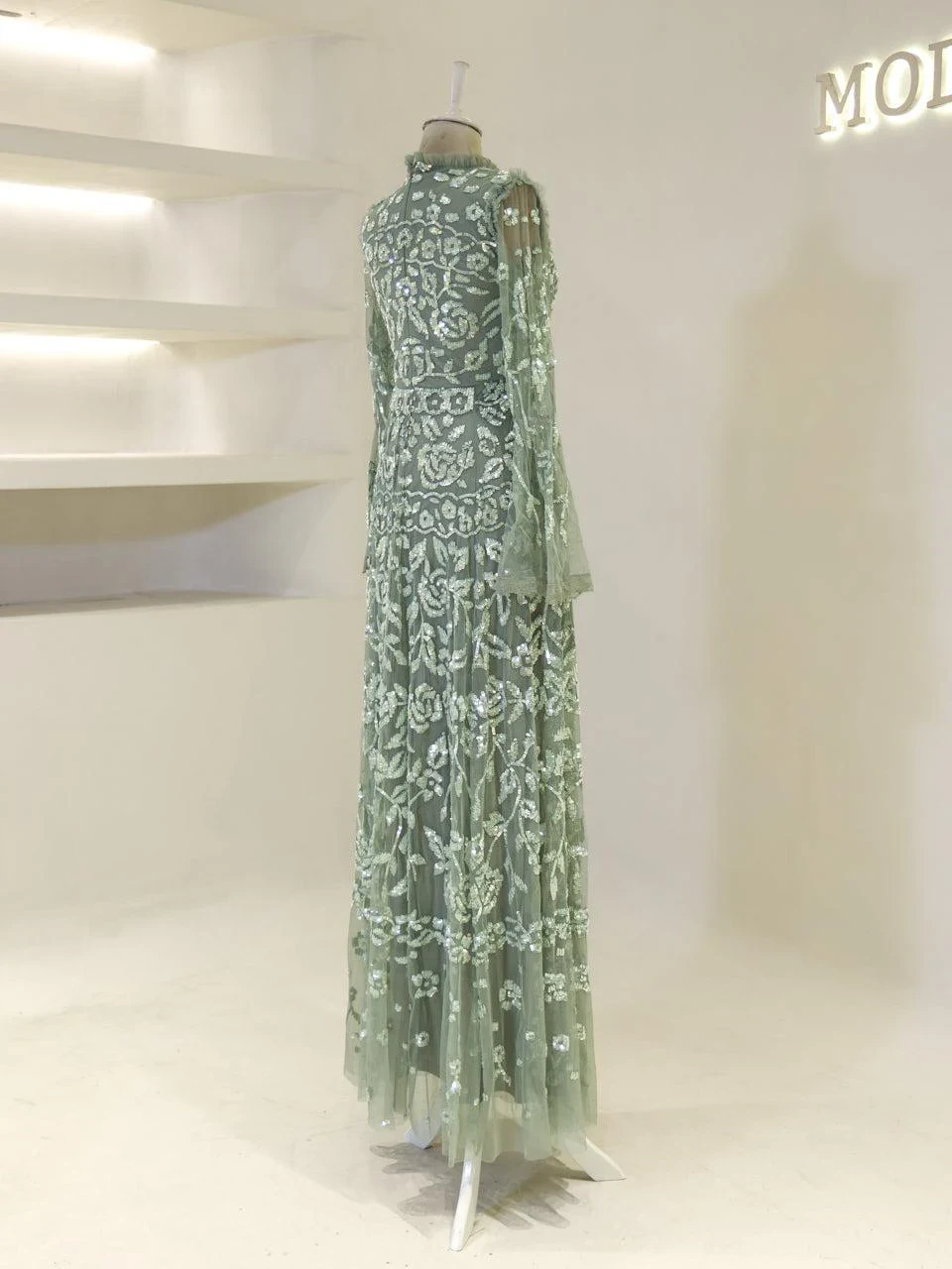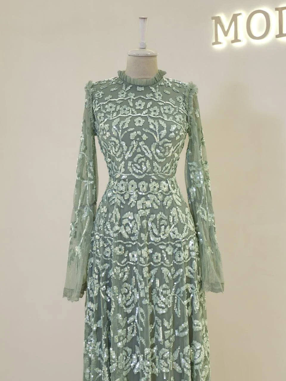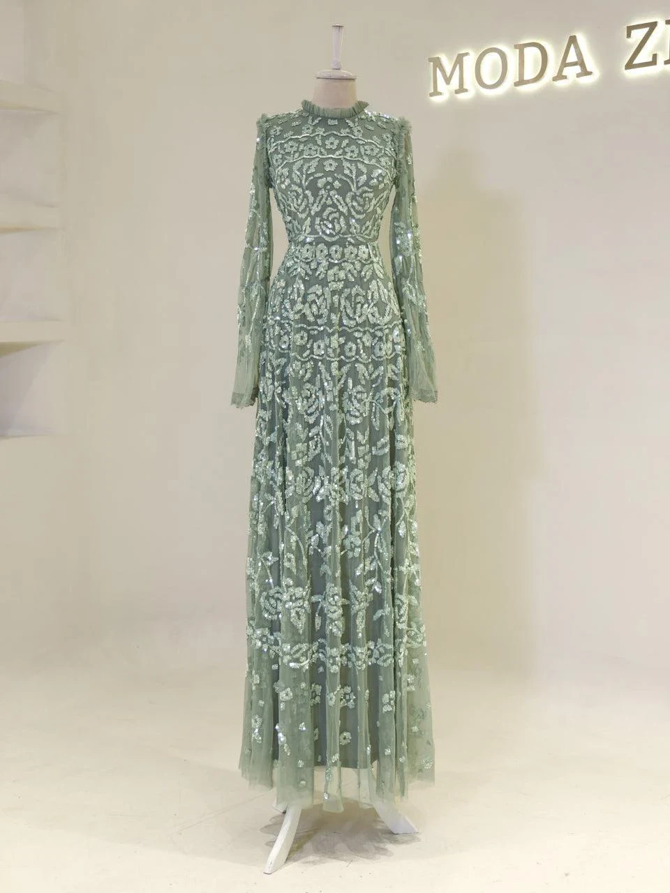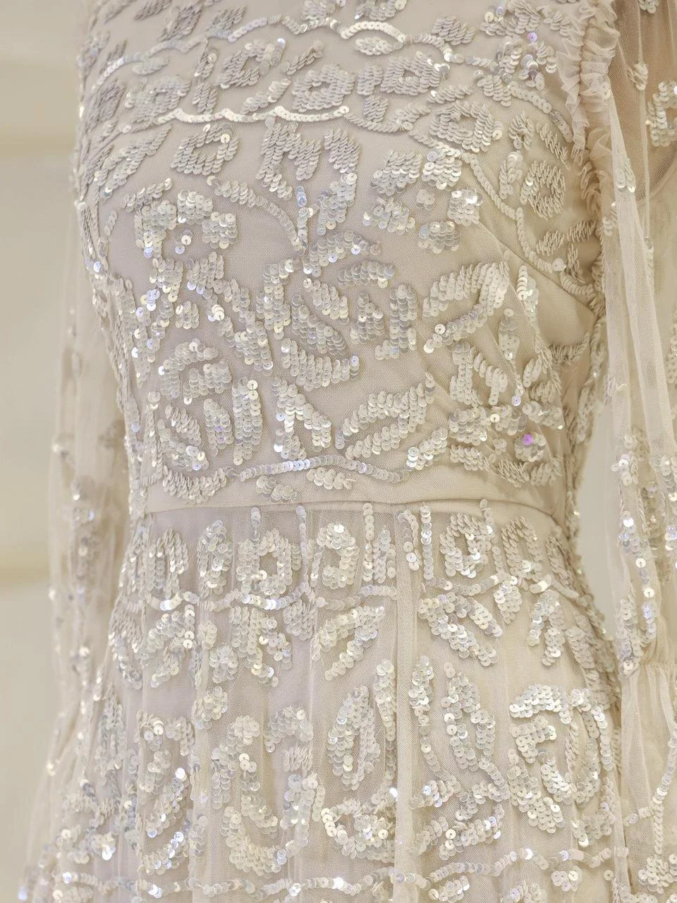 The Couture Goldie Modest Evening Dress is designed with a true-to-size fit and an average length of 170 cm. The dress features non-adhesive embellishments and is fully lined for comfort. It has a back zipper closure and transparent sleeves. The skirt is designed with a voluminous, layered structure. Note: Upon request, the transparent sleeve details can be covered. For more information, please contact our WhatsApp line at -.
