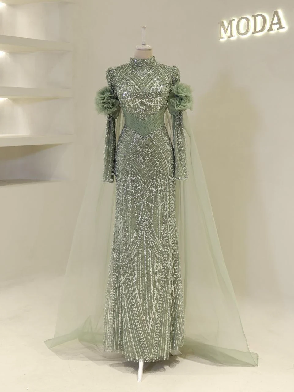 The Hürrem Modest Evening Dress is tailored to your measurements upon order. The average preparation time is 15-20 days. This special design features handcrafted embellishments. For detailed information and remote fitting, please contact us via WhatsApp at -. IMPORTANT: As sizes increase, minor changes in embellishments may occur. NOTE: Since the embellishments are glued, some shedding may happen, but this does not affect the overall appearance.