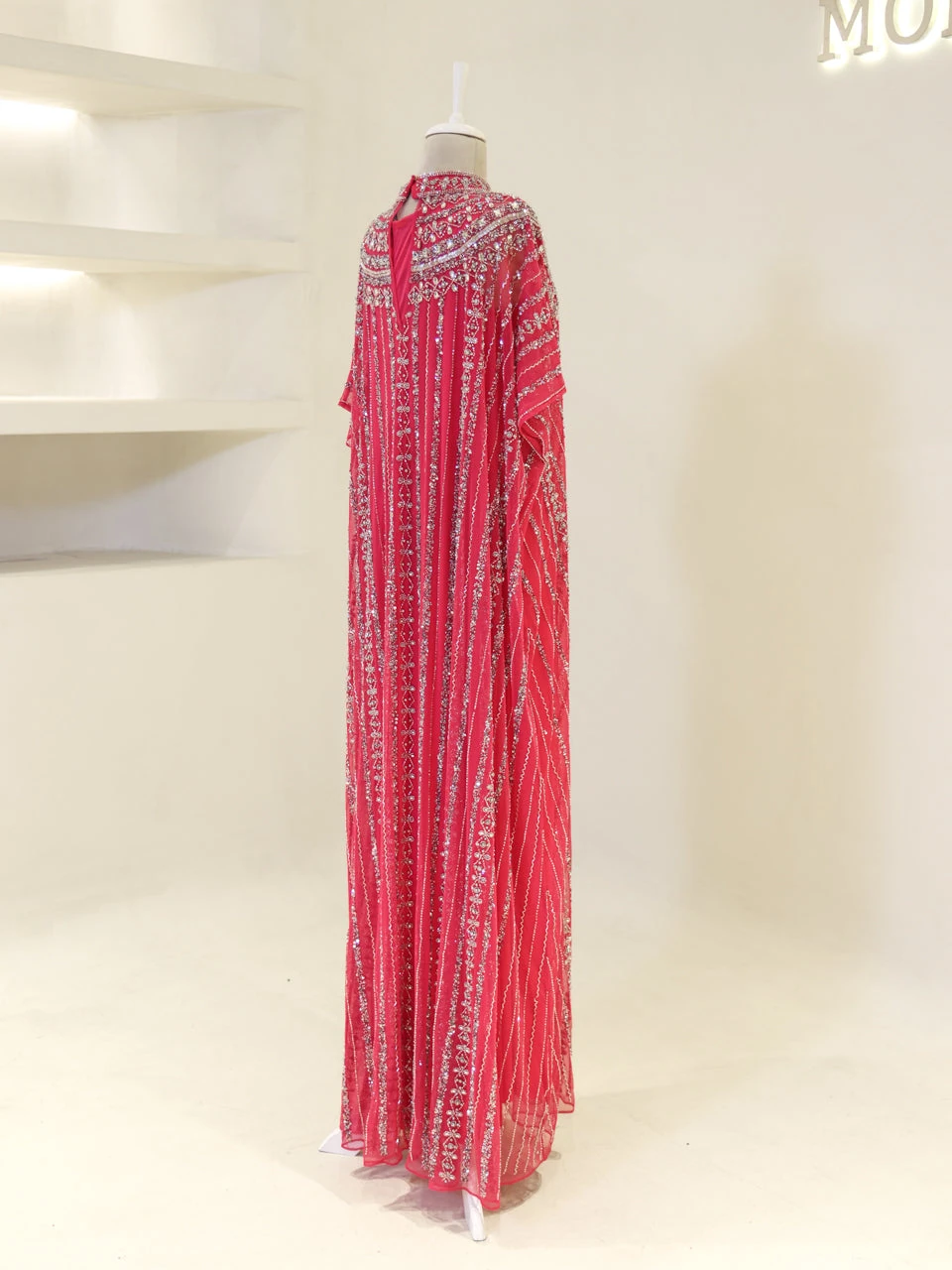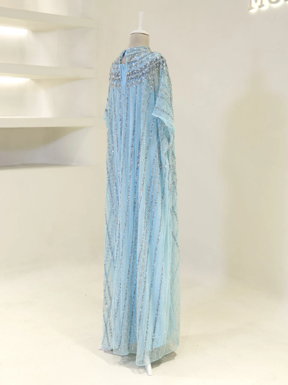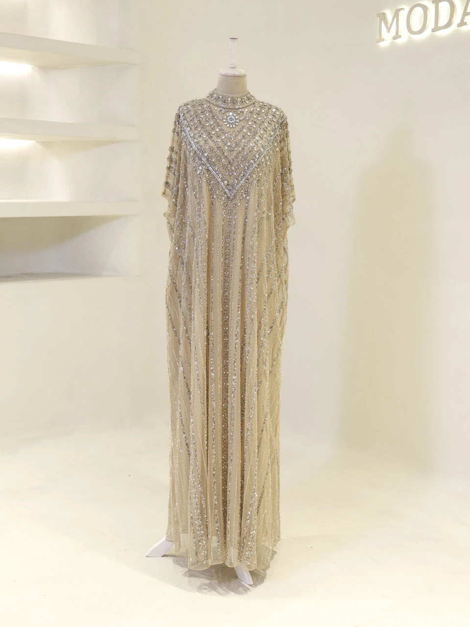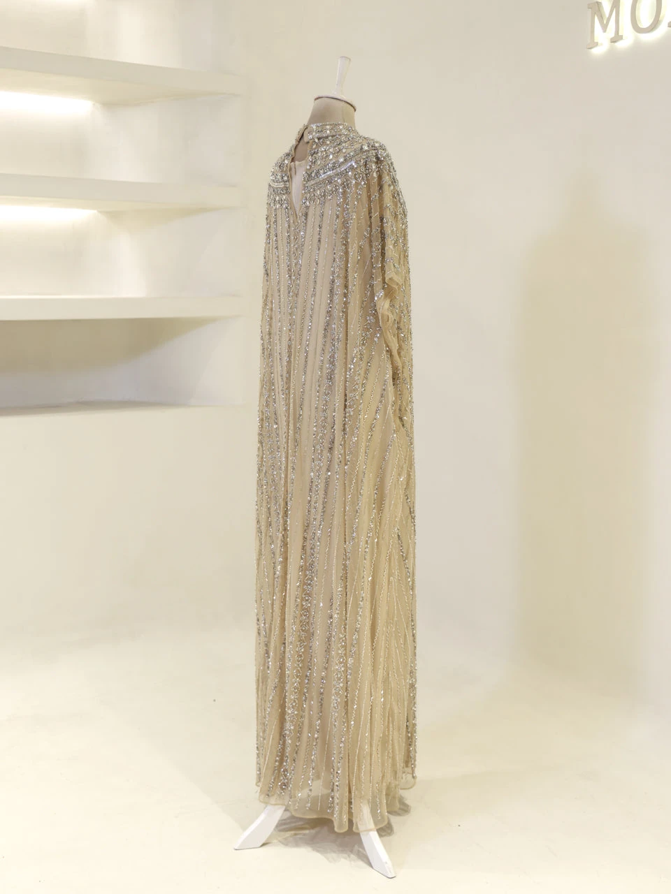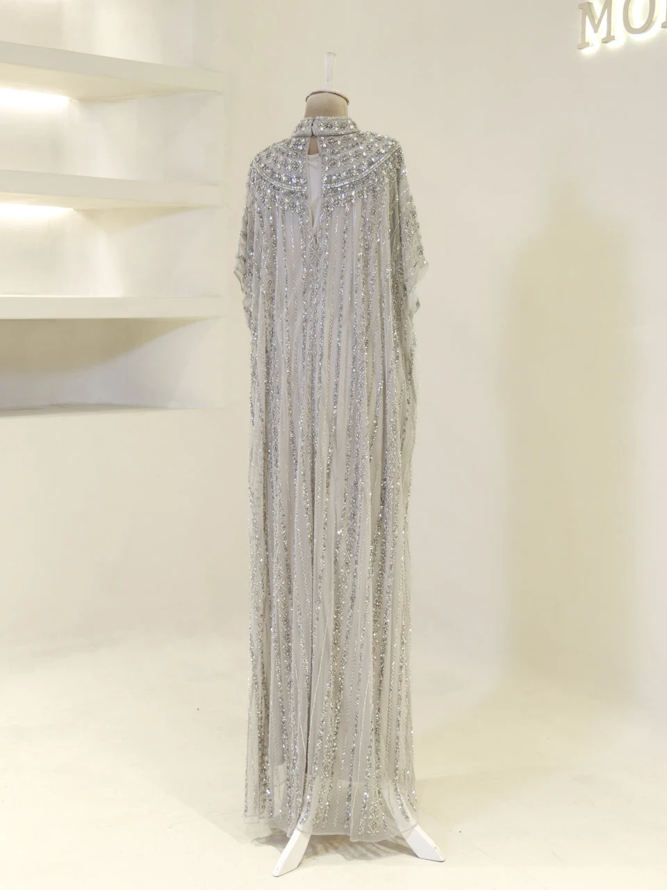 The Couture Isolde Evening Dress is designed with a standard fit and measures approximately 160 cm in length. Made from embroidered stretch fabric, the dress features a sleeveless inner layer and a batwing cape that is not detachable. It is fully lined and has a straight skirt design, offering both comfort and style.