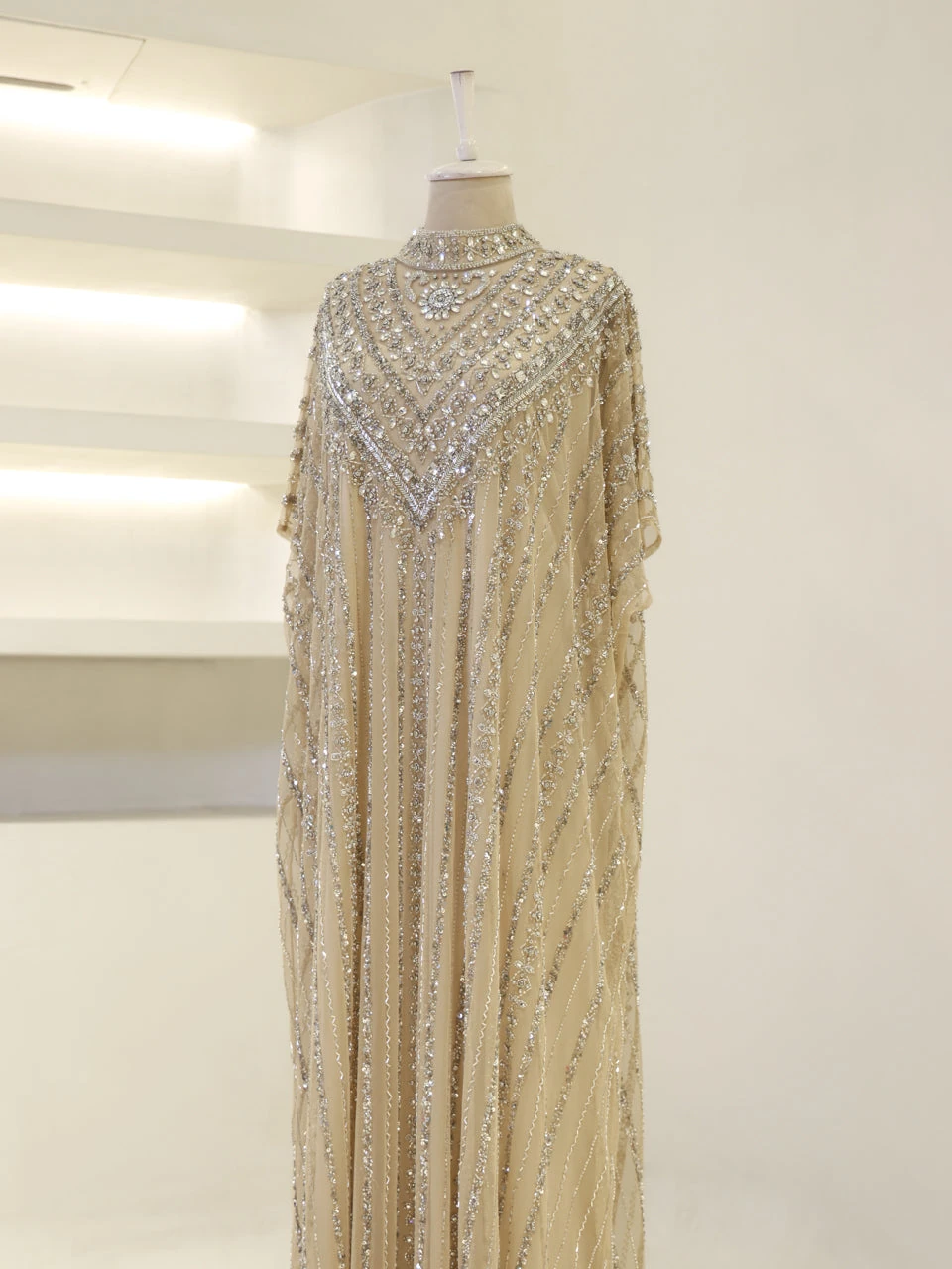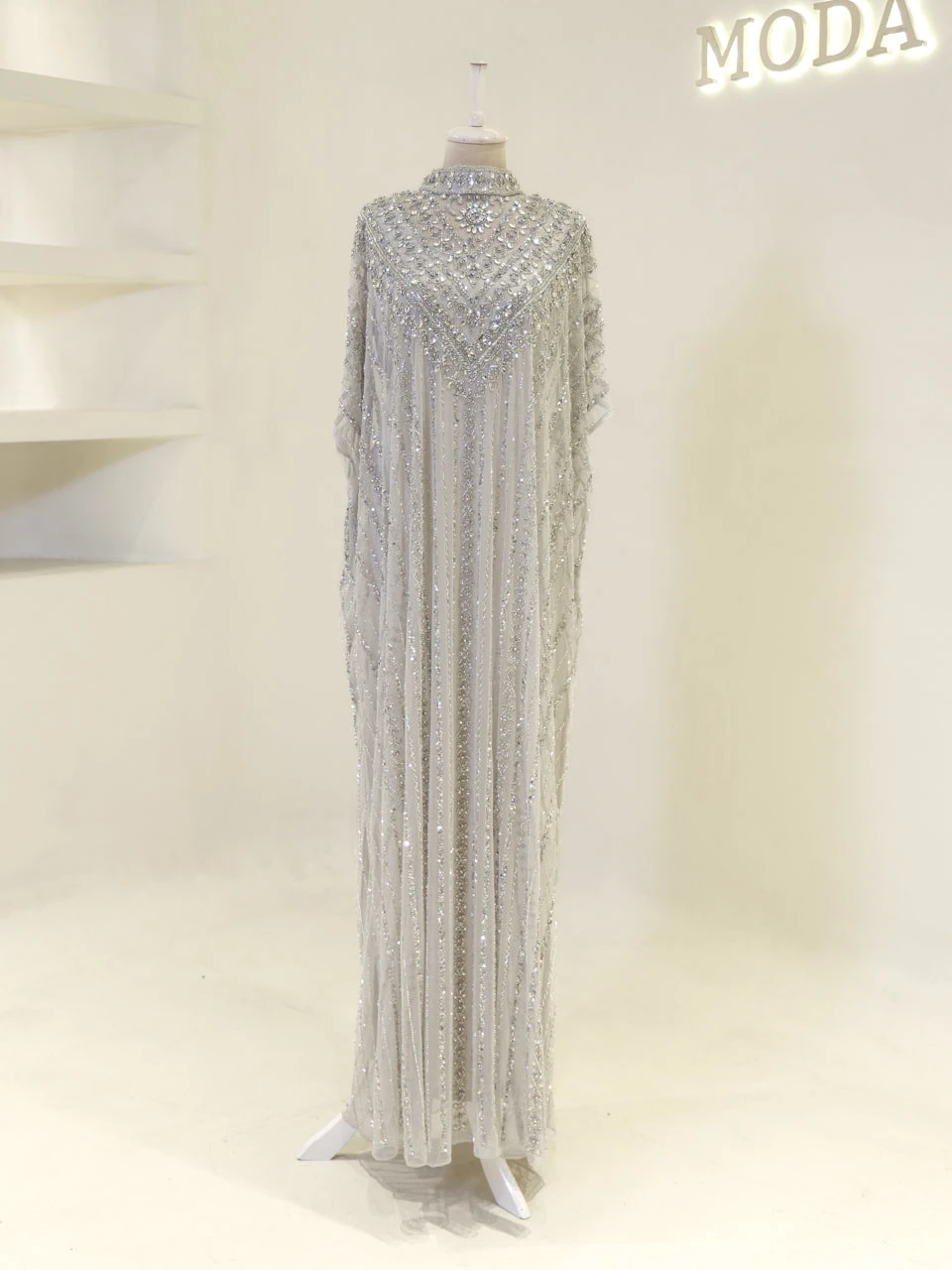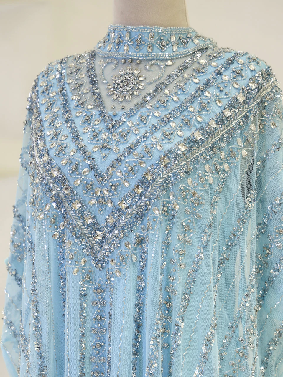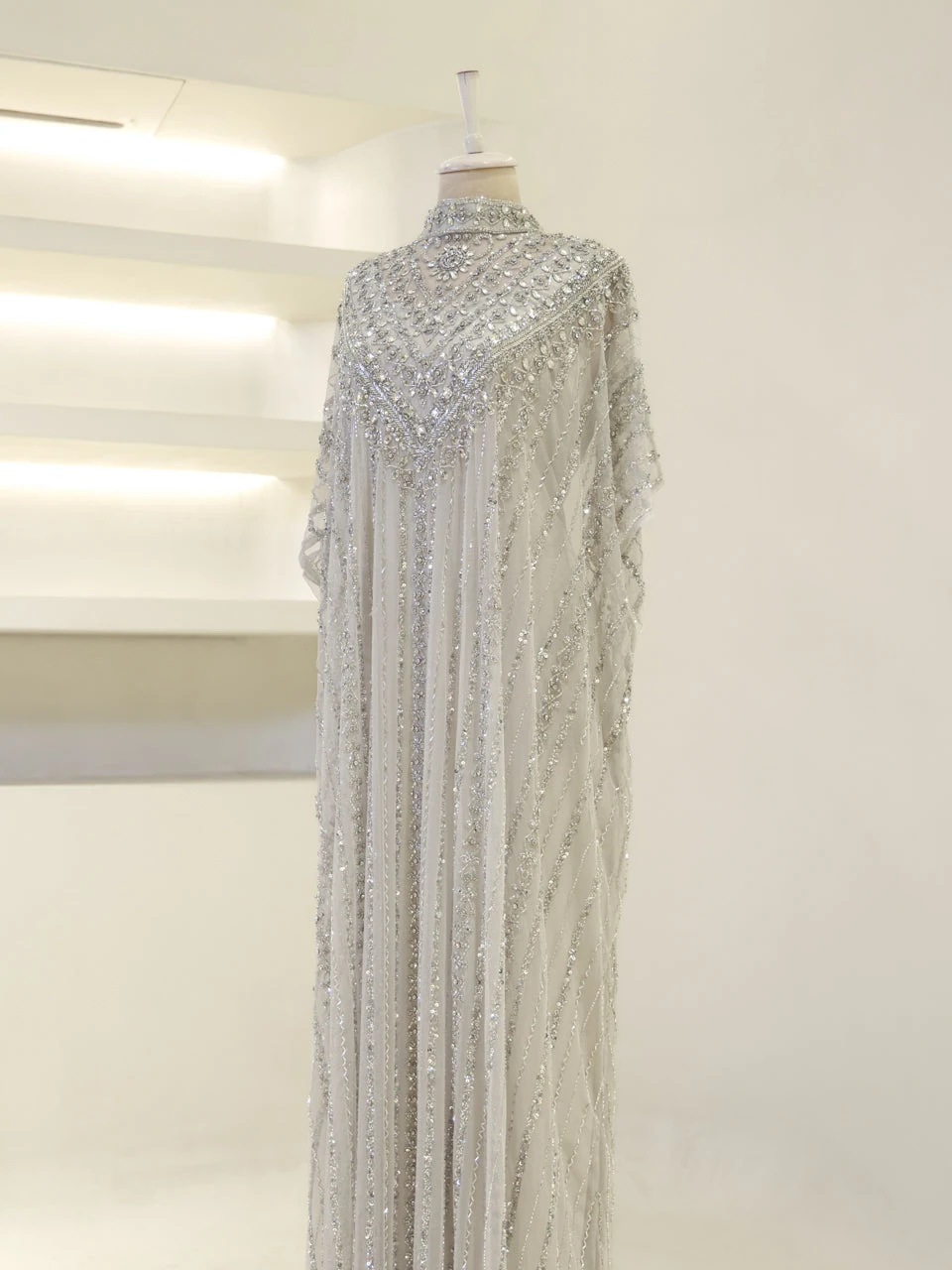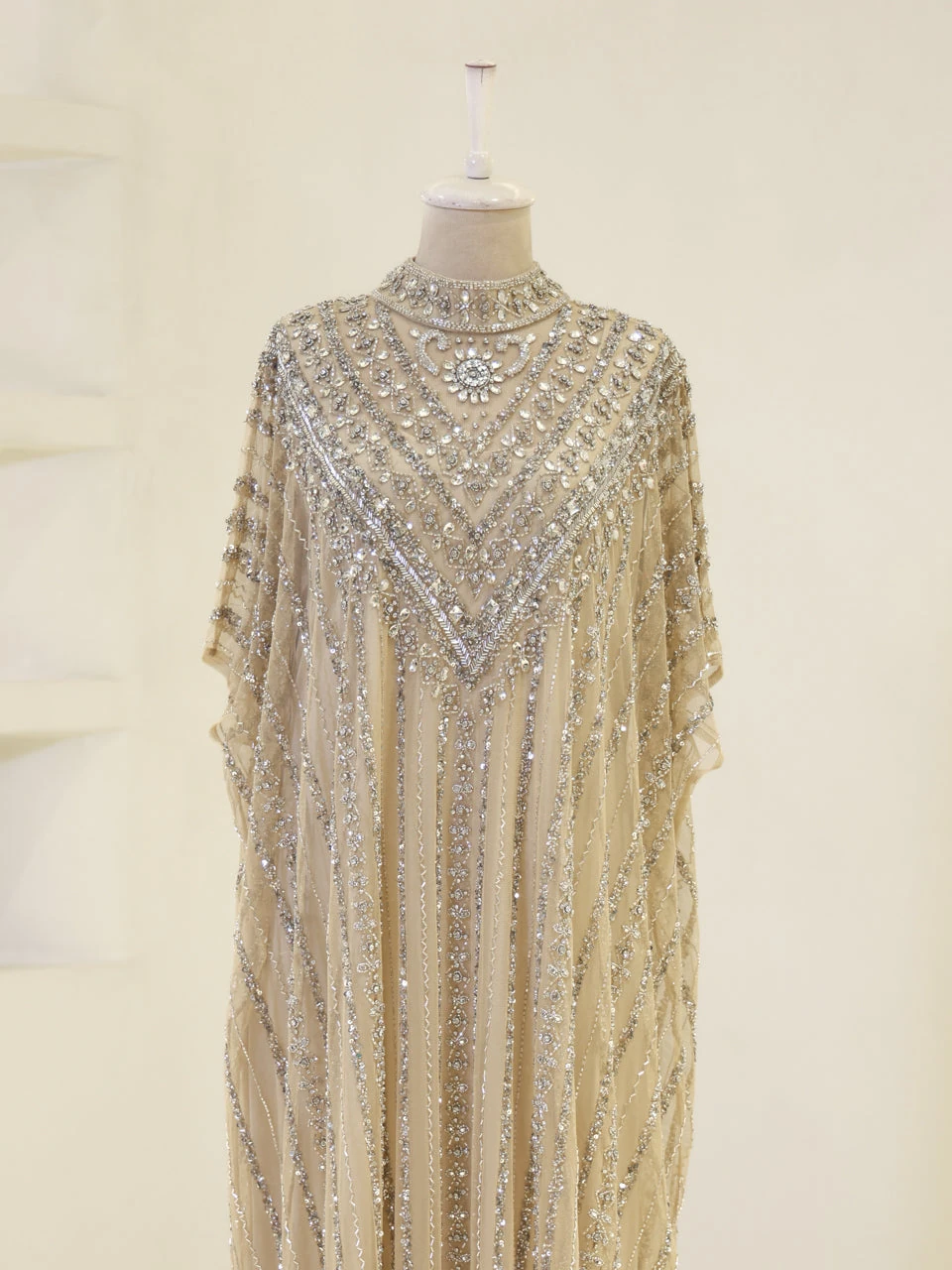 The Couture Isolde Evening Dress is designed with a standard fit and measures approximately 160 cm in length. Made from embroidered stretch fabric, the dress features a sleeveless inner layer and a batwing cape that is not detachable. It is fully lined and has a straight skirt design, offering both comfort and style.