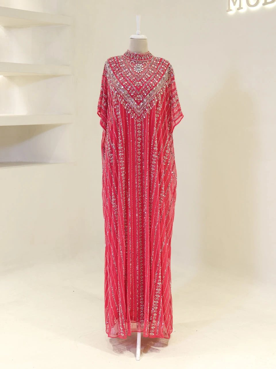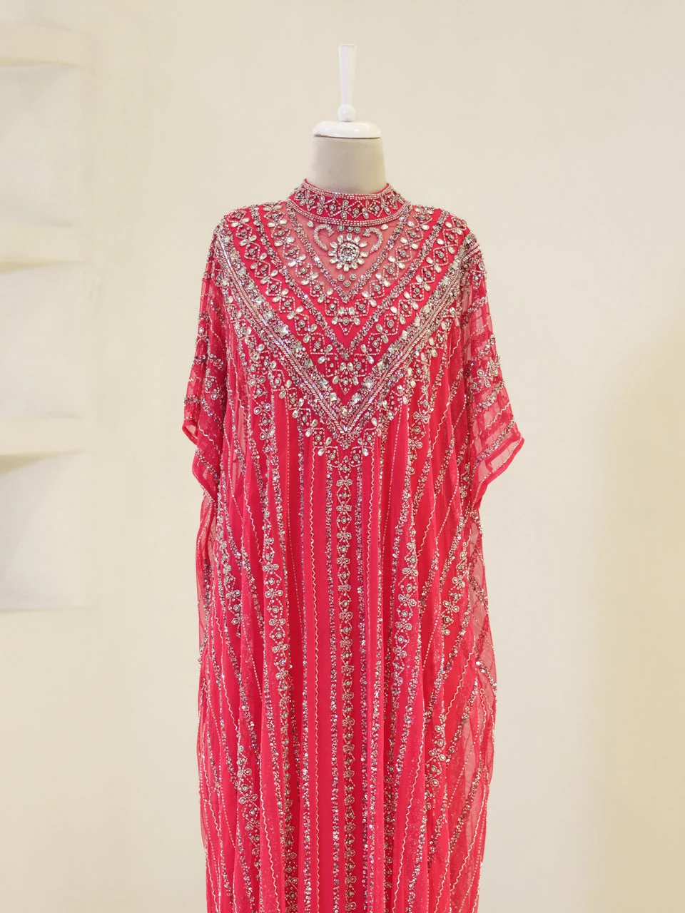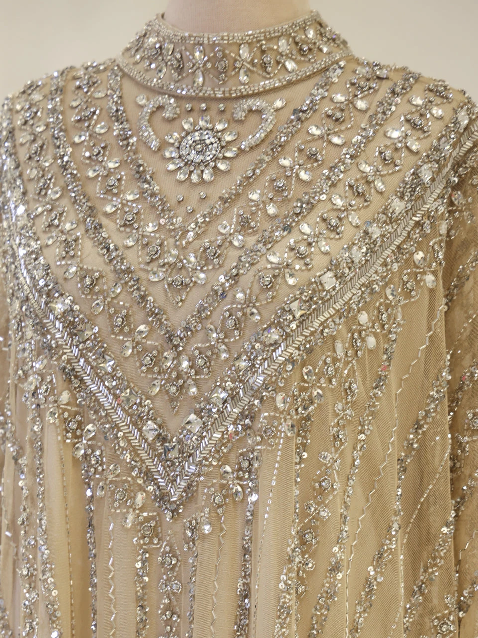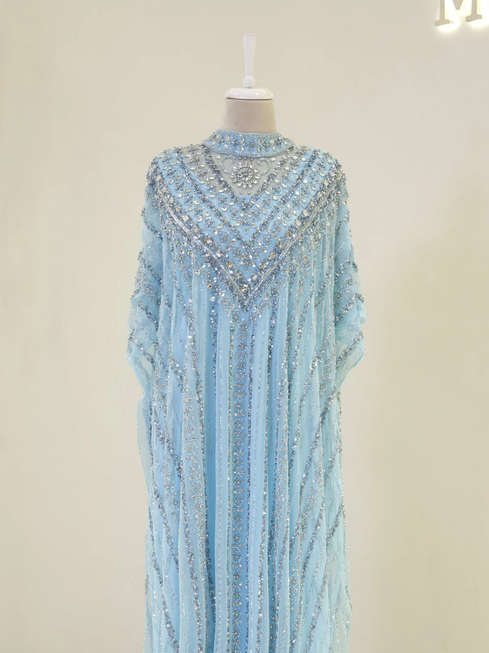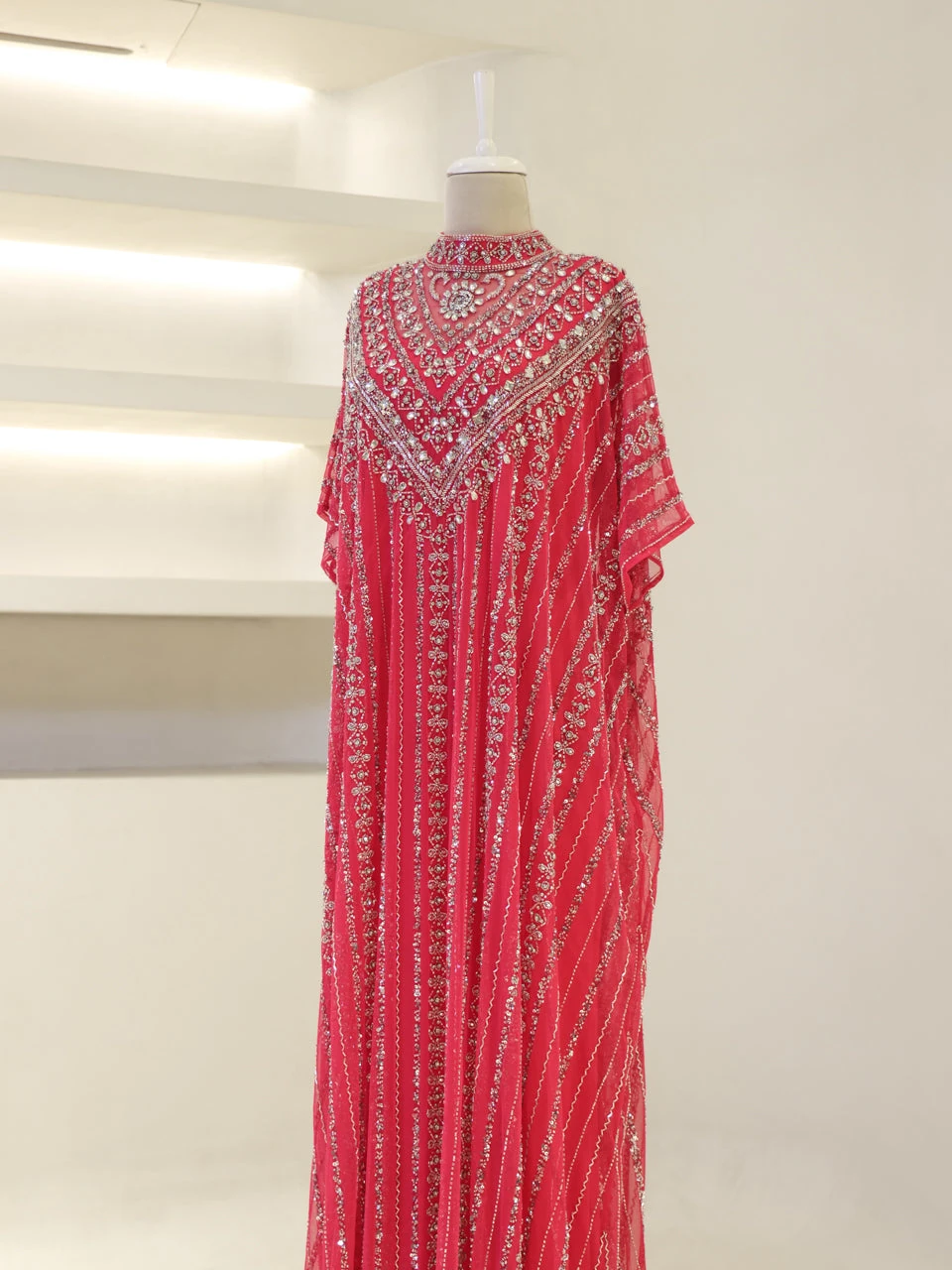 The Couture Isolde Evening Dress is designed with a standard fit and measures approximately 160 cm in length. Made from embroidered stretch fabric, the dress features a sleeveless inner layer and a batwing cape that is not detachable. It is fully lined and has a straight skirt design, offering both comfort and style.