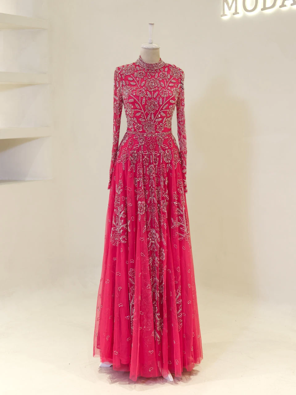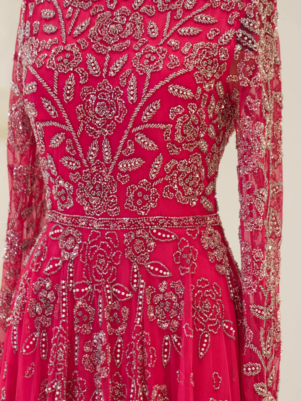 The Couture Lamiha Evening Dress is designed with precision to fit true to size, featuring an average length of 155 cm. The dress includes a train and is detailed with non-adhesive embellishments. It is fully lined and features a mandarin collar with a back zipper closure. The sleeves are transparent, and the skirt has a flared design. Note: Upon request, the transparent sleeve details can be covered. For more information on customization fees, please contact us via WhatsApp at +90 553 978 48 86.