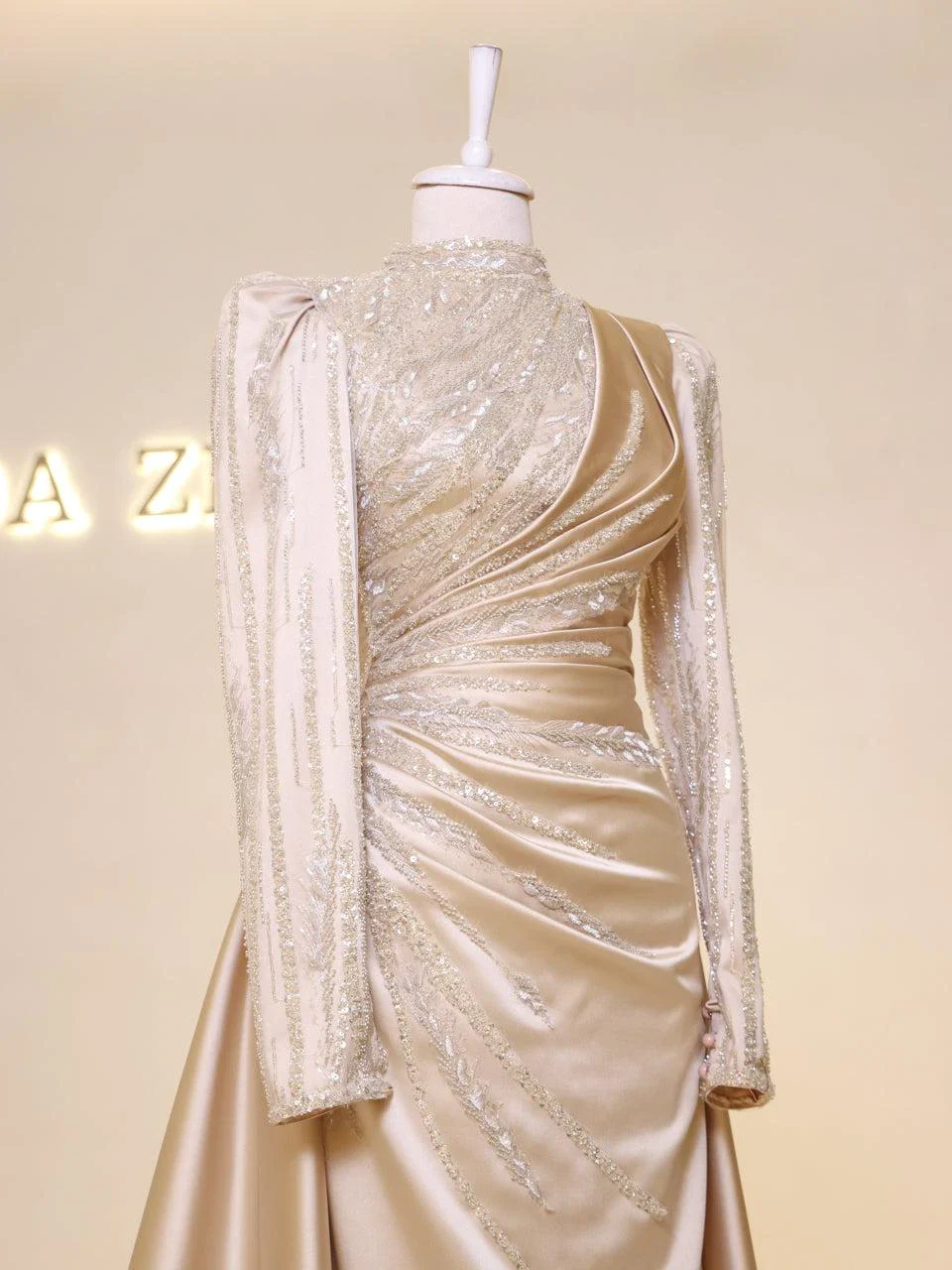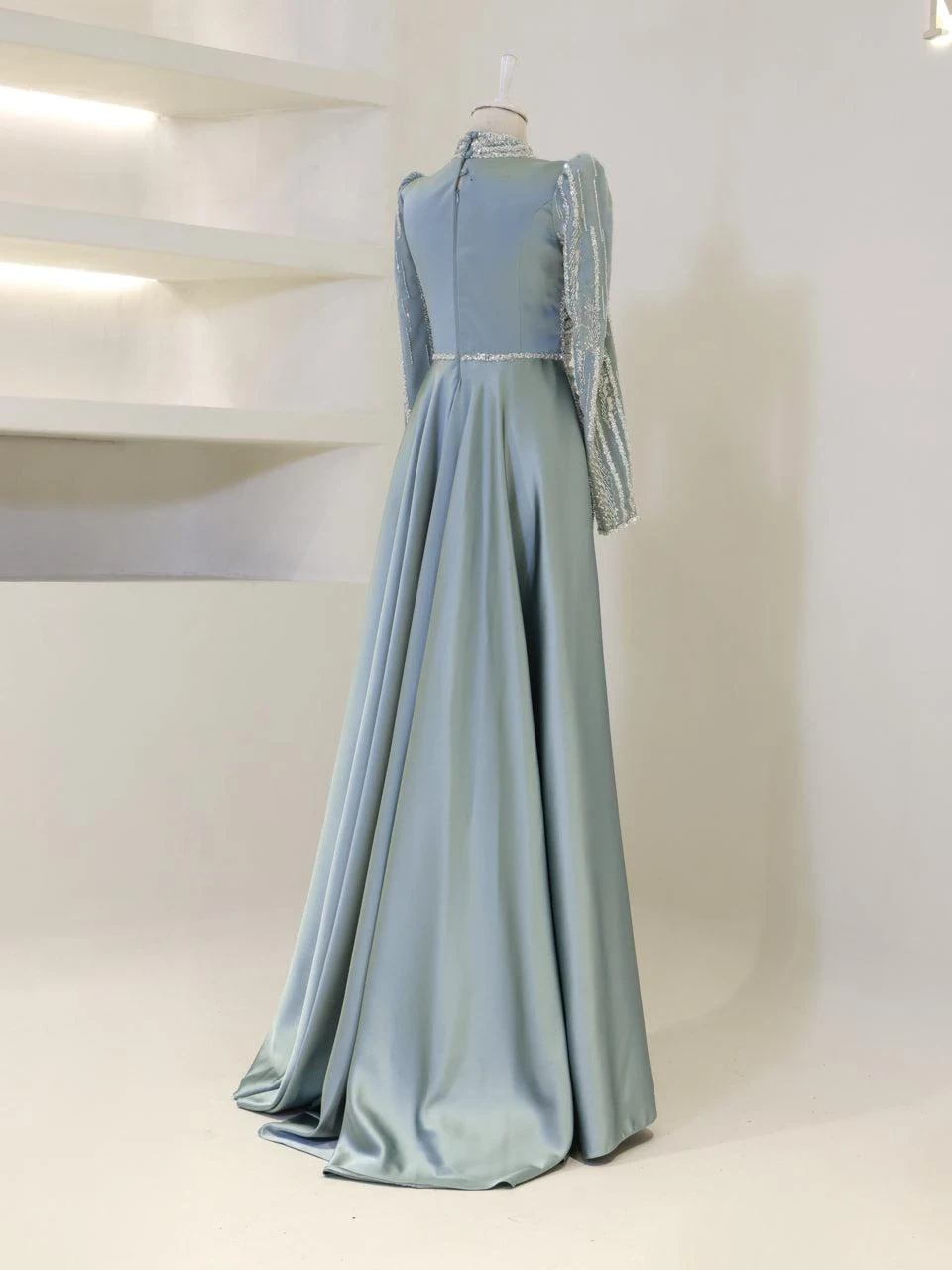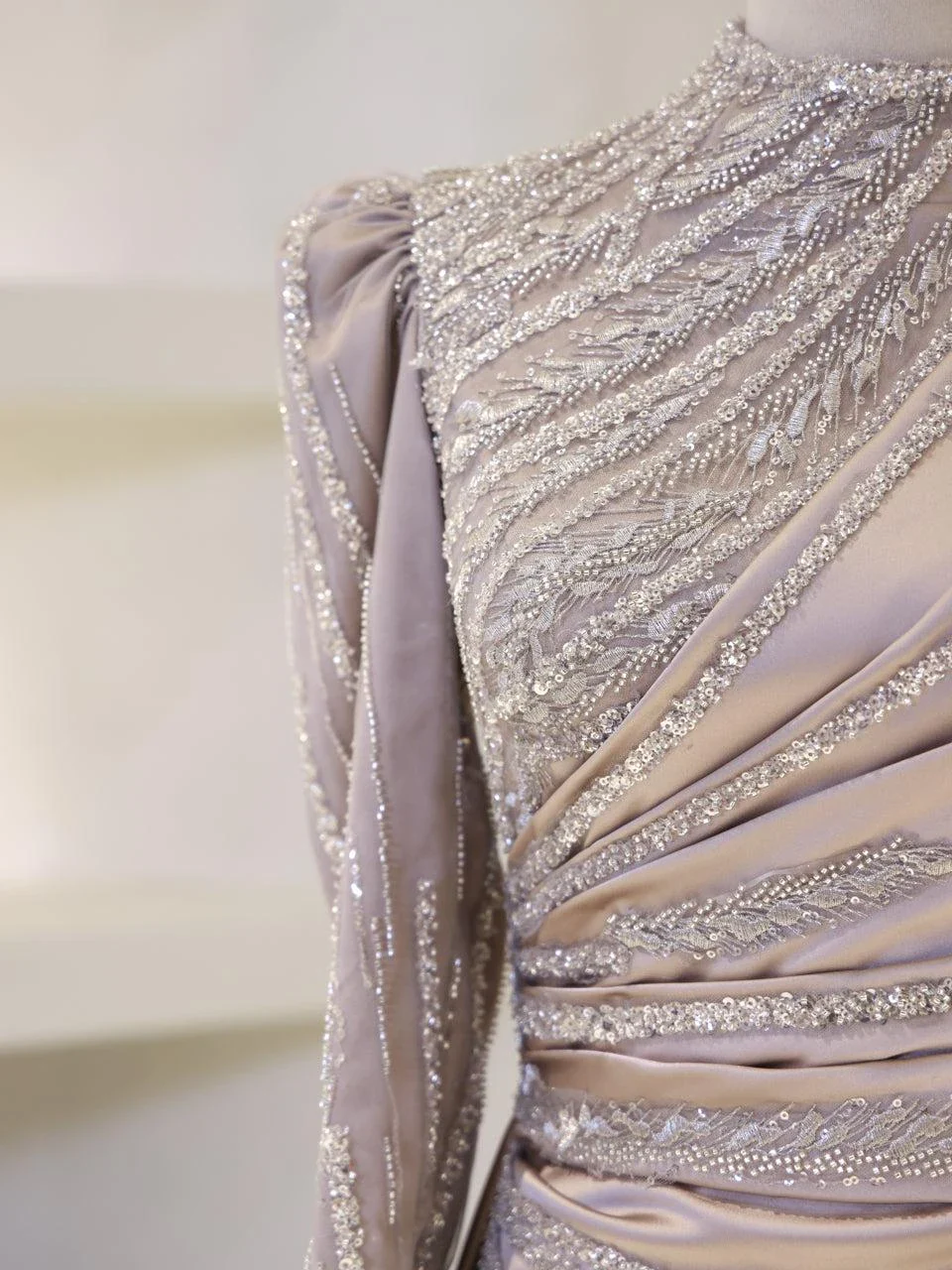 The Lavinia Modest Evening Dress is tailored to fit your measurements upon order. The average preparation time is 7-10 days. This special design features handcrafted embellishments. For detailed information and remote fitting, please contact us via WhatsApp at -. IMPORTANT: As sizes increase, minor changes in embellishments may occur in our custom-made models. NOTE: Due to adhesive embellishments, some shedding may occur, but it does not affect the overall appearance.