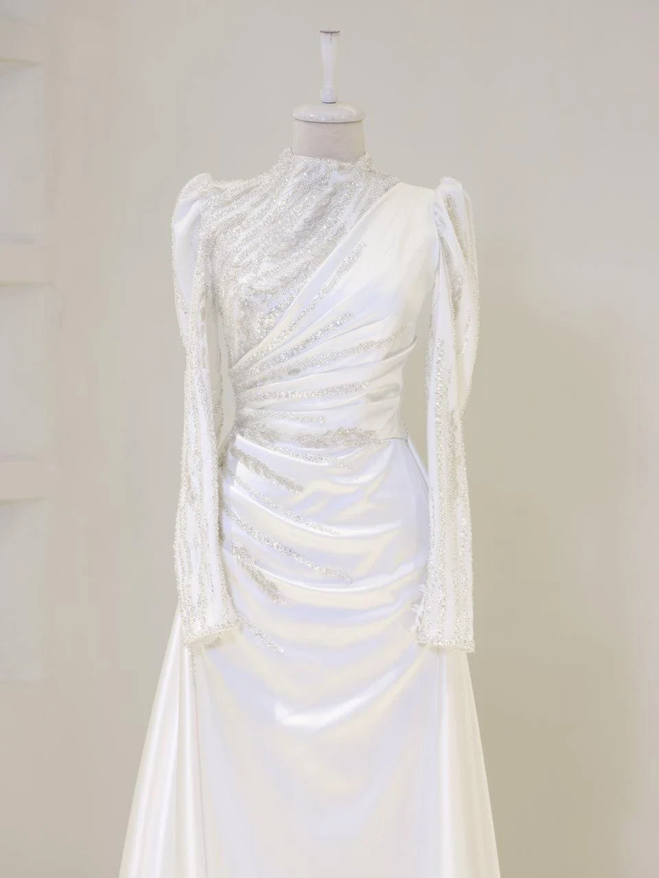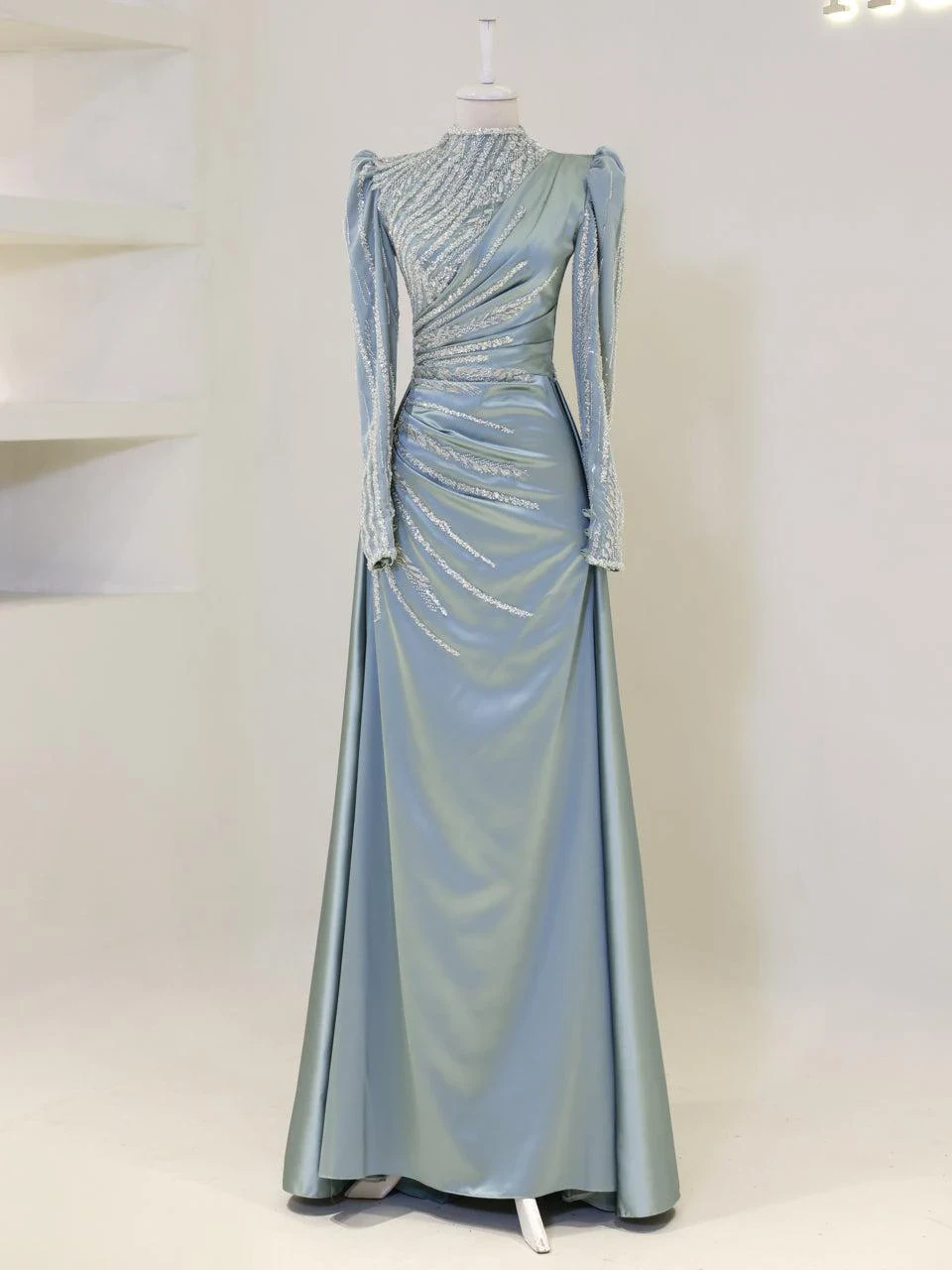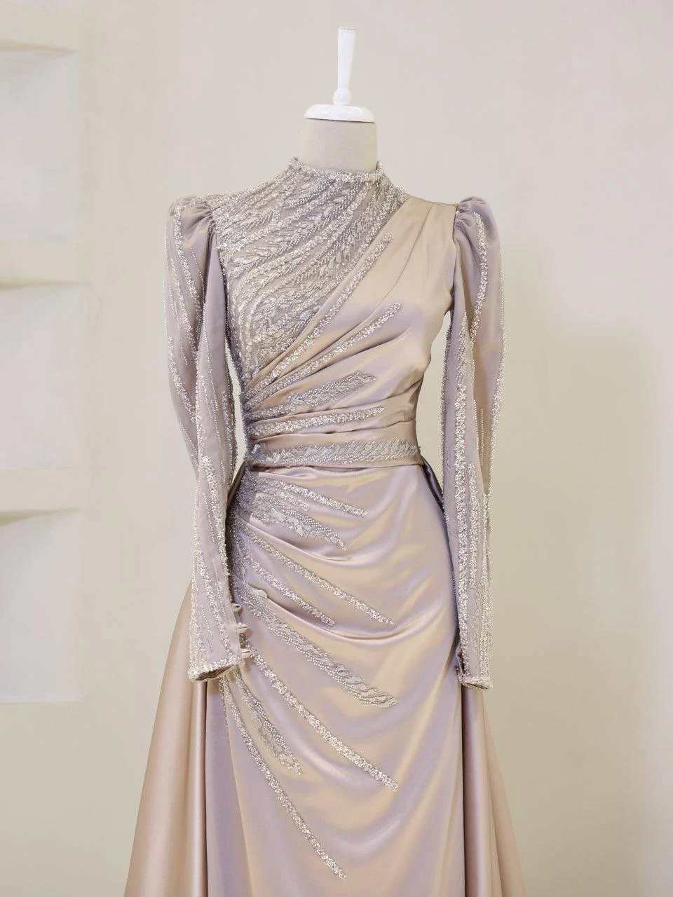 The Lavinia Modest Evening Dress is tailored to fit your measurements upon order. The average preparation time is 7-10 days. This special design features handcrafted embellishments. For detailed information and remote fitting, please contact us via WhatsApp at -. IMPORTANT: As sizes increase, minor changes in embellishments may occur in our custom-made models. NOTE: Due to adhesive embellishments, some shedding may occur, but it does not affect the overall appearance.