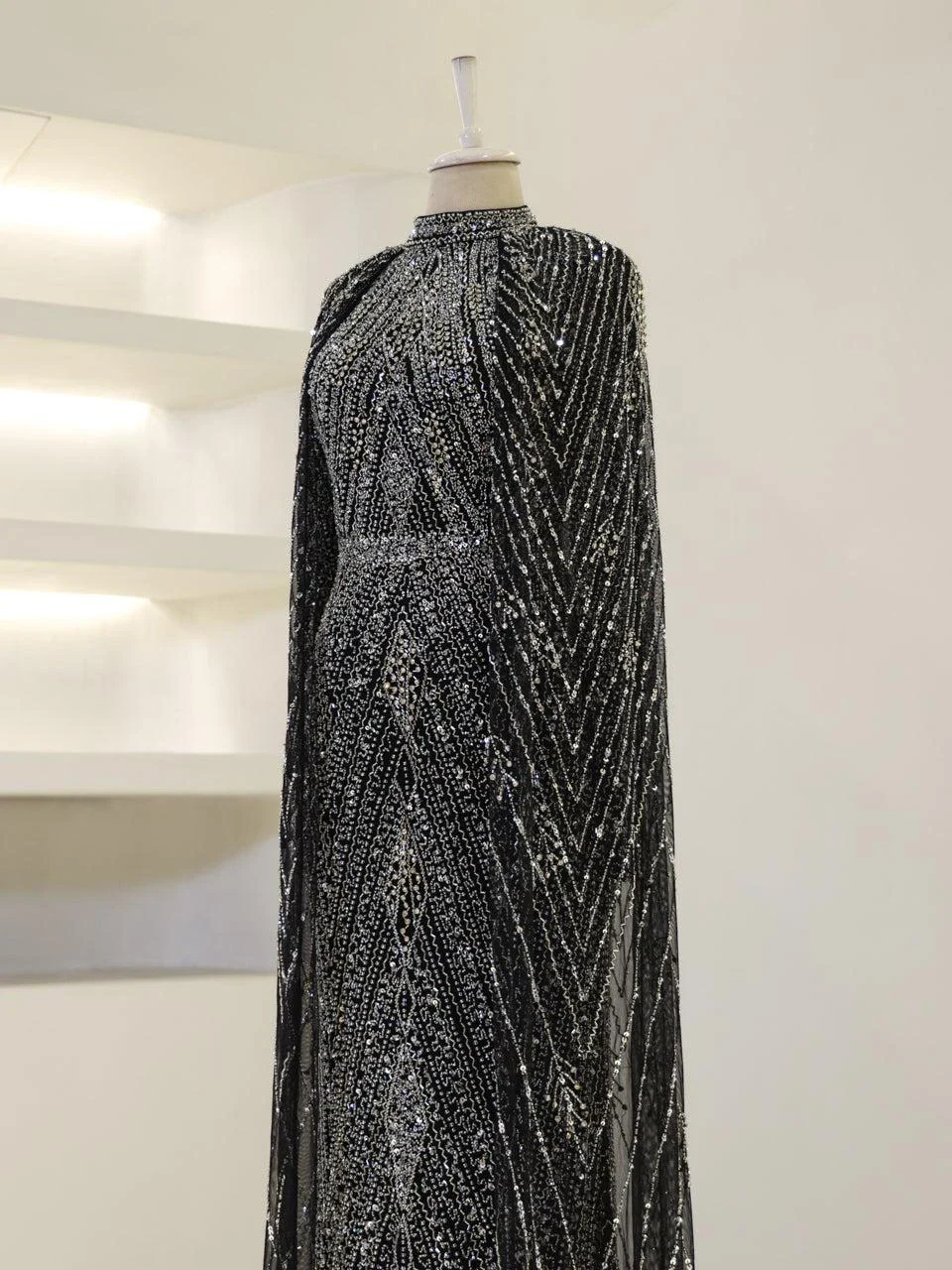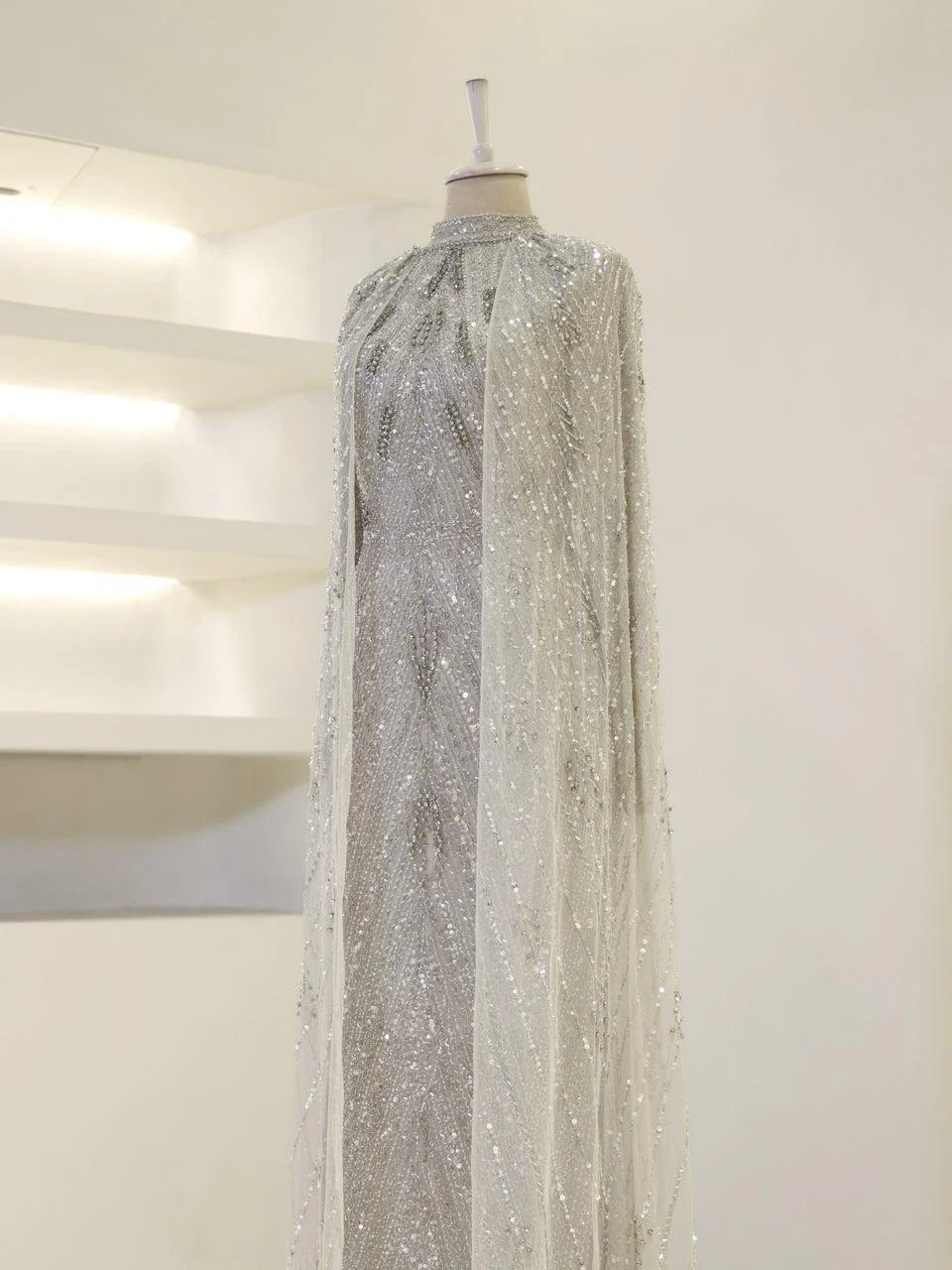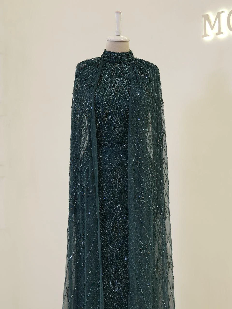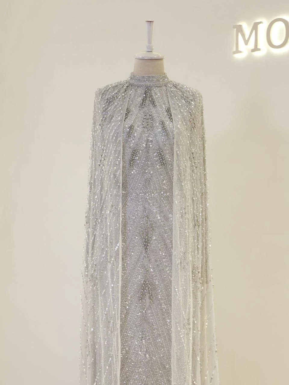 The Couture Leia Modest Evening Dress is designed with precision to fit true to size and features a length of 165 cm. Unlike other dresses, the embellishments are not glued but intricately crafted. The dress is lined for comfort and includes a back zipper for easy wear. It features a turtleneck design, and the sleeves are transparent, adding a touch of sophistication. The dress also includes a cape detail and has a pencil skirt form. Note: Upon request, the transparent sleeve details can be covered. For more information, please contact us via WhatsApp at +90 553 978 48 86.