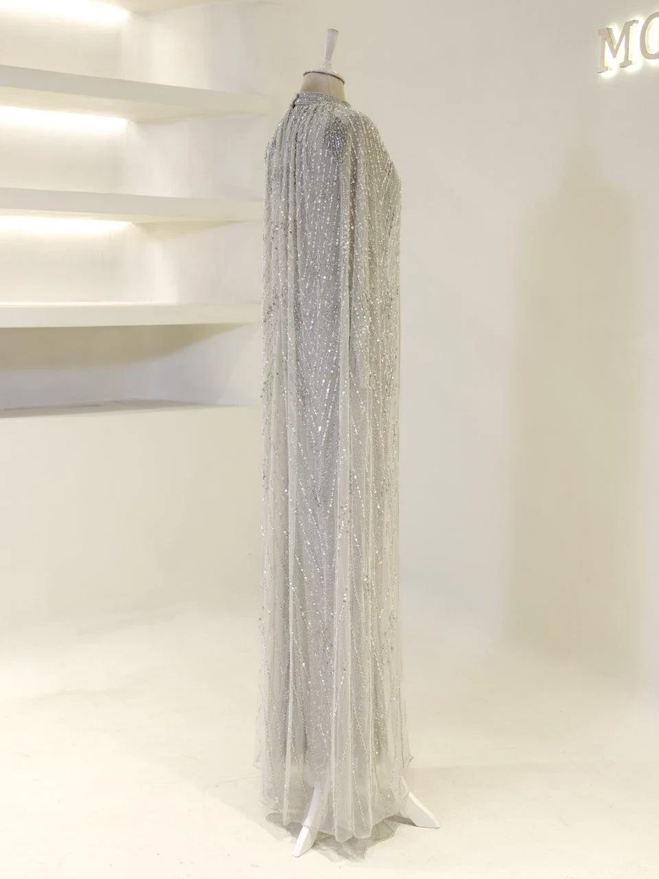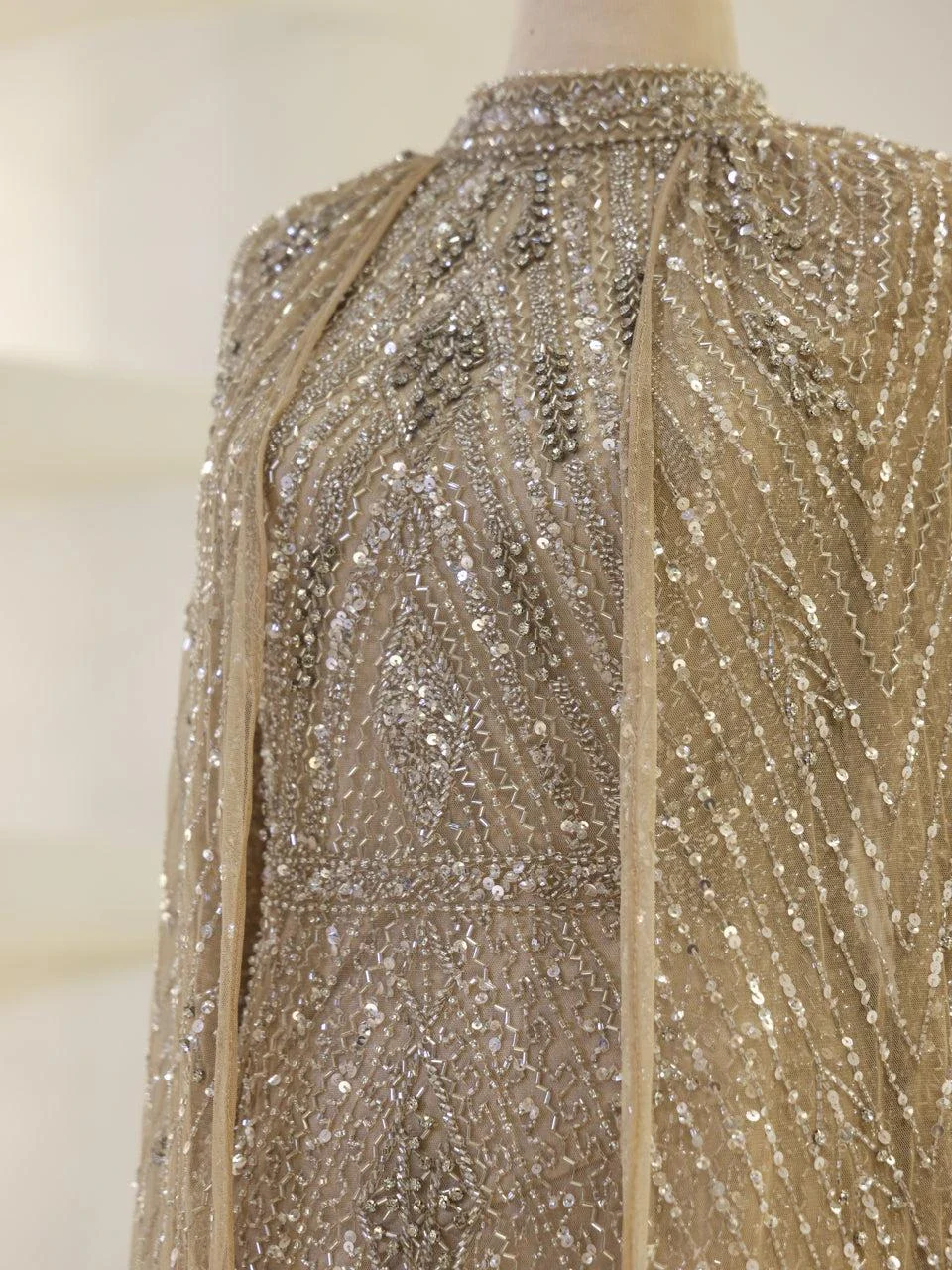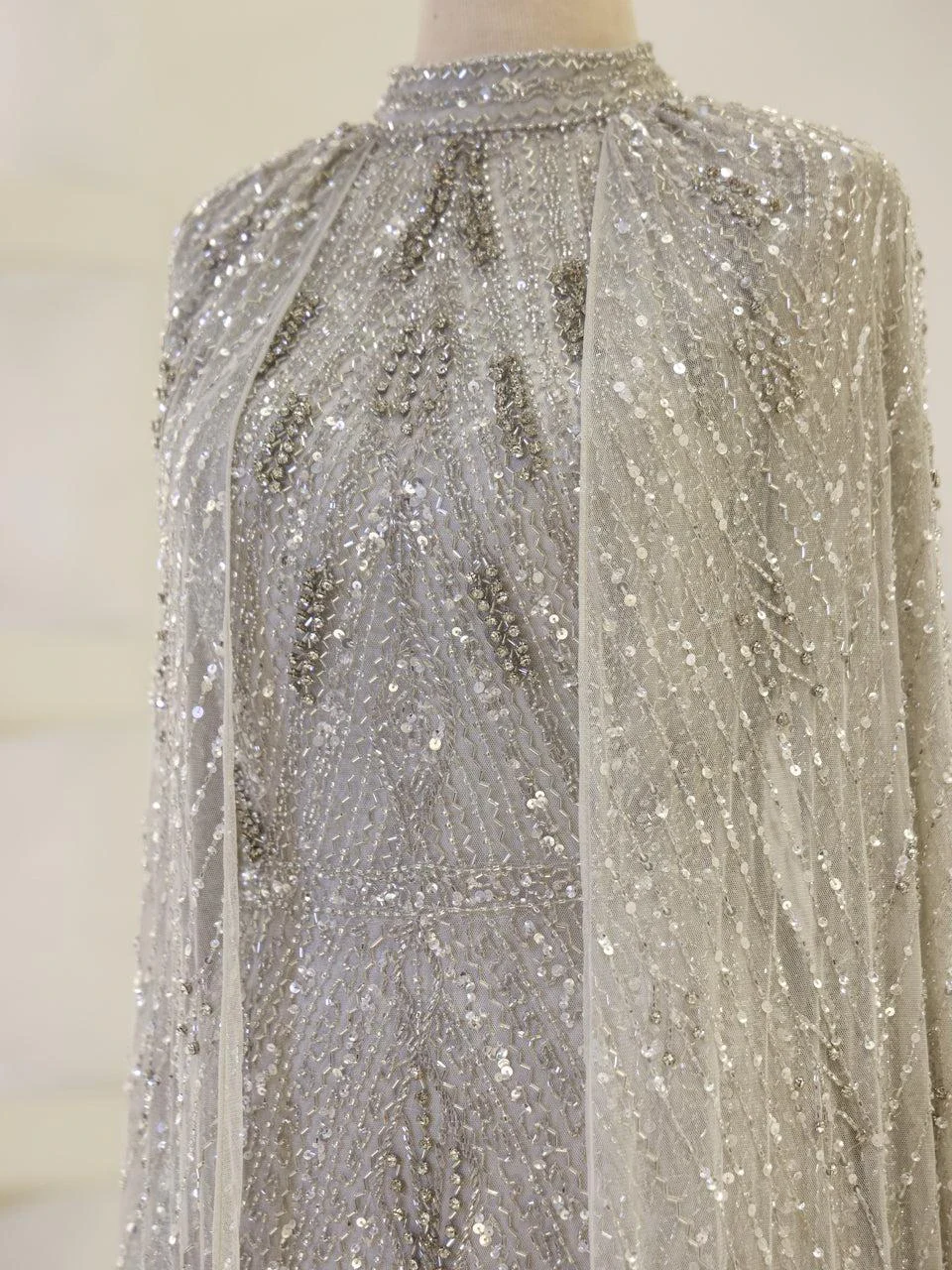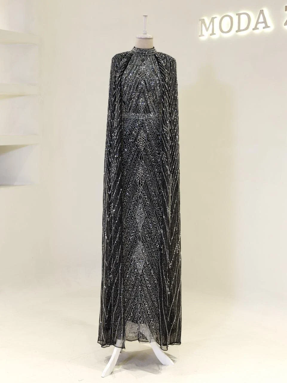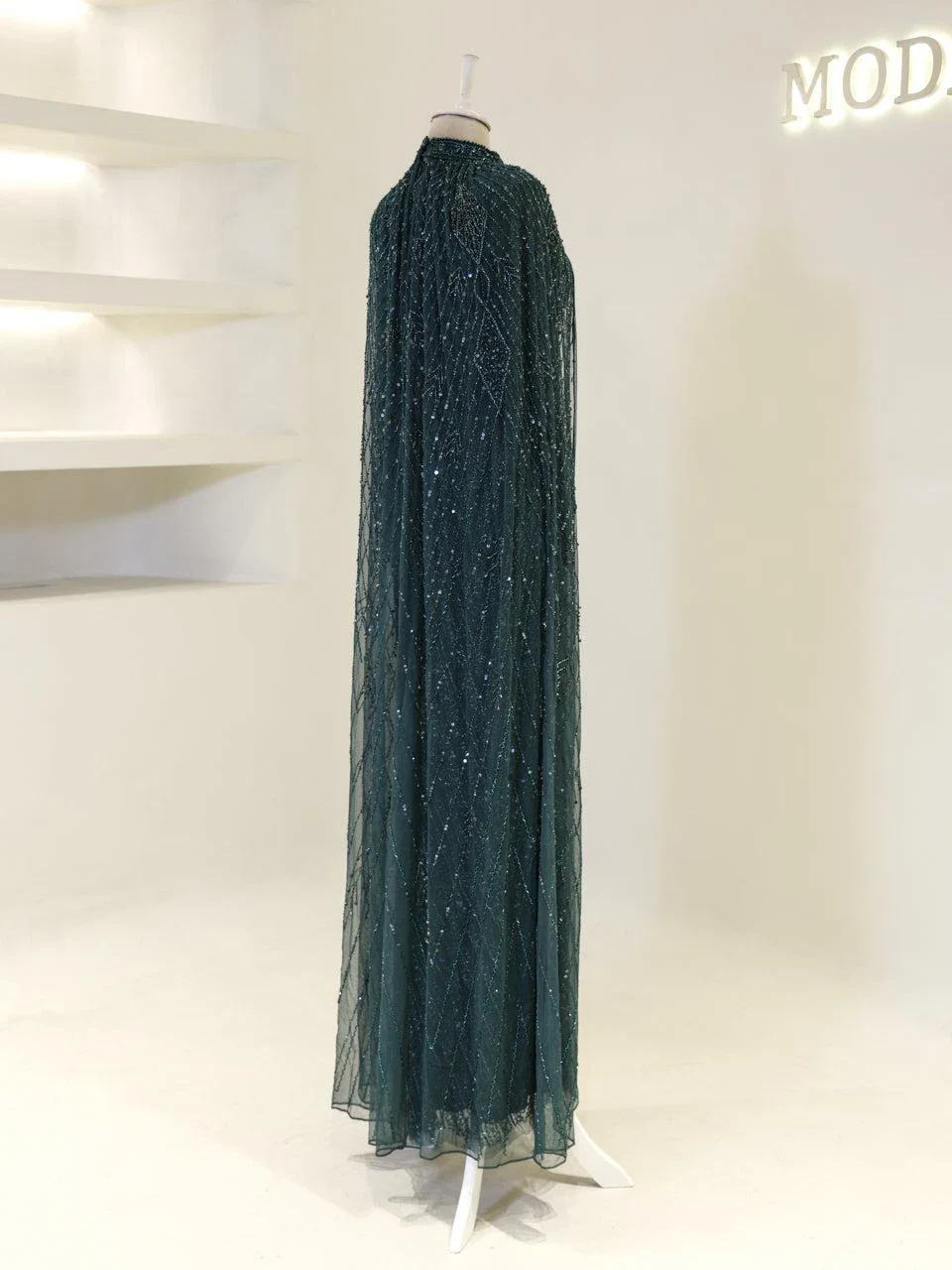 The Couture Leia Modest Evening Dress is designed with precision to fit true to size and features a length of 165 cm. Unlike other dresses, the embellishments are not glued but intricately crafted. The dress is lined for comfort and includes a back zipper for easy wear. It features a turtleneck design, and the sleeves are transparent, adding a touch of sophistication. The dress also includes a cape detail and has a pencil skirt form. Note: Upon request, the transparent sleeve details can be covered. For more information, please contact us via WhatsApp at +90 553 978 48 86.