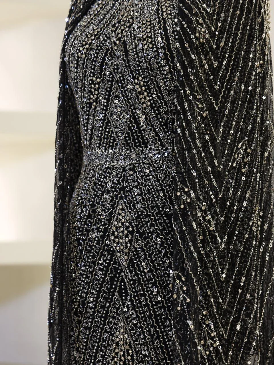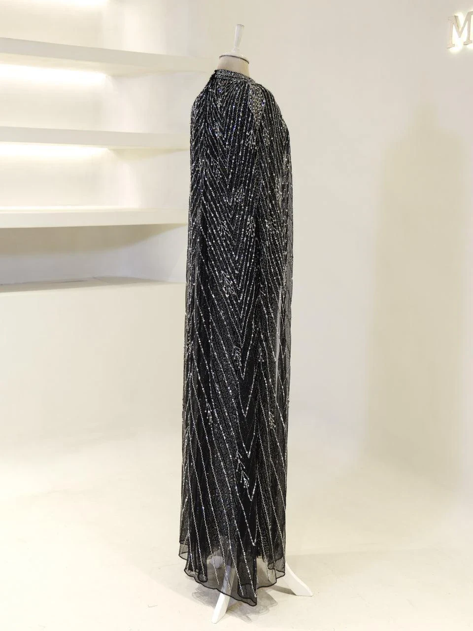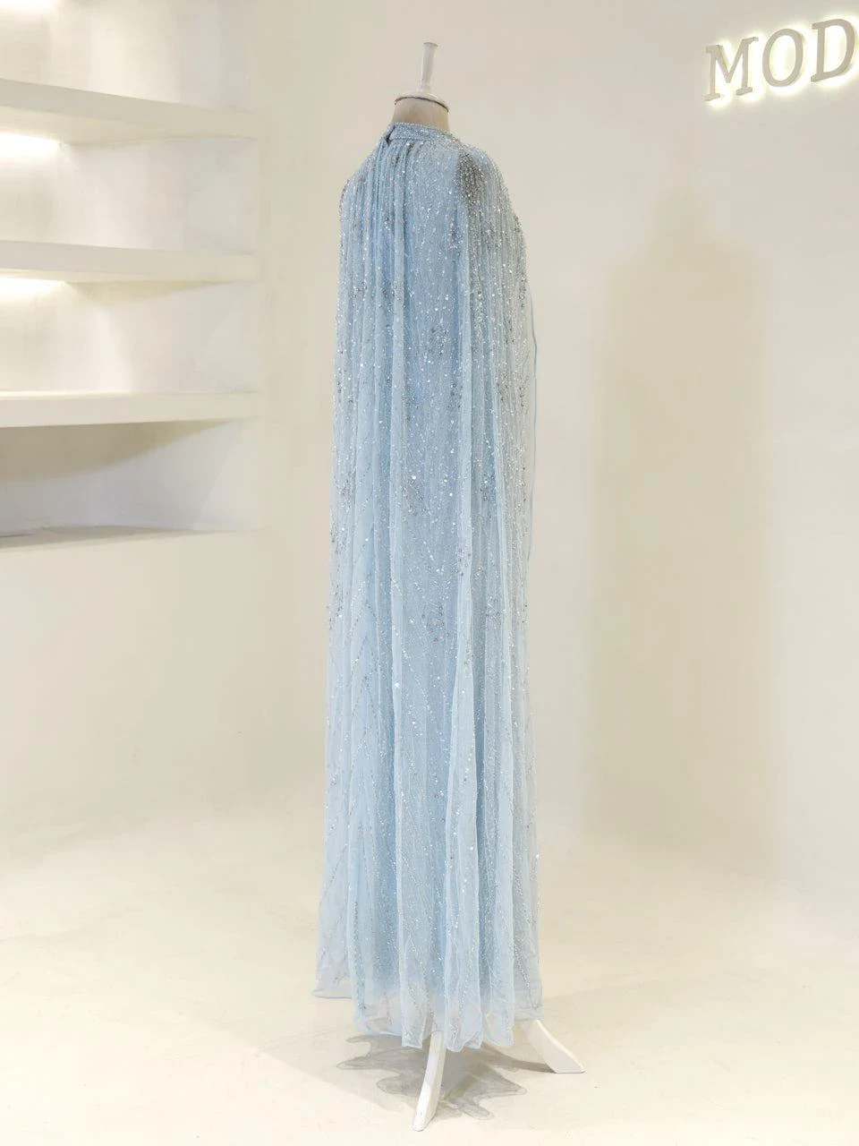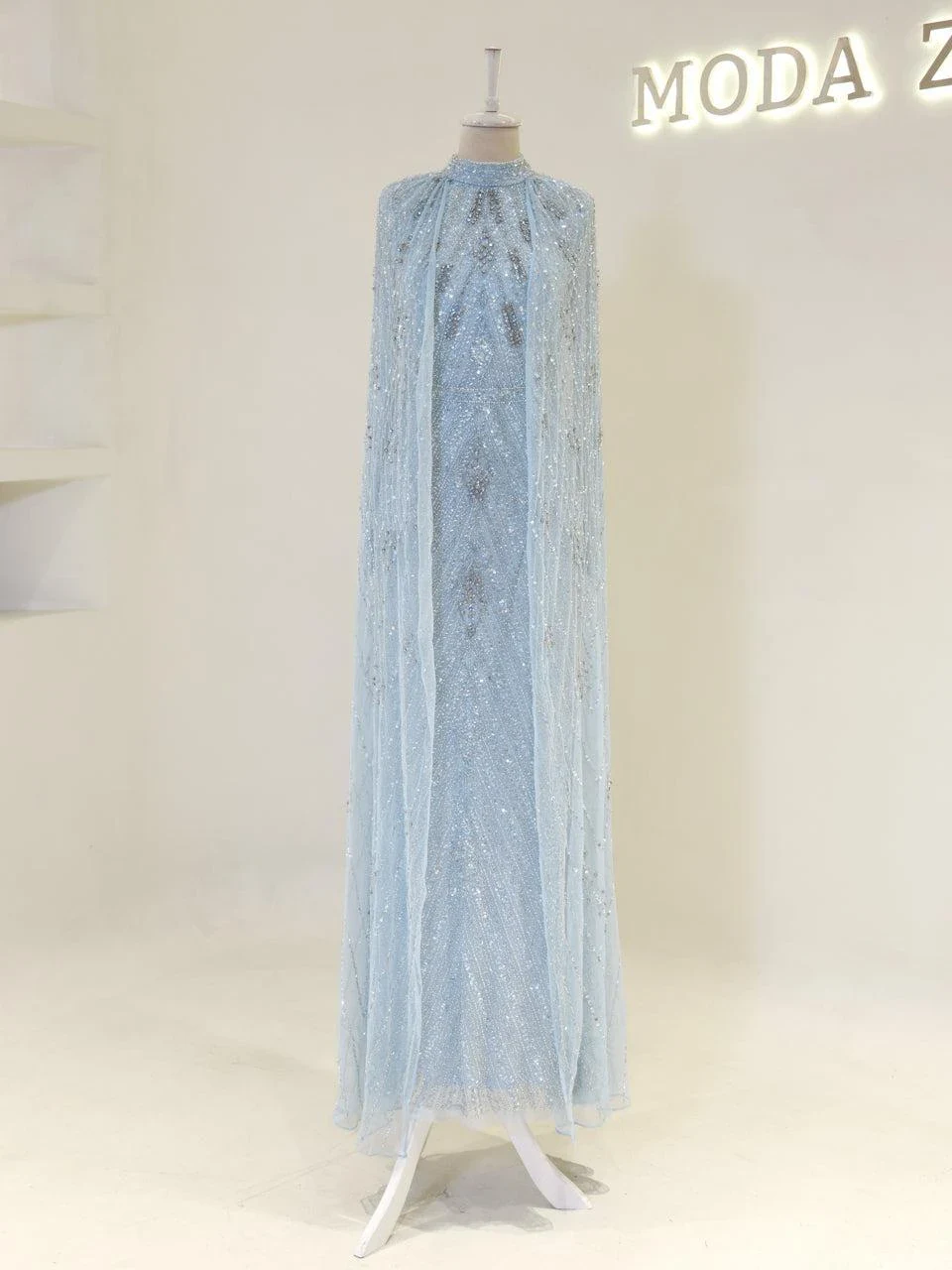 The Couture Leia Modest Evening Dress is designed with precision to fit true to size and features a length of 165 cm. Unlike other dresses, the embellishments are not glued but intricately crafted. The dress is lined for comfort and includes a back zipper for easy wear. It features a turtleneck design, and the sleeves are transparent, adding a touch of sophistication. The dress also includes a cape detail and has a pencil skirt form. Note: Upon request, the transparent sleeve details can be covered. For more information, please contact us via WhatsApp at +90 553 978 48 86.