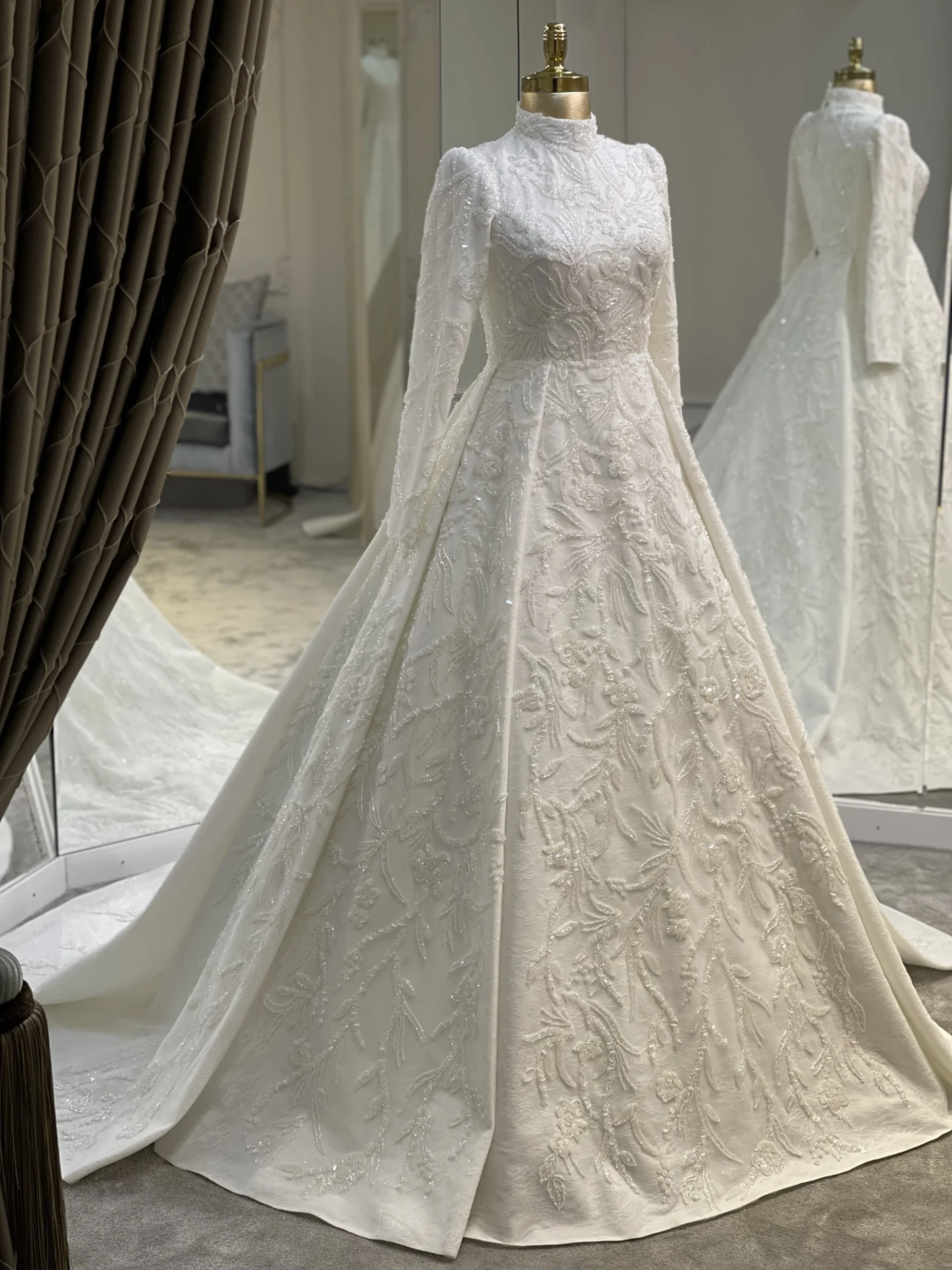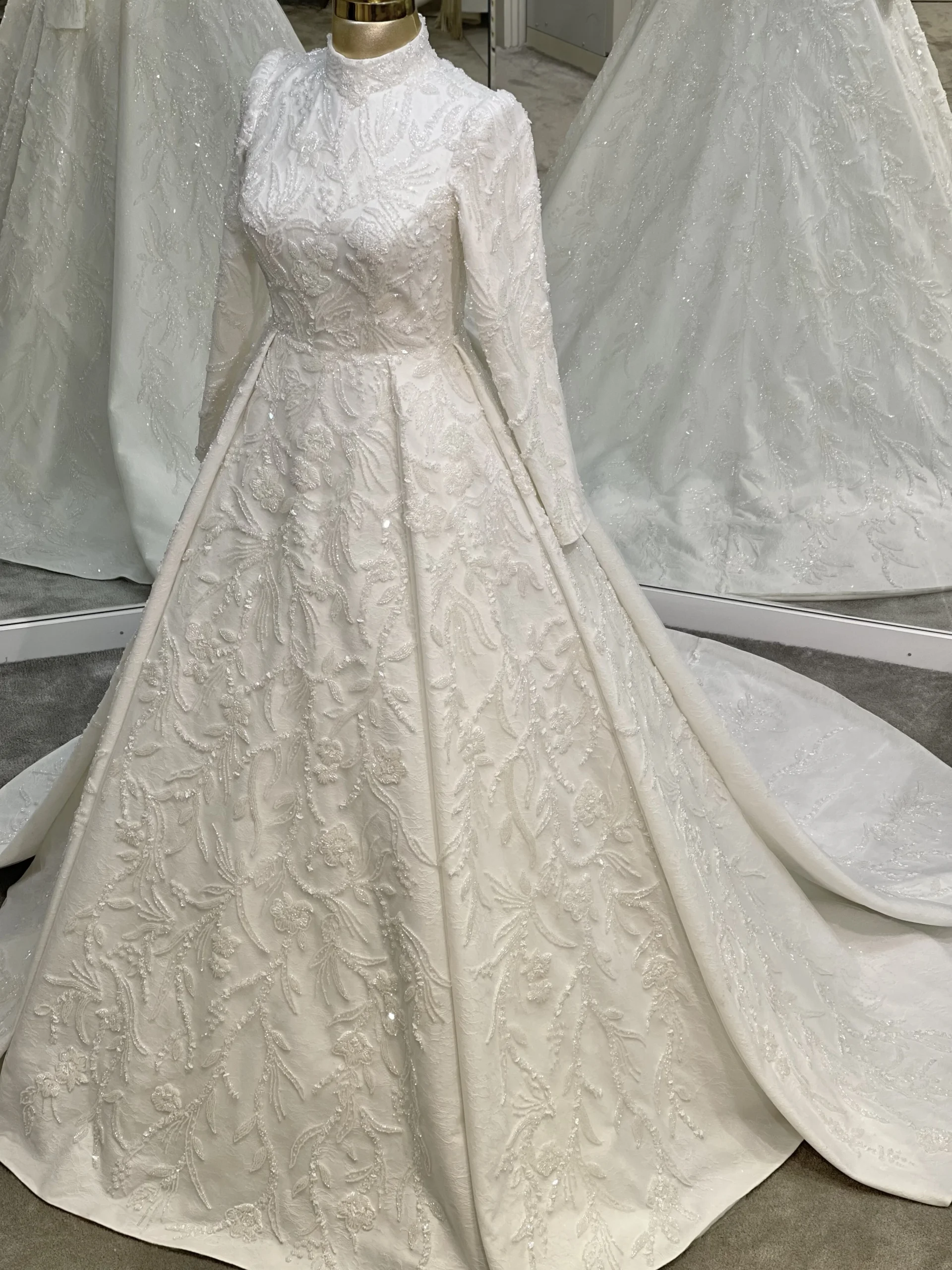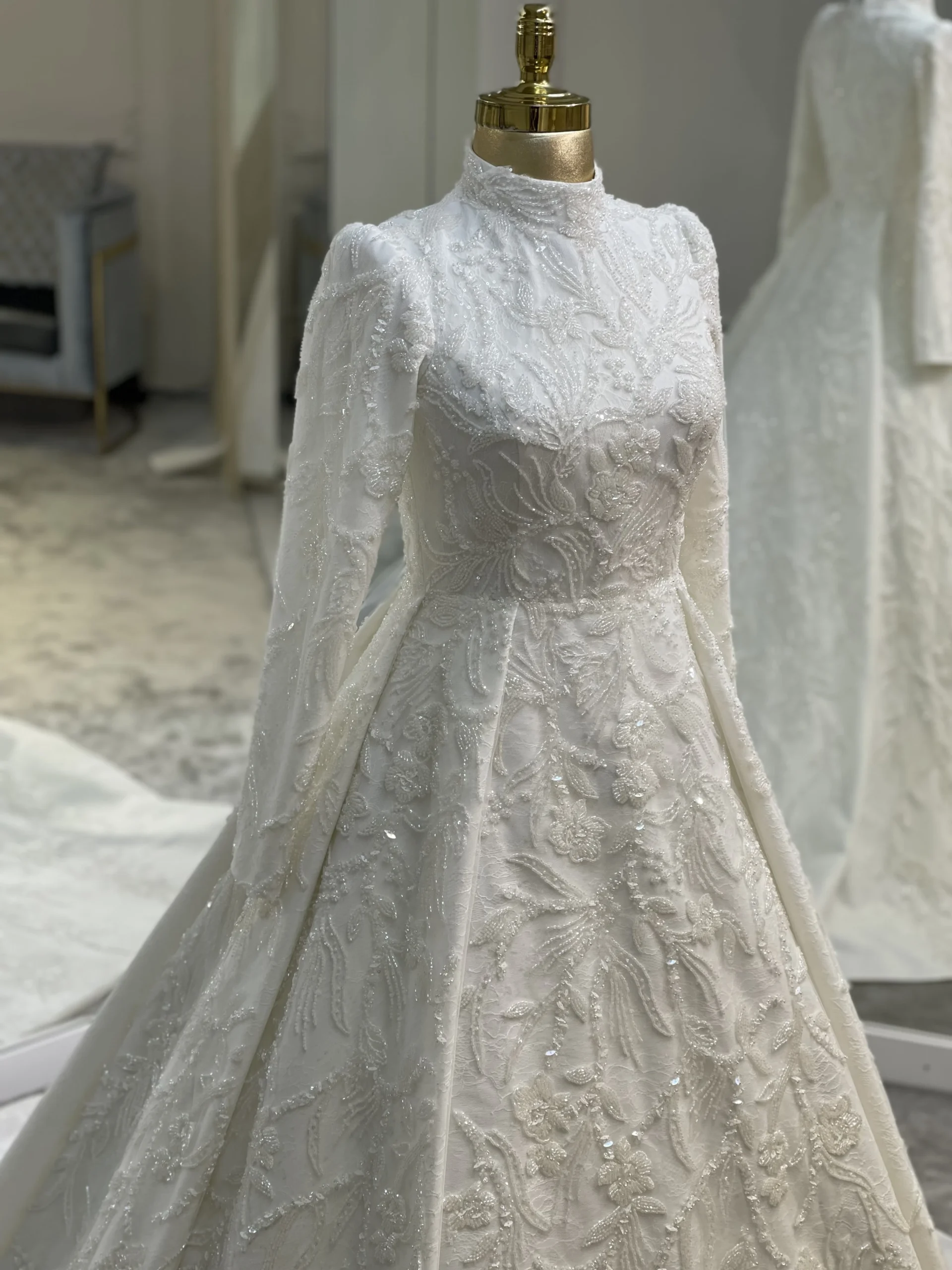 The Couture Lezli Modest Wedding Dress is a custom-made garment tailored specifically to your measurements, ensuring a perfect fit. The average preparation time for this dress is 20-25 days. This special design features handcrafted embellishments, adding a unique touch to your wedding attire. Upon request, a veil can be added to complete the look. Please contact the provided number for pricing information. For detailed information and remote fitting services, reach out to us via our WhatsApp line at -. IMPORTANT: As the size increases, slight changes in the embellishments may occur due to the nature of custom tailoring.
