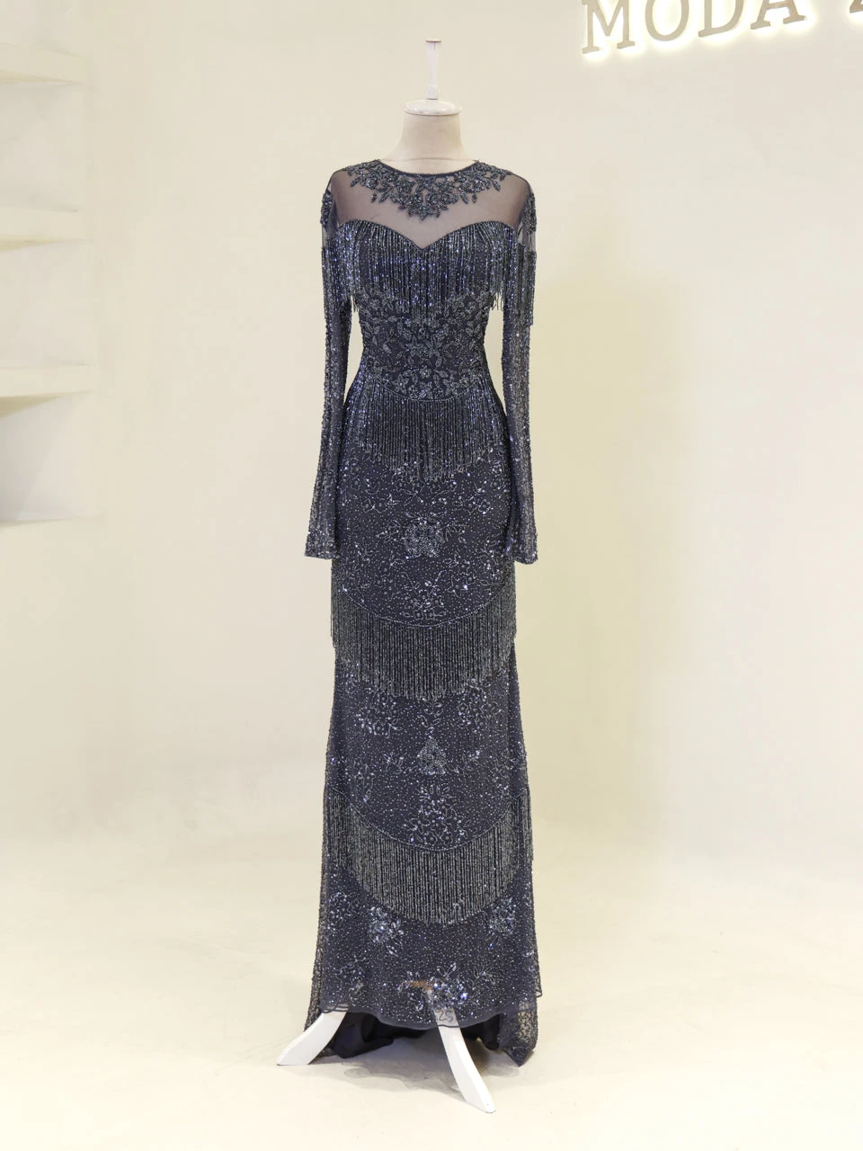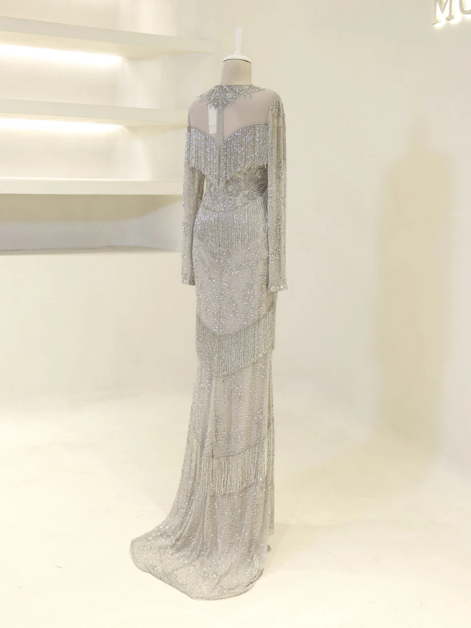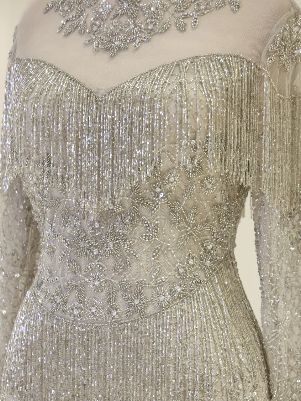 The Couture Lorienne Evening Dress is designed with a fitted silhouette and an average length of 165 cm. It features a train and is fully lined for comfort. The dress is secured with a zipper at the back. Unlike glued embellishments, the details are intricately sewn. The sleeves, chest, and back sections are transparent, adding a touch of sophistication. The pencil skirt form and flexible structure ensure a comfortable fit. Note: Upon request, the transparent details on the sleeves, chest, and back can be covered. For pricing and further information, please contact us via WhatsApp at +90 553 978 48 86.