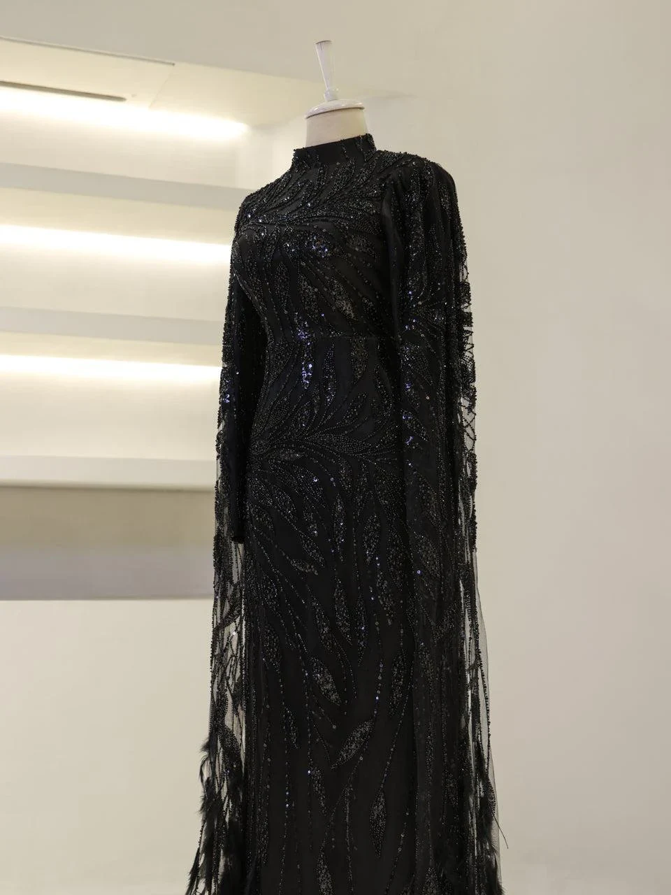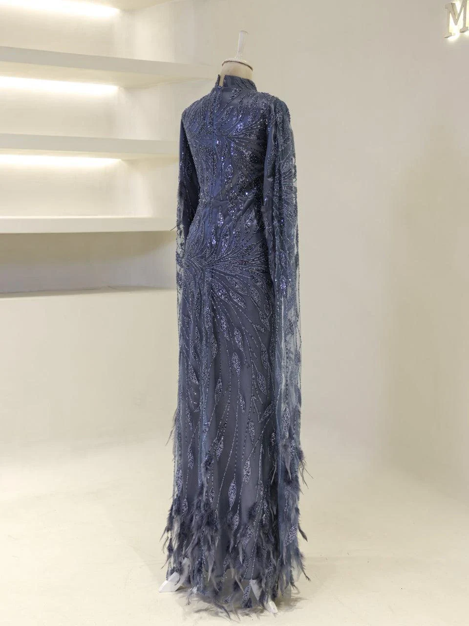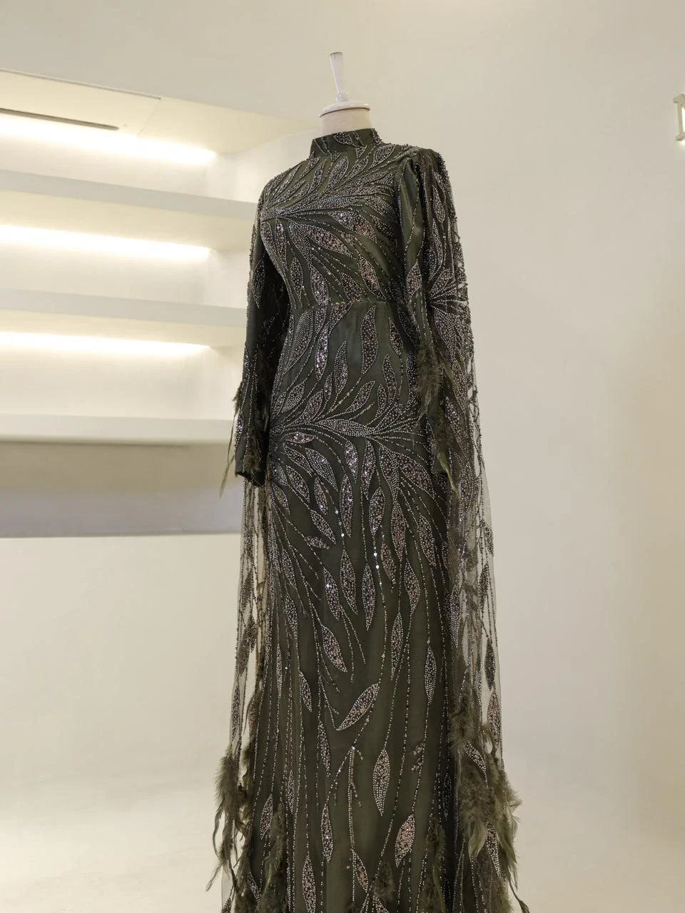 The Couture Lumira modest evening dress is designed with precision and elegance. Made from tulle fabric, it features a high neckline and a cape detail that extends from the shoulders to the hem. The dress has a straight skirt form and is approximately 160 cm in length. It is equipped with a back zipper for easy wear. The embellishments on the dress are not glued, ensuring durability. The dress is fully lined for comfort.